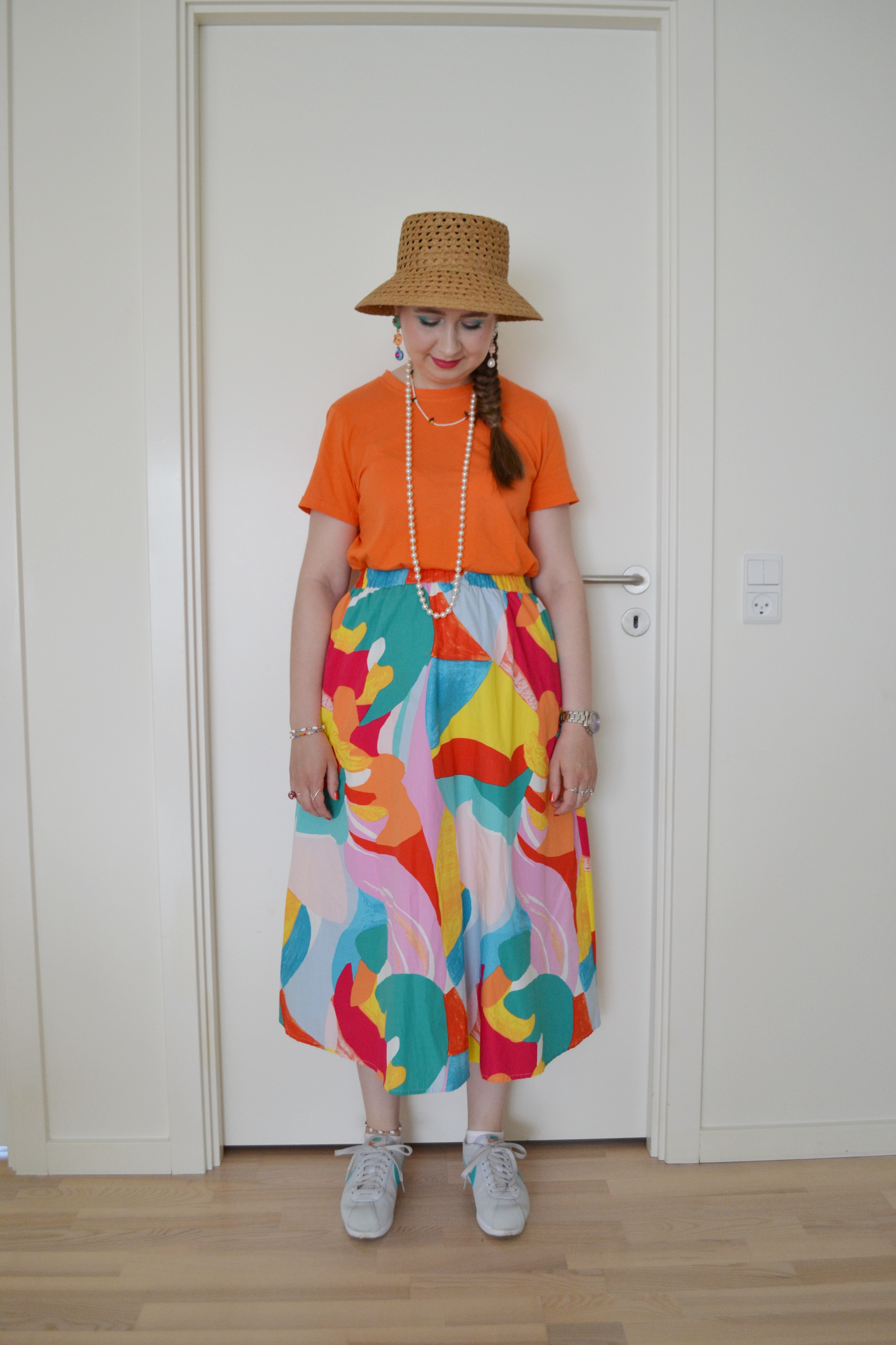 Here’s what I wore Wednesday July 24. My boyfriend and I took our daughter to the zoo for the first time, and it was a warm, sunny day, so I wore something comfy and colourful. A hat was a must as well.