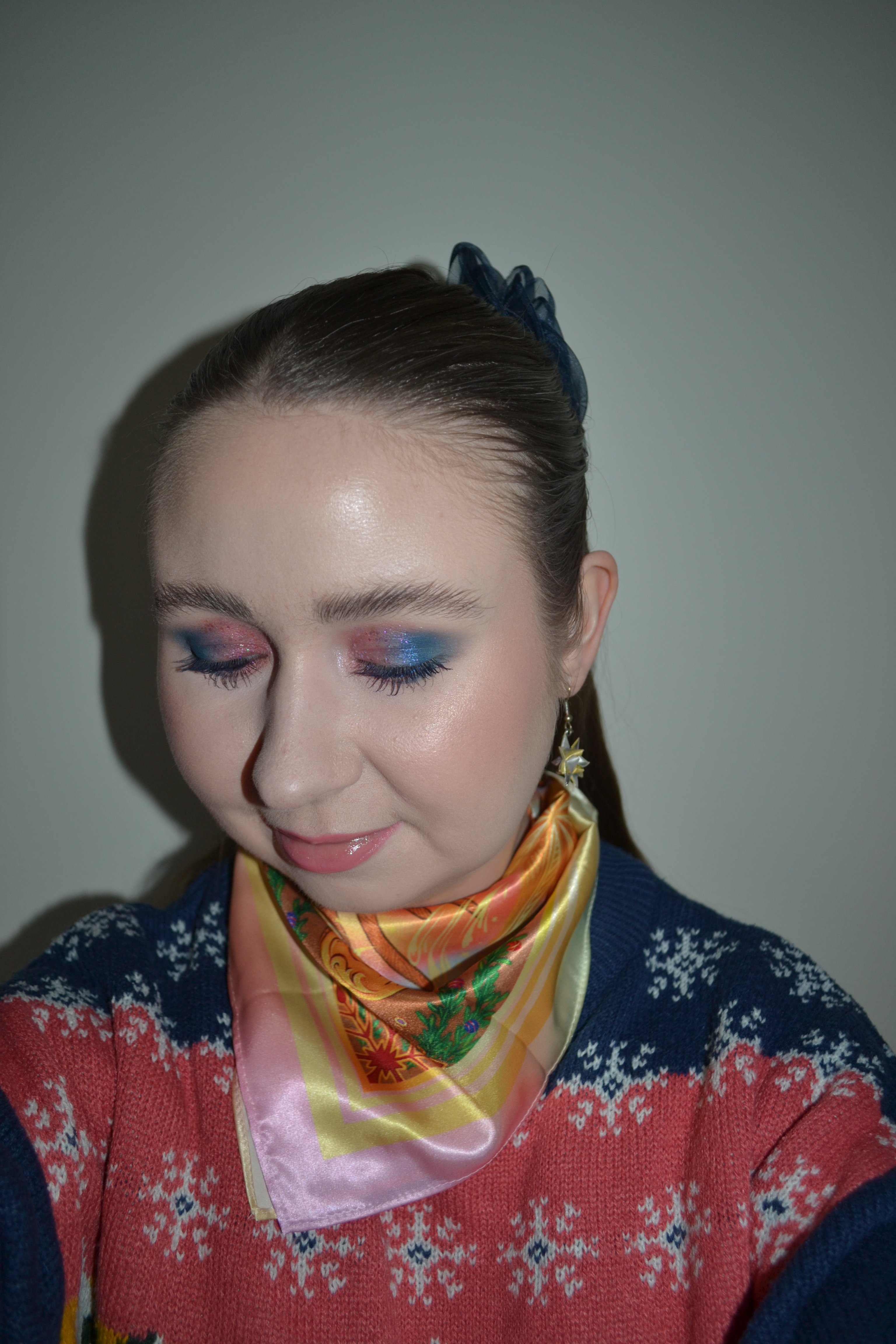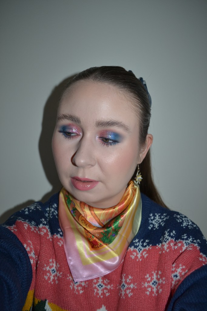 (Base: primers – Essence Catching Clouds Cloud-touch Mousse Primer in 01 Up On Cloud + L’Oréal Glotion natural glow enhancer (shade: 901 Fair Glow), foundation – e.l.f. Cosmetics Soft Glam satin foundation (shade: 13 Fair Neutral), concealers – e.l.f. Cosmetics Putty Color-Correcting Eye Brightener (shade: Fair) + Huda Beauty #FAUXFILTER Luminous Matte liquid concealer (shade: 1.3G Marshmellow), powders – Essence Harley Quinn Pink loose setting powder in 01 Harley Vibes + Rare Beauty Always An Optimist Soft Radiance setting powder in Light. Face make-up: bronzer + blusher + highlighter – MAC Shiny Pretty Things Face Compact Fair (shades: Extra Dimension bronzer in Five-Alarm Kiss + Extra Dimension blush in Sweater Weather + Extra Dimension skinfinish in String Lights). Eye make-up: base – MAC Pro Longwear Paint Pot in Painterly, eyeshadows – Essence eyeshadow in 20 Cream + Catrice Magic Christmas Story eyeshadow palette in C01 The Nutcracker (shades: 5 + 6 + 8 + 9) + MAC Extra Dimension foil eyeshadow in Cooler Than Being Cool + Colourpop The Muppets Glitterally Obsessed glitter gel in It’s Moi, mascara – Kiko Milano Smart Colour mascara in 07 Navy Blue, eyeliner – Colourpop Crème gel liner in Ventura Blvd (multi-chrome). Eyebrows: MAC Shape + Shade brow tint in Taupe + Anastasia Beverly Hills Brow Freeze. Lips: Colourpop Barbie Lippie pencil in Dreamhouse + Colourpop Frosty the Snowman So Juicy plumping gloss balm in Frozen)