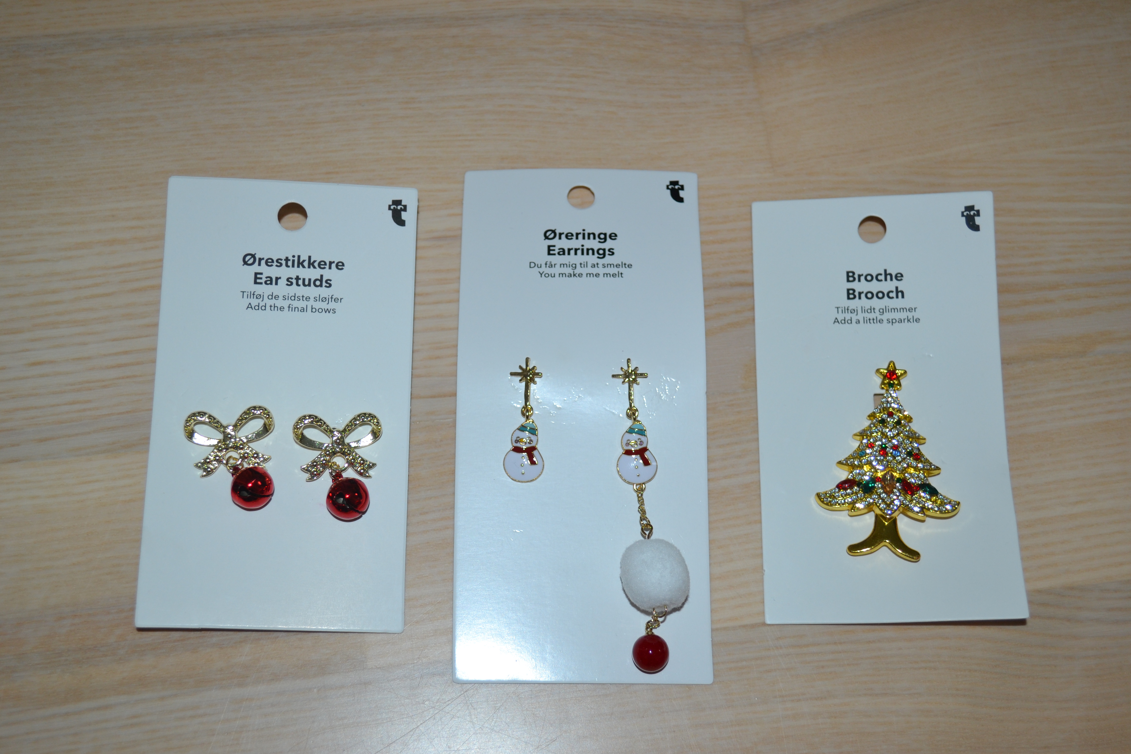 Lastly, I picked up some jewellery from Flying Tiger; some golden bow earrings with red bells, some asymmetrical snow man earrings, and a golden Christmas tree brooch.