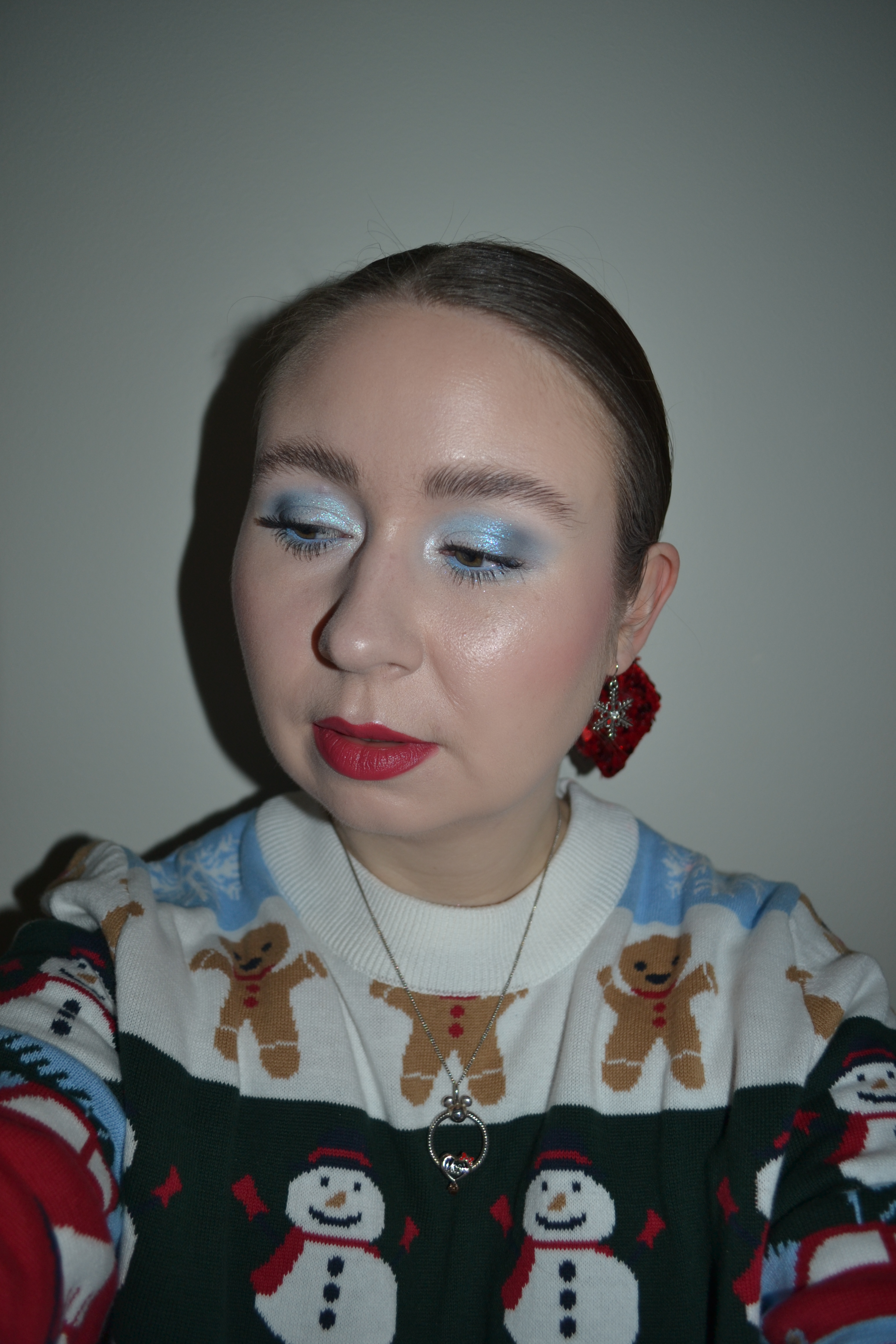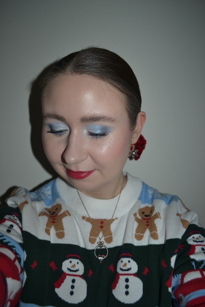 (Base: primers – MAC Frosted Blur primer in Cool + Clear + Rare Beauty Always An Optimist illuminating primer, foundation – Rare Beauty Positive Light tinted moisturizer (shade: 14W), concealers – e.l.f. Cosmetics Putty Color-Correcting Eye Brightener (shade: Fair) + Huda Beauty #FAUXFILTER Luminous Matte liquid concealer (shade: 1.3G Marshmellow), powders – Charlotte Tilbury Airbrush Brightening Flawless Finish powder (shade: Fair/Medium) + Rare Beauty Always An Optimist Soft Radiance setting powder in Light. Face make-up: bronzer – Makeup By Mario SoftSculpt serum bronzer in Fair, blusher – Catrice Sparks Of Joy blush stick in C01 All I Want For Christmas Is Red, highlighter – Colourpop Frosty the Snowman Super Shock highlighter in Icicle Spree. Eye make-up: base – GlossGods Cosmetics That Base! Crease Killer eyeshadow base, eyeshadows – Colourpop Frosty the Snowman palette (shades: Christmas Snow + Splendid + Button Nose + 1969 + Something Wonderful + Jolly Soul), mascaras – MAC Extended Play Gigablack Lash mascara + Pat McGrath Labs Dark Star mascara, eyeliner – Oden’s Eye Solmåne gel liner in 007 Baby Blue. Eyebrows: MAC Shape + Shade brow tint in Taupe + Anastasia Beverly Hills Brow Freeze. Lips: Colourpop Frosty the Snowman Lippie pencil in Magic Hat + Colourpop Frosty the Snowman Lux lipstick in Silly Snowman)