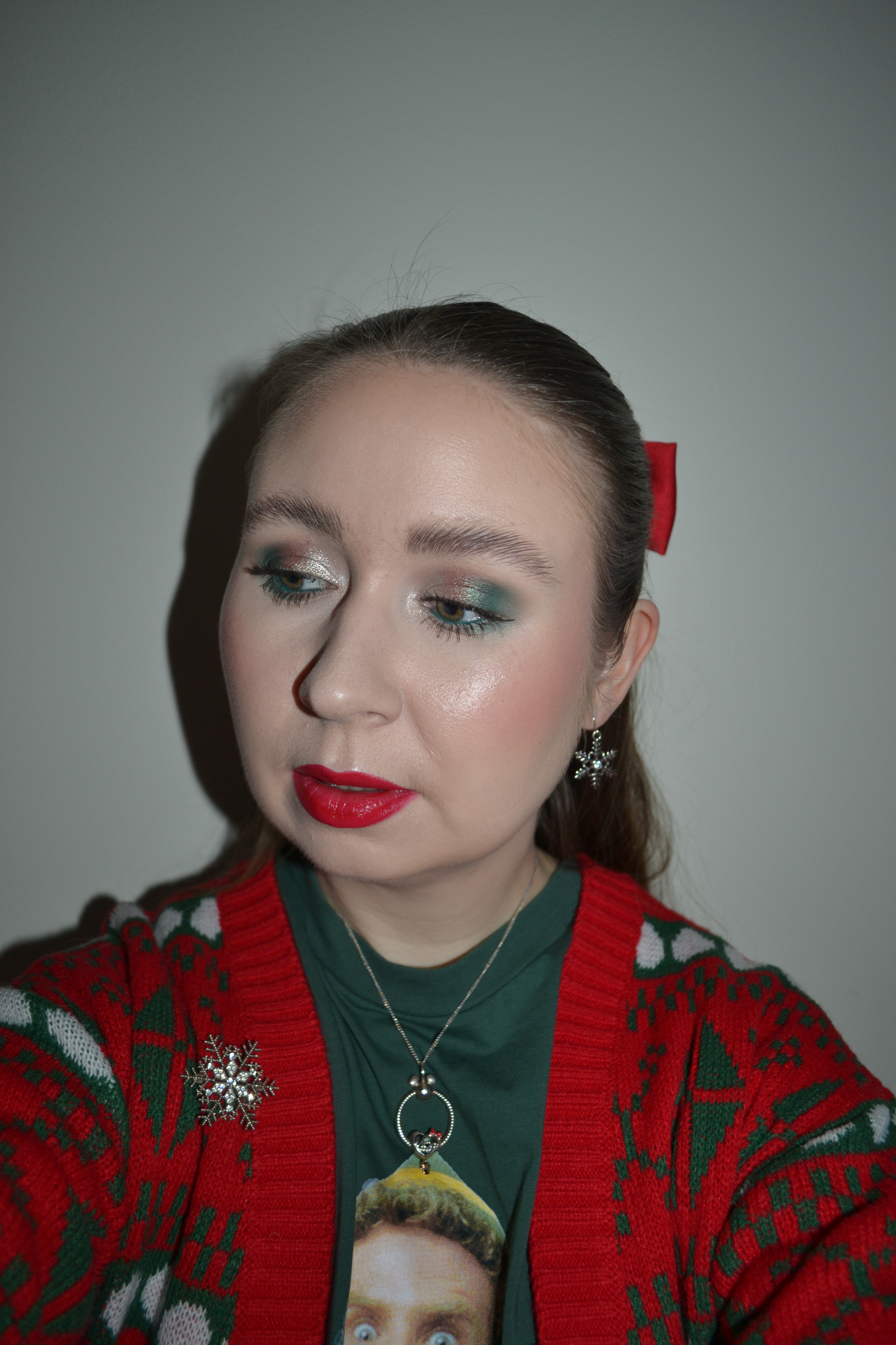 Here’s the make-up I wore with this outfit. I finally got my hands on the Give Me Glow Cosmetics Christmas Morning palette, which I’ve been wanting for so long, and I really like the quality of the shadows and how the eye look turned out.