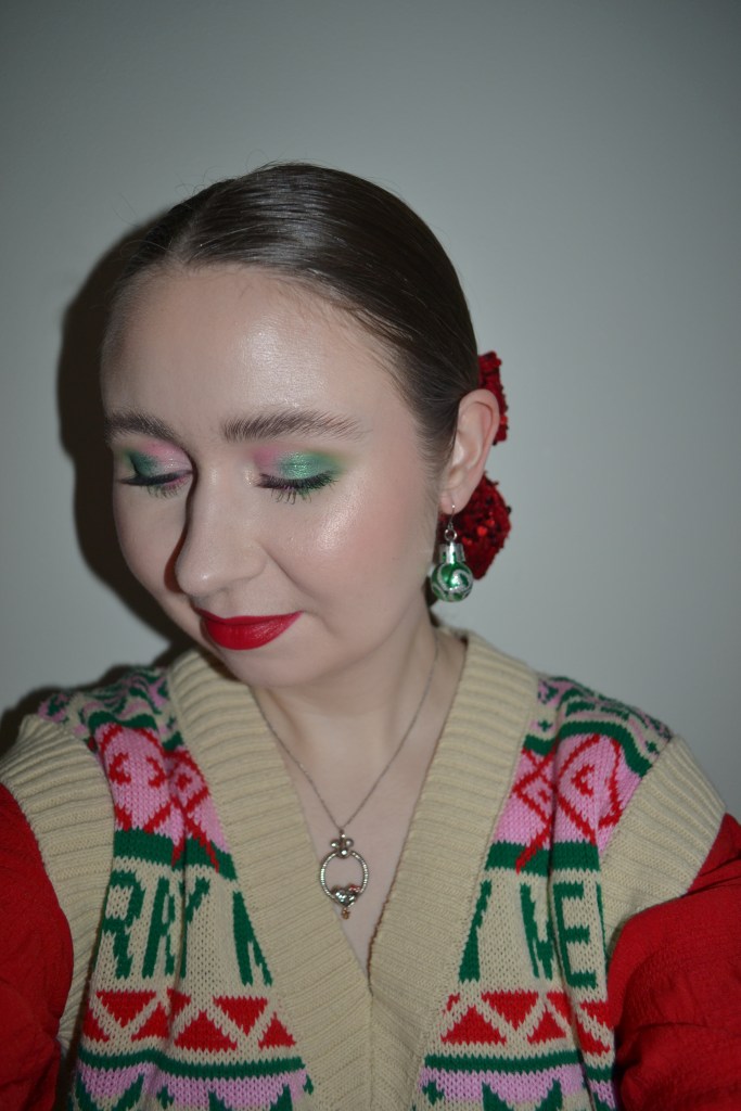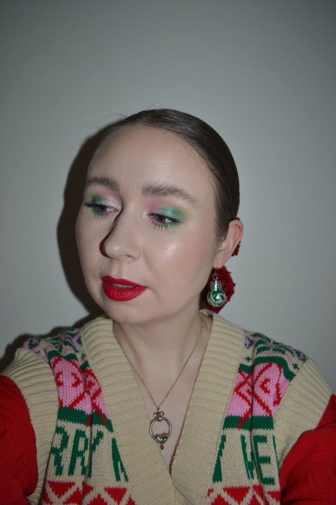 (Base: primer – e.l.f Cosmetics Power Grip primer + 4% Niacinamide, foundation – Rare Beauty Positive Light tinted moisturizer (shade: 14W), concealers – e.l.f. Cosmetics Putty Color-Correcting Eye Brightener (shade: Fair) + Huda Beauty #FAUXFILTER Luminous Matte liquid concealer (shade: 1.3G Marshmellow), powders – Laura Mercier Translucent Loose Setting Powder Tone Up in Rose + Rare Beauty Always An Optimist Soft Radiance setting powder in Light. Face make-up: bronzer – MAC Skinfinish Sunstruck Radiant bronzer (shade: Radiant Light Rosy), blusher + highlighter – MAC Star-Dipped Face Compact: Light (shades: Extra Dimension blush in Dipped In Stars + Extra Dimension Skinfinish in Hi-Sequincy). Eye make-up: base – MAC Pro Longwear Paint Pot in Painterly, eyeshadows – Colourpop The Muppets Holidays! Holidays! Holidays! palette (shades: Holiday Party Time + Haute Holidays + Being Green + Festive + Celebrate Moi + Icy Patch) + Colourpop Just My Luck palette (shade: Act Natural), mascaras – Glisten Cosmetics Spectra Lash mascara in Green + Pat McGrath Labs Dark Star mascara, eyeliners – Catrice Who I Am double ended eye pencil in C01 I Am Art + Catrice Festive Treasures metallic eye pencil in C01 Mistlegreen. Eyebrows: MAC Shape + Shade brow tint in Taupe + Anastasia Beverly Hills Brow Freeze. Lips: Anastasia Beverly Hills Lip Liner in Cherry + MAC Wild Card lipstick)