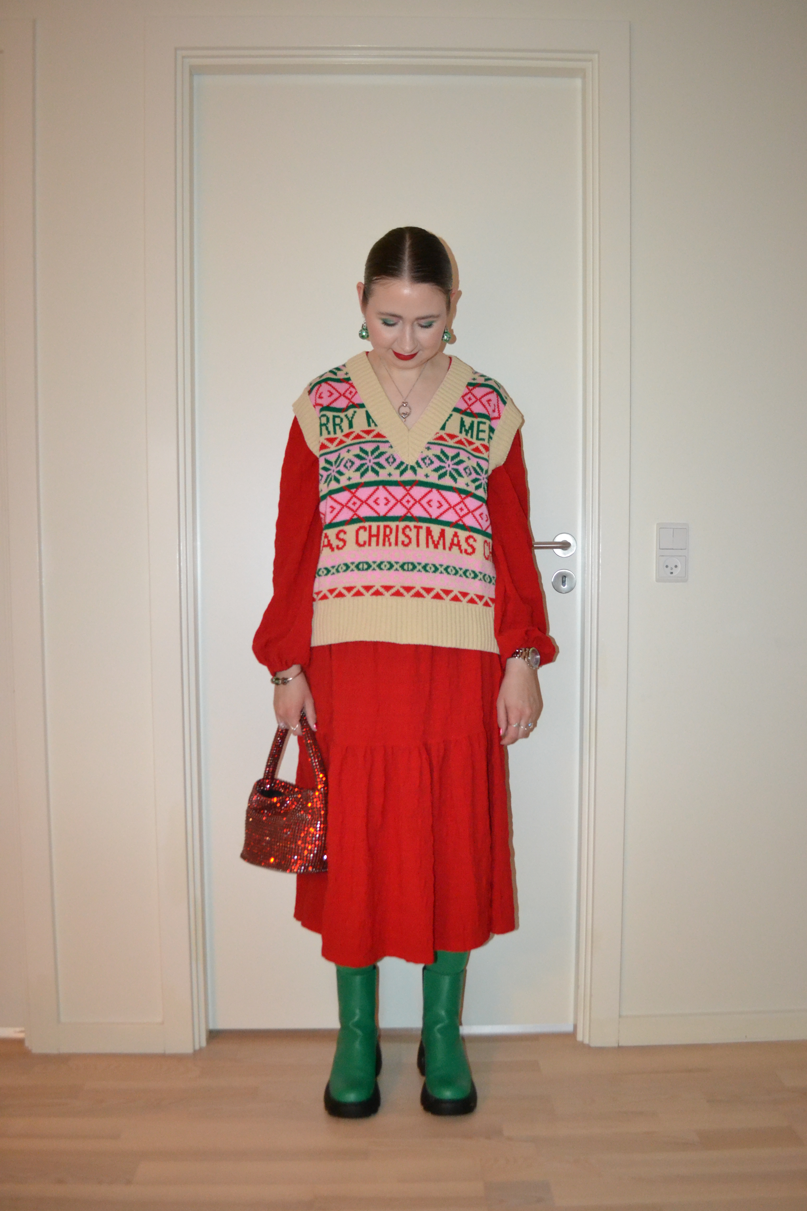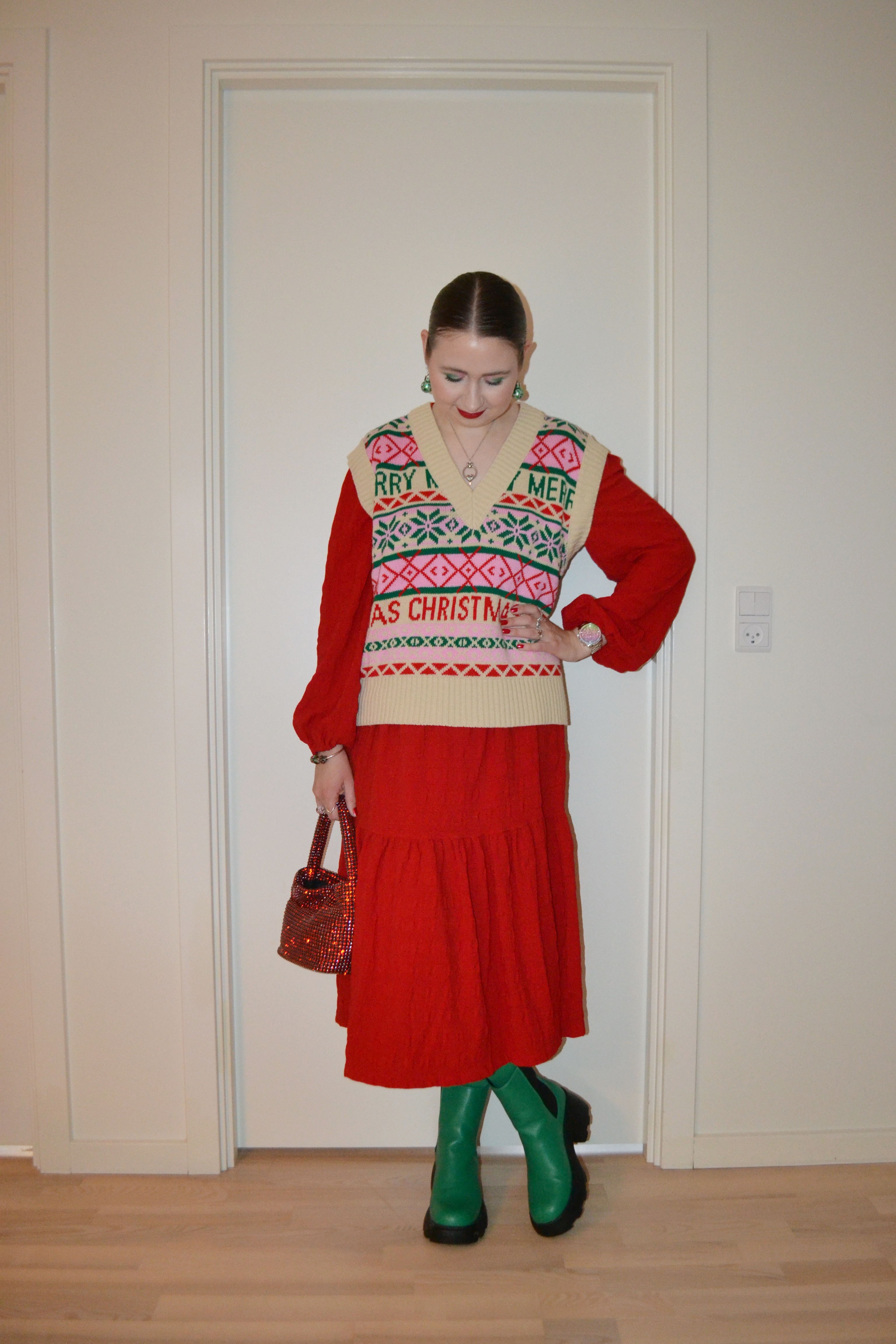 (Sweater vest – Asos Design, dress – Monki, bag – NA-KD, tights – Sneaky Fox, boots – Topshop)
