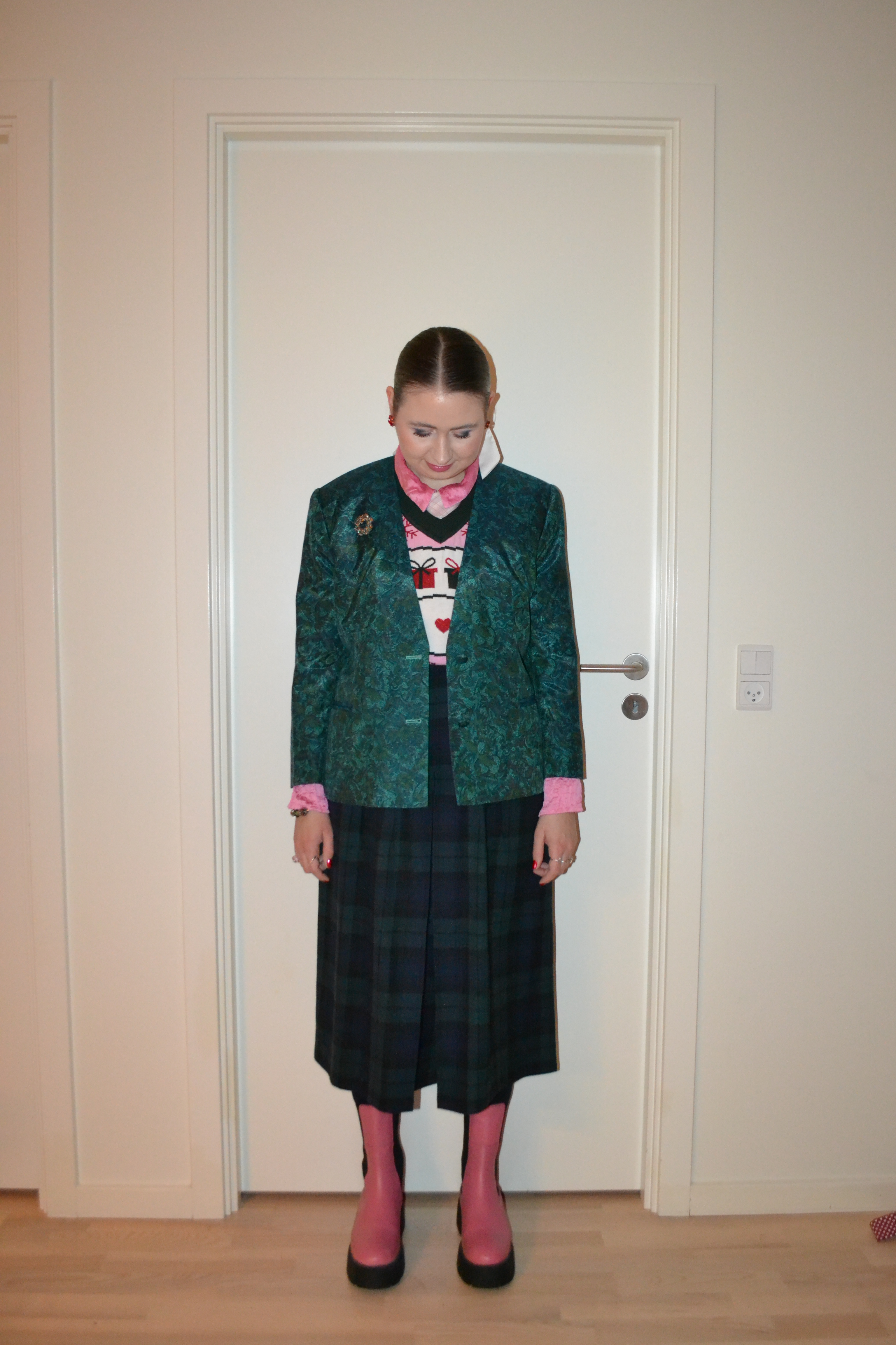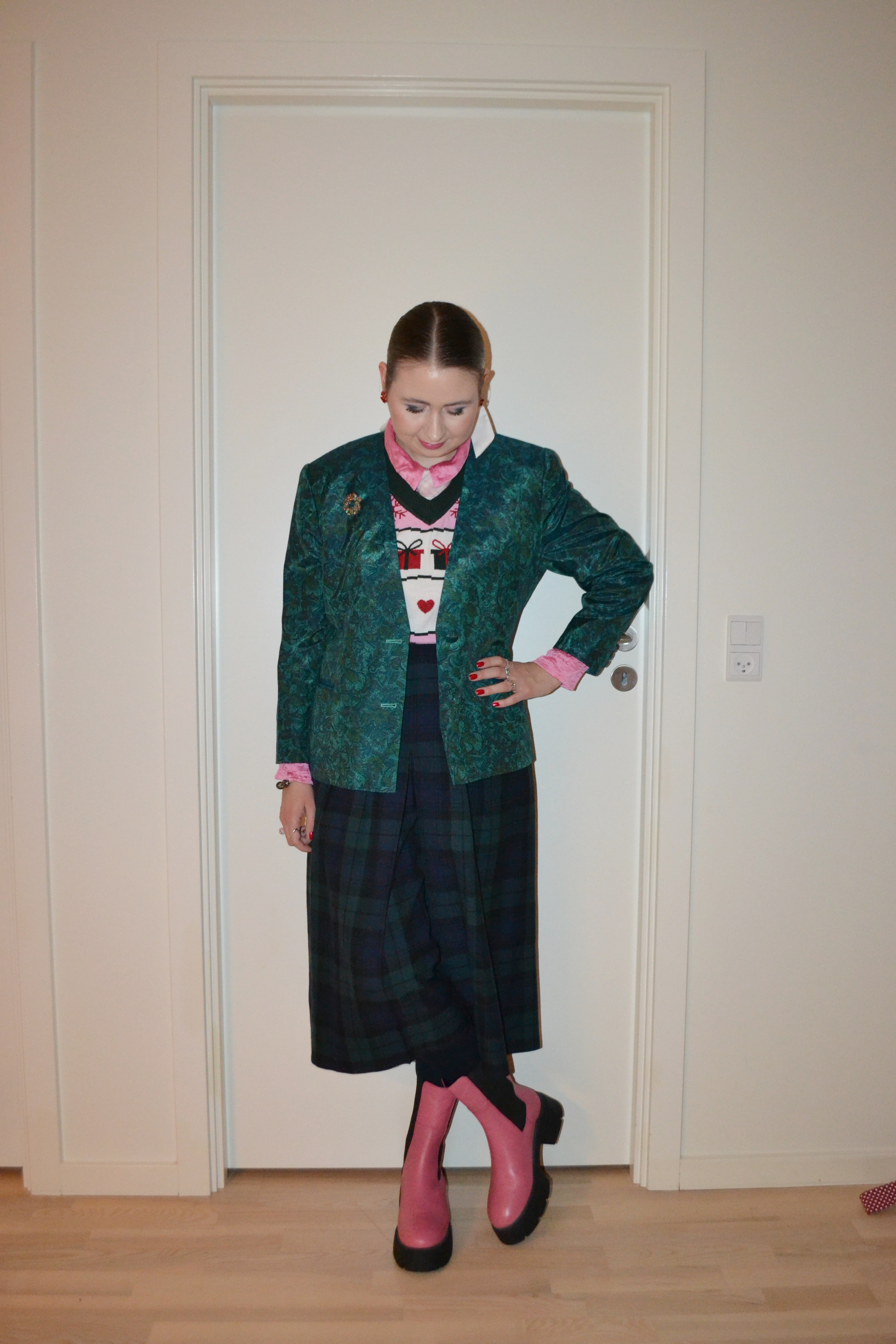 (Blazer + skirt/trousers – second hand, shirt – Monki, sweater vest – VRS, tie – My Accessories, tights – Calzedonia, boots – Asos Design)