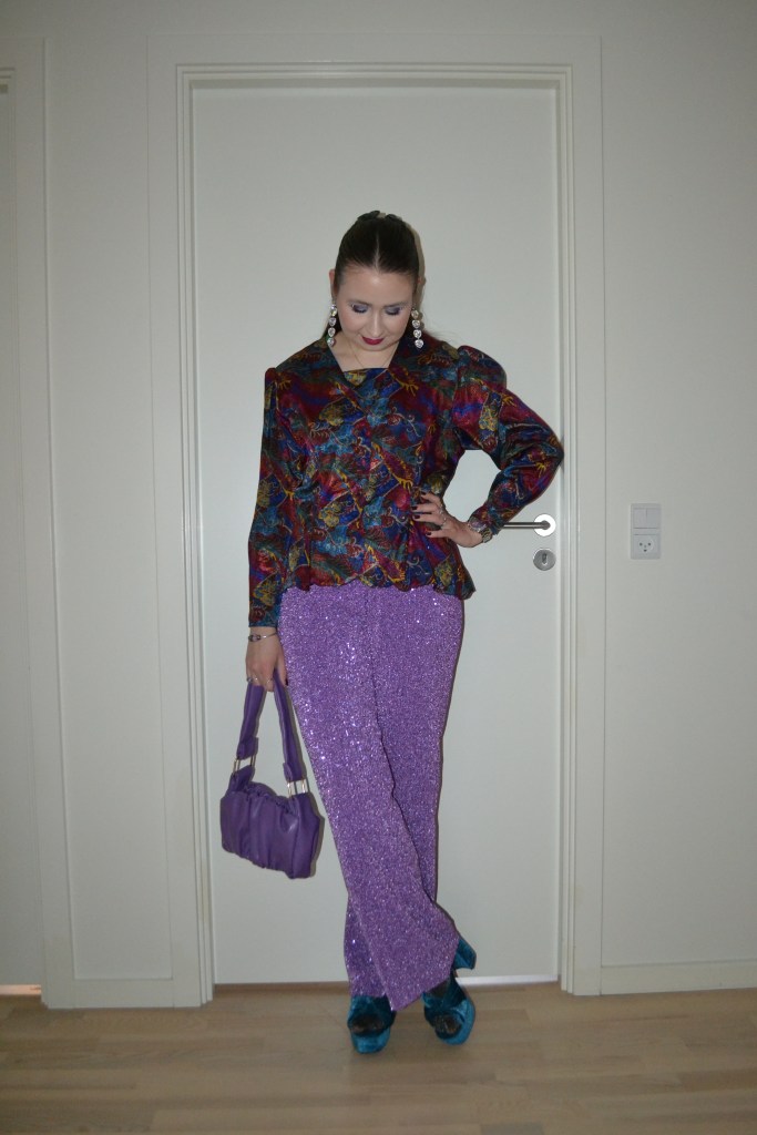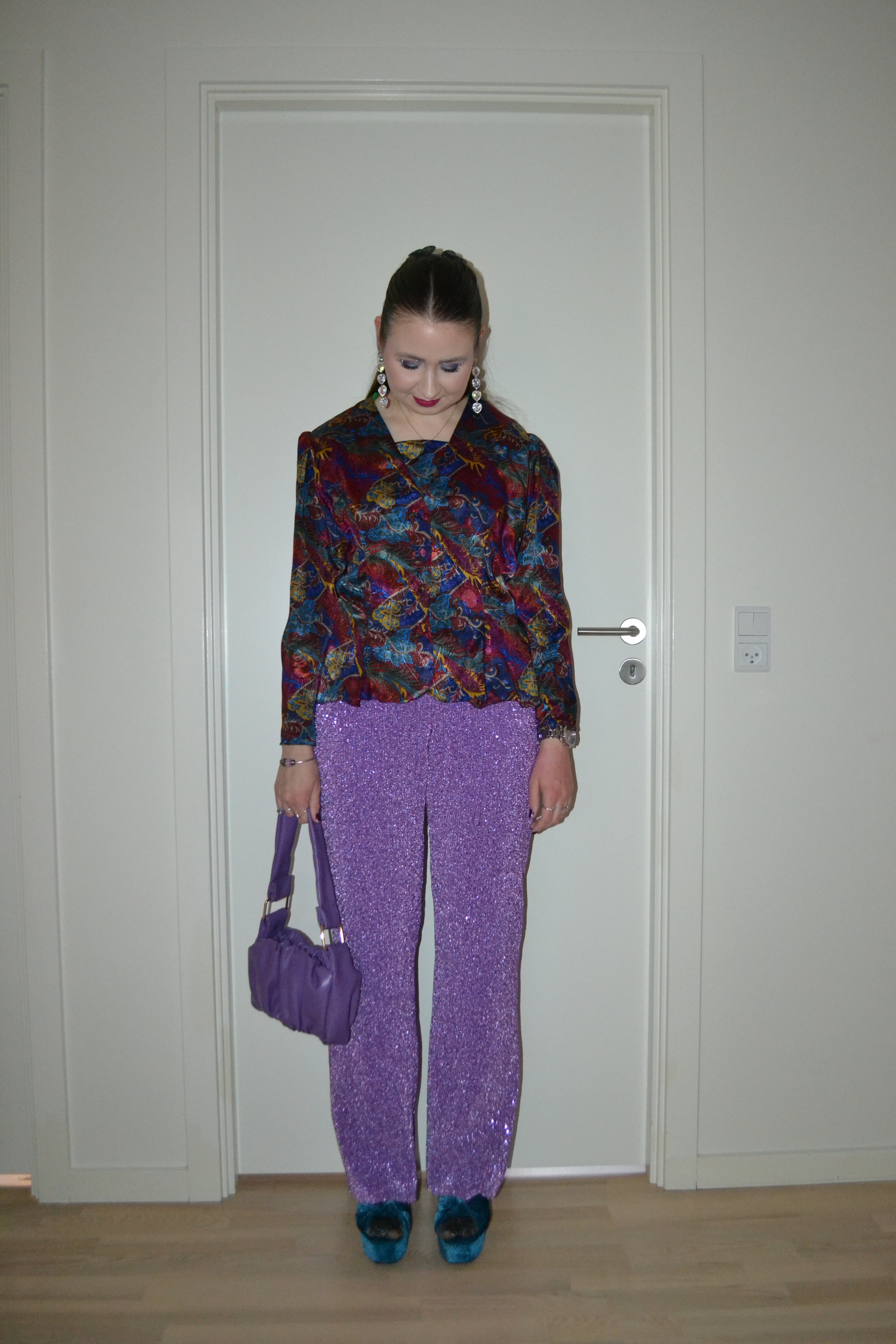 Here’s what I wore on New Year’s Eve. I’d been wanting to wear these purple sequin trousers for a while, and they were obviously perfect to wear on New Year’s Eve. I think this whole look is so fun.