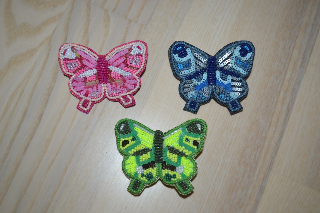 I also love brooches, and I was so excited to find these pretty, beaded butterfly ones from Becksöndergaard. I actually wore the pink one yesterday, and I’m wearing both the blue one and the green one today.