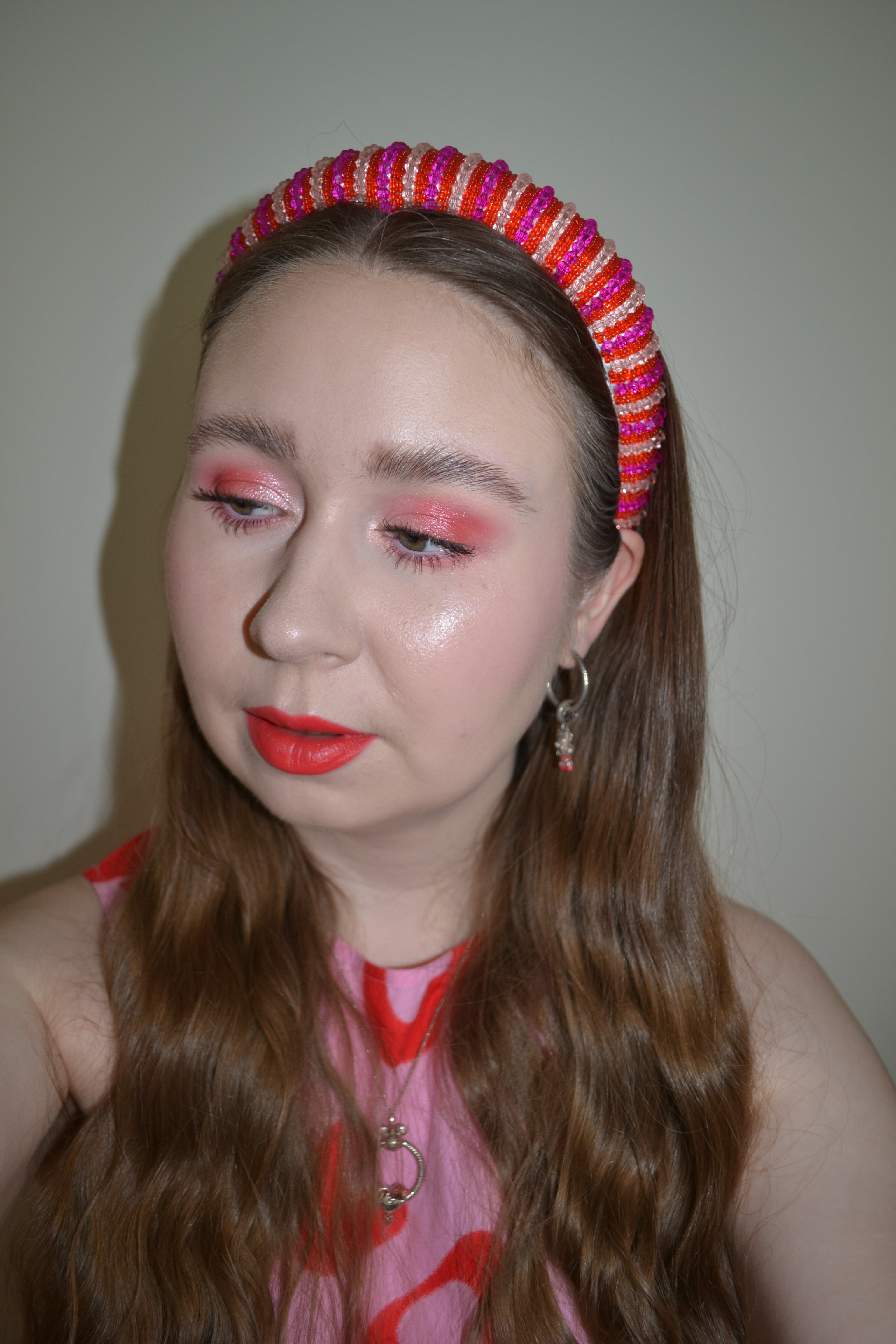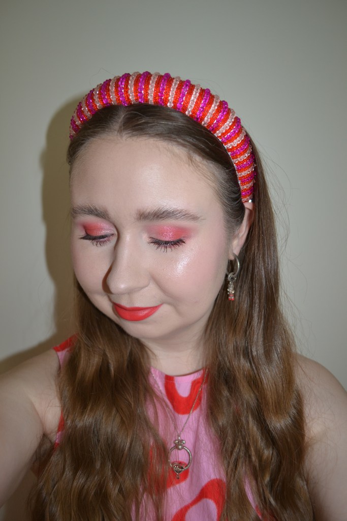 Here’s the make-up I wore with this outfit. I rewore the Colourpop Lost In Love palette, which has some lovely red and pink shades in it.