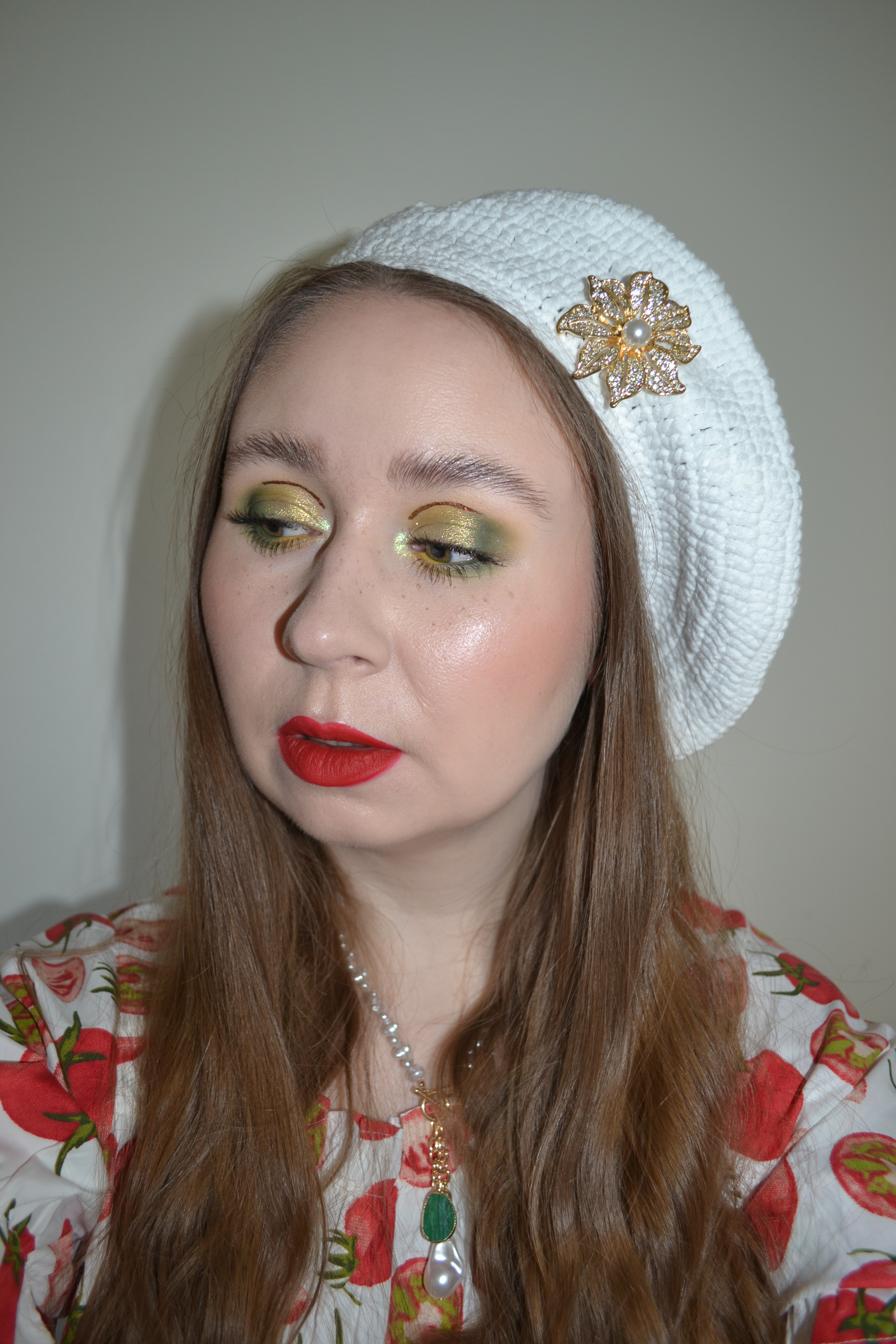 (Base: primer – e.l.f. Skin Suntouchable! Whoa Glow SPF 30 sunscreen (shade: Sunbeam), foundation – Catrice Nude Drop Tinted Serum foundation (shade: 004N), concealers – Rare Beauty Positive Light under eye brightener (shade: Light) + Catrice True Skin High Cover concealer (shade: 002 Neutral Ivory), powders – Essence Brighten Up! Banana powder in 10 Bababanana + Bobbi Brown Sheer Finish pressed powder in Soft Porcelain, freckles – KimChi Chic Candy Girl Fake Freckles in Afternoon in The Flower Field. Face make-up: bronzer – Tarte Sculpt Tape contour in Cool Bronze, blusher – Maybelline Sunkisser blush in 06 City Sizzle, highlighter – Catrice Magic Christmas Story Cheeklighter in C01 Mother Ginger. Eye make-up: base – Sigma Beauty Eyeshadow Base Primer in Ignite, eyeshadows – Essence eyeshadow in 20 Cream + Unearthly Cosmetics Fall Magic palette (shades: Forage + Earthy + Leaves + Crisp), mascaras – MAC Extended Play Gigablack Lash mascara + Pat McGrath Labs Dark Star mascara, eyeliners – Lethal Cosmetics x Avatar: The Last Airbender liner set in Zuko (multichrome shade) + NYX Vivid Rich eyeliner in Emerald Empire + NYX Epic Wear Liner Stick in Cosmic Yellow. Eyebrows: Anastasia Beverly Hills Brow Freeze gel (with wand) + Maybelline Brow Ultra Slim pencil in Medium Brown. Lips: Natasha Denona I Need A Rouge lip crayon in Gigi + L’Oréal Paris Infaillible Matte Resistance liquid lipstick in 400 Spill The Tea)