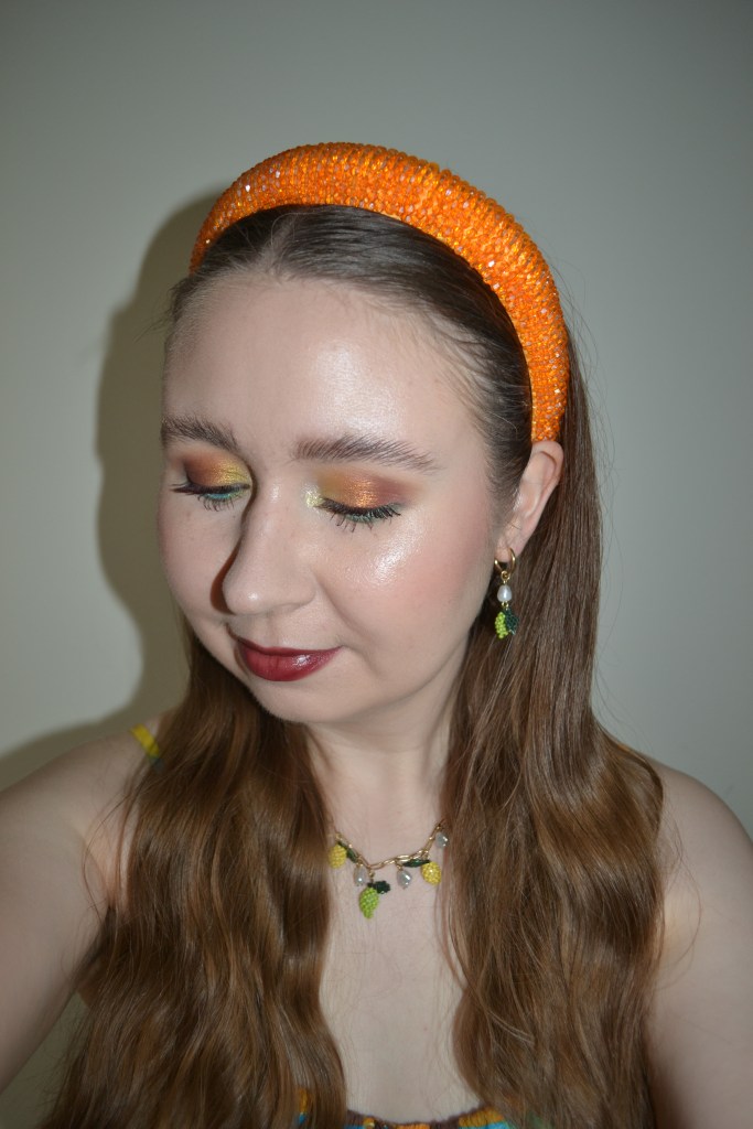 (Base: primers – Danessa Myricks Beauty Yummy Skin Blurring Balm Powder (shade: Universal) + Charlotte Tilbury Hollywood Flawless Filter (shade: 1 Fair), foundation – Danessa Myricks Beauty Yummy Skin serum skin tint (shade: 2), concealers – Rare Beauty Positive Light under eye brightener (shade: Light) + Fenty Beauty We’re Even hydrating longwear concealer (shade: 120N), powders – Essence Brighten Up! Banana powder in 10 Bababanana + e.l.f. Cosmetics Halo Glow setting powder in Light, freckles – KimChi Chic Candy Girl Fake Freckles in Afternoon in The Flower Field. Face make-up: bronzer – Kiko Milano Sculpting Touch creamy stick contour in 200 Hazelnut, blusher – Colourpop Super Shock blush in Bardot, highlighter – Colourpop Winx Club Lite Stix in Darcy. Eye make-up: base – Sigma Beauty Eyeshadow Base Primer in Ignite, eyeshadows – Essence eyeshadow in 20 Cream + Unearthly Cosmetics Fairy Frolic palette (shades: Fern + Bark + Frolic + Meadow + Eden + Mystical Moss) + Colourpop Hocus Pocus 2 Jelly Much shadow in I Am Calm!, mascara – Maybelline Lash Sensational Sky High mascara (shade: Burgundy Haze), eyeliner – Colourpop BFF Créme gel liner in Crystal Tokyo. Eyebrows: Anastasia Beverly Hills Brow Freeze gel (with wand) + Maybelline Brow Ultra Slim pencil in Medium Brown. Lips: Anastasia Beverly Hills Lip Liner in Raisin + Colourpop Glowing Lip in Highland Ave)