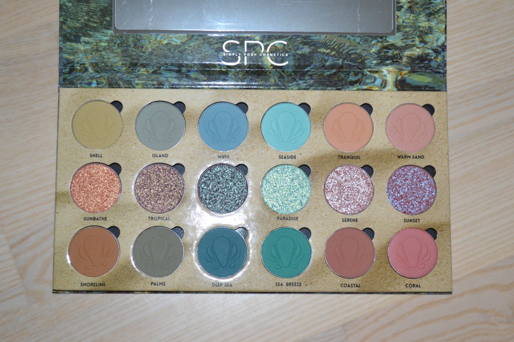 I got three palettes from Simply Posh Cosmetics. I really like the way they organise their palettes with a row of lighter mattes, a row of special shimmers, and a row of deeper mattes. This is the Coastal palette, which is one of their more neutral palettes, but it’s interesting neutrals with some pops of colour.