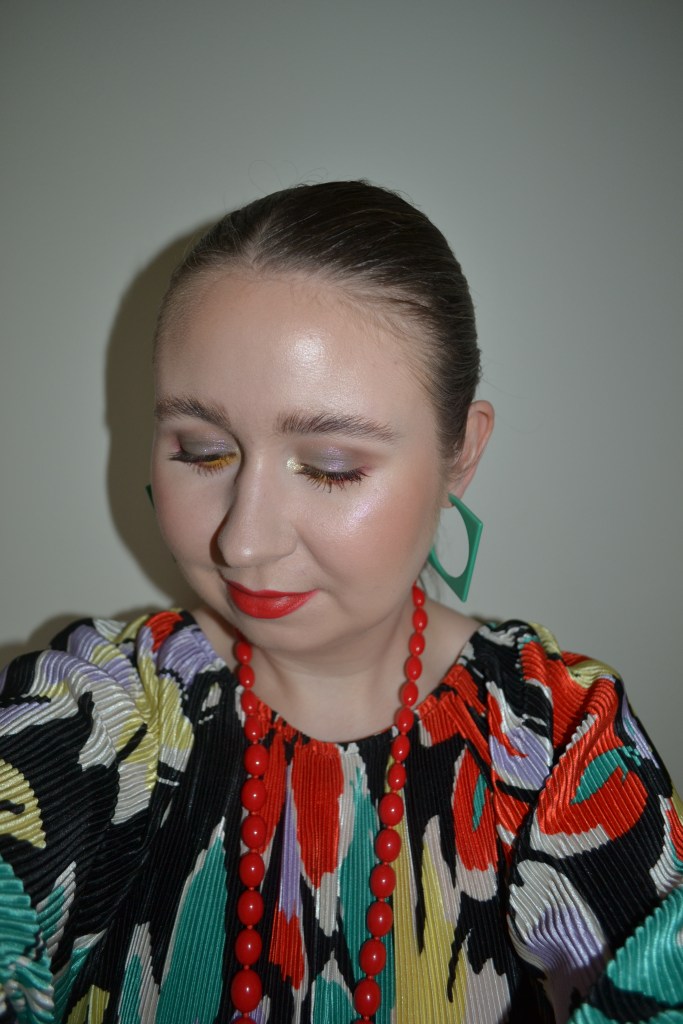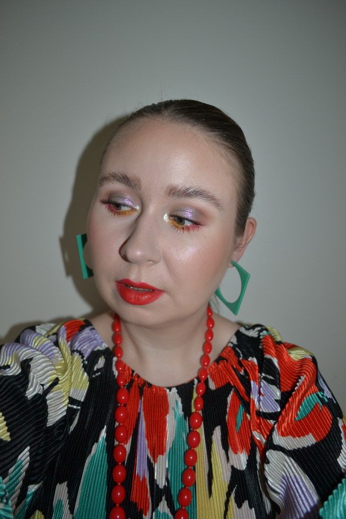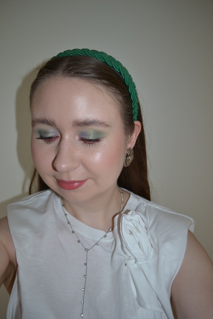 (Base: primer – e.l.f. Cosmetics Liquid Poreless Putty primer, foundation – L’Oréal Paris True Match Nude plumping tinted serum (shade: 0,5-2 Very Light), concealers – e.l.f. Cosmetics Putty Color-Correcting Eye Brightener (shade: Fair) + Natasha Denona Hy-Glam concealer (shade: P1), powders – Laura Mercier Translucent Loose Setting Powder Tone Up in Rose + Rare Beauty Always An Optimist Soft Radiance setting powder in Light, freckles – KimChi Chic Candy Girl Fake Freckles in Afternoon in The Flower Field. Face make-up: bronzer – Makeup By Mario SoftSculpt serum bronzer in Fair, blush – Dior Forever Glow Maximizer in 014 Rosy, highlighter – Essence Snow Much Love cream to powder highlighter in 01 The Snow Glow Show!. Eye make-up: base – MAC Pro Longwear Paint Pot in Painterly, eyeshadows – By BEAUTY BAY Botanical 20 colour palette (shades: Lily + Matcha + Myrtle + Amazon + Waterfall + Clay + Canyon + Savanna), mascara – Rimmel Kind & Free mascara (shade: 02 Brown Black), eyeliner – Colourpop BFF Crème gel liner in Get Lucid. Eyebrows: Anastasia Beverly Hills Brow Freeze gel (with wand) + Maybelline Brow Ultra Slim pencil in Medium Brown. Lips: Gosh Velvet Touch lip liner in 002 Antique Rose + Colourpop Glowing Lip in La Cienega)