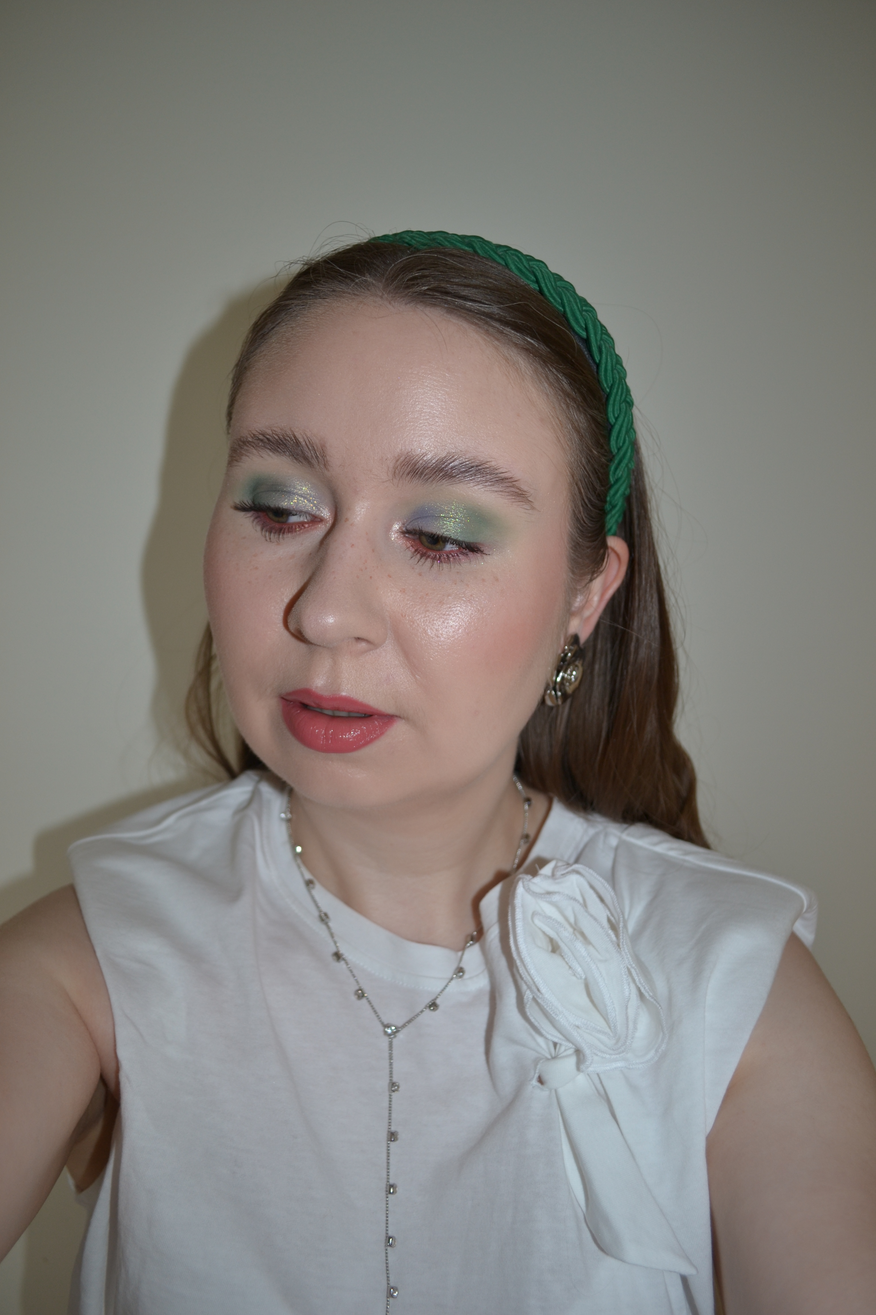 (Base: primer – e.l.f. Cosmetics Liquid Poreless Putty primer, foundation – L’Oréal Paris True Match Nude plumping tinted serum (shade: 0,5-2 Very Light), concealers – e.l.f. Cosmetics Putty Color-Correcting Eye Brightener (shade: Fair) + Natasha Denona Hy-Glam concealer (shade: P1), powders – Laura Mercier Translucent Loose Setting Powder Tone Up in Rose + Rare Beauty Always An Optimist Soft Radiance setting powder in Light, freckles – KimChi Chic Candy Girl Fake Freckles in Afternoon in The Flower Field. Face make-up: bronzer – Makeup By Mario SoftSculpt serum bronzer in Fair, blush – Dior Forever Glow Maximizer in 014 Rosy, highlighter – Essence Snow Much Love cream to powder highlighter in 01 The Snow Glow Show!. Eye make-up: base – MAC Pro Longwear Paint Pot in Painterly, eyeshadows – By BEAUTY BAY Botanical 20 colour palette (shades: Lily + Matcha + Myrtle + Amazon + Waterfall + Clay + Canyon + Savanna), mascara – Rimmel Kind & Free mascara (shade: 02 Brown Black), eyeliner – Colourpop BFF Crème gel liner in Get Lucid. Eyebrows: Anastasia Beverly Hills Brow Freeze gel (with wand) + Maybelline Brow Ultra Slim pencil in Medium Brown. Lips: Gosh Velvet Touch lip liner in 002 Antique Rose + Colourpop Glowing Lip in La Cienega)