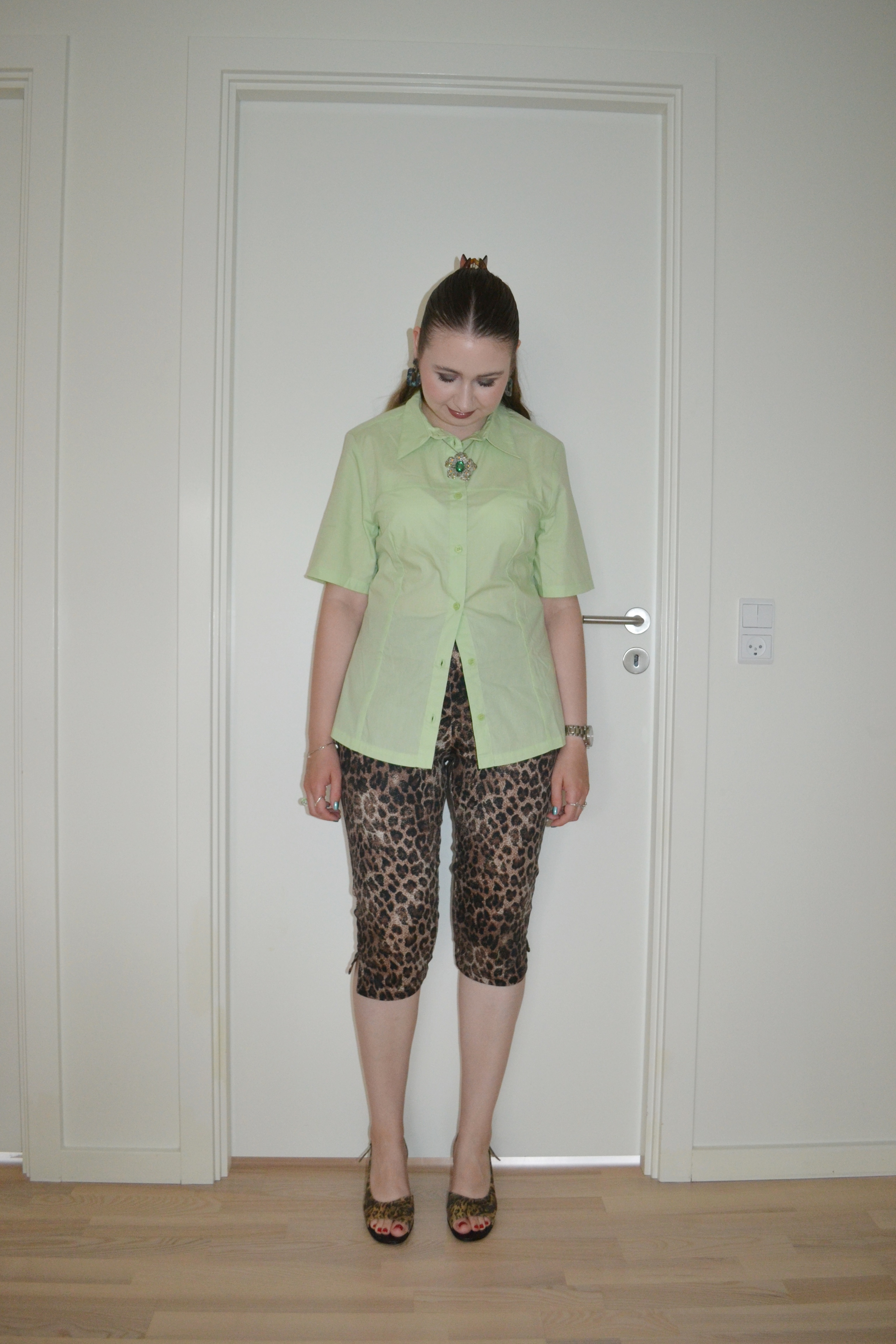 Here’s what I wore Monday September 9. I wanted to style up my leopard print capris again and thought they looked cute paired with the light green shirt and some more leopard print in the form of the heels.