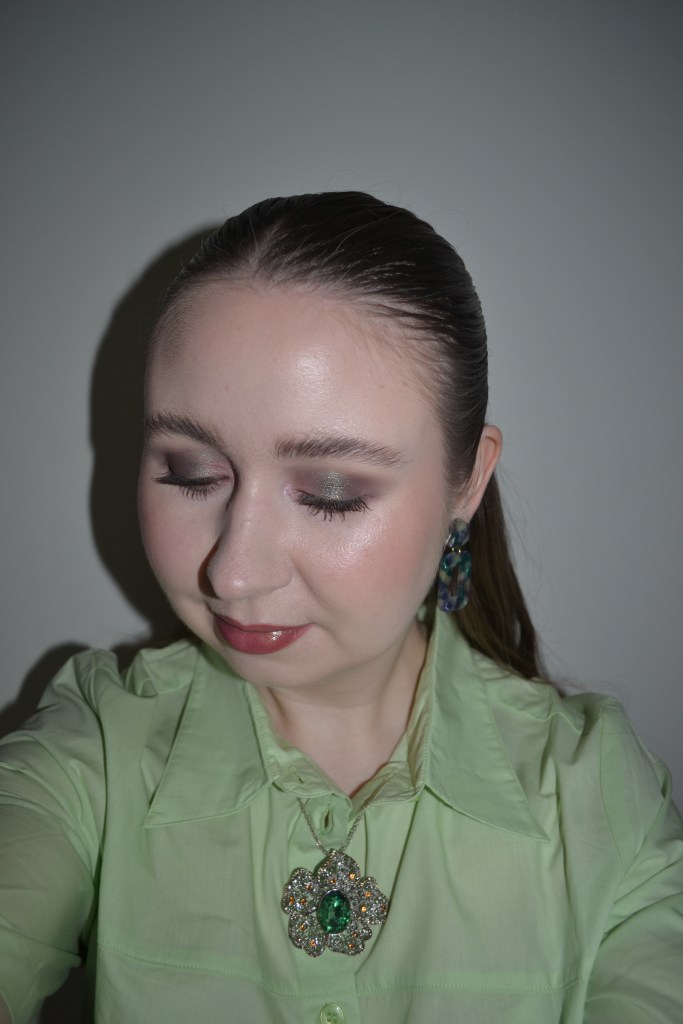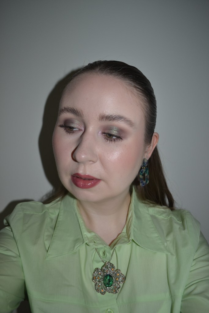 (Base: primer – e.l.f. Cosmetics Liquid Poreless Putty primer, foundation – Sephora Collection Reveal The Real soft radiant skin tint (shade: 100N Fair), concealers – e.l.f. Cosmetics Putty Color-Correcting Eye Brightener (shade: Fair) + Huda Beauty #FAUXFILTER Luminous Matte liquid concealer (shade: 1.3G Marshmellow), powders – Laura Mercier Translucent Loose Setting Powder Tone Up in Rose + e.l.f. Cosmetics Halo Glow setting powder in Light. Face make-up: bronzer – RMS Beauty ReDimension Hydra bronzer in Beachwalk Betty, blush – Oden’s Eye Solmåne Sunlight Love blusher in B105 Pink Bloom, highlighter – Bobbi Brown highlighting powder in Pink Glow. Eye make-up: base – Sigma Beauty Eyeshadow Base Primer in Ignite, eyeshadows – Sigma Beauty Enchanted eyeshadow palette (shades: Quartz + Loam + Claystone + Cosmos + Metamorphosis + Moonglade), mascara – Rimmel Kind & Free mascara (shade: 02 Brown Black), eyeliners – Essence Meta Glow duo-chrome eye pencil in 03 Galactic Chrome + Oden’s Eye Solmåne gel liner in 012 Golden Brown. Eyebrows: Anastasia Beverly Hills Brow Freeze + Maybelline Brow Ultra Slim pencil in Medium Brown. Lips: Anastasia Beverly Hills Lip Liner in Raisin + MAC Nippy’s Shimmery Cinnamon lipglass)