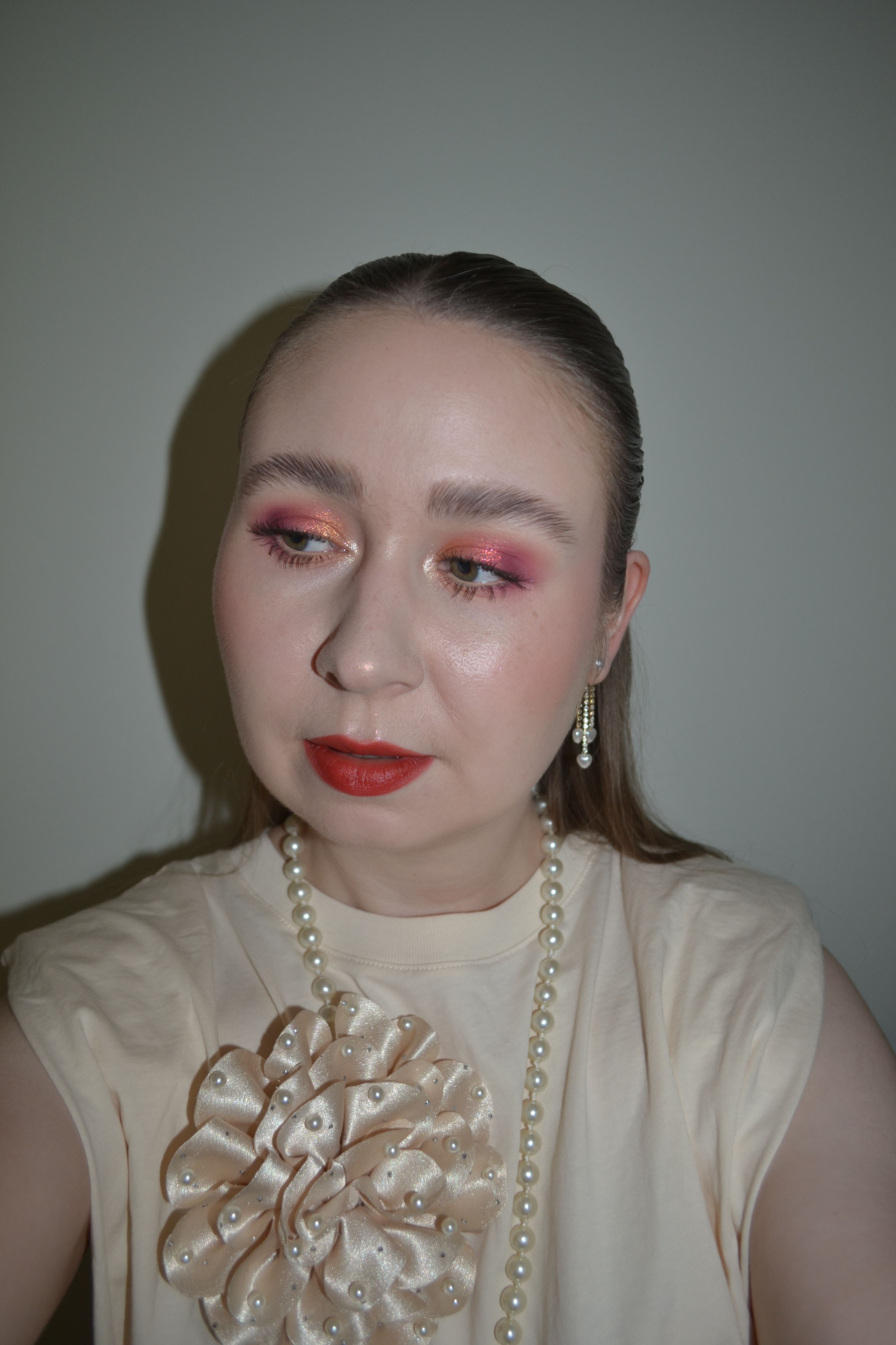 (Base: primers – Danessa Myricks Beauty Yummy Skin Blurring Balm Powder (shade: Universal) + e.l.f. Skin Suntouchable! Whoa Glow SPF 30 sunscreen (shade: Sunbeam), foundation – Danessa Myricks Beauty Yummy Skin serum skin tint (shade: 2), concealers – Rare Beauty Positive Light under eye brightener (shade: Light) + Natasha Denona Hy-Glam concealer (shade: P1) + Huda Beauty #FAUXFILTER Luminous Matte liquid concealer (shade: 1.3G Marshmellow), powder – e.l.f. Cosmetics Halo Glow setting powder in Light. Face make-up: bronzer – Charlotte Tilbury Beautiful Skin Sun-Kissed Glow bronzer in Fair, blush – MAC Glow Play blush in Plush Pepper, highlighter – Oden’s Eye Solmåne Moonlight Feel highlighter in H109 Light Glory. Eye make-up: base – MAC Pro Longwear Paint Pot in Painterly, eyeshadows – Essence eyeshadow in 20 Cream + Lethal Cosmetics x Avatar: The Last Airbender “Fire” palette (shades: Imperial City + Fire Sages + Roku + Fire Lily + The Dancing Dragon), mascara – Rimmel Kind & Free mascara (shade: 02 Brown Black), eyeliner – Colourpop Crème gel liner in Honeydude. Eyebrows: Anastasia Beverly Hills Brow Freeze + Maybelline Brow Ultra Slim pencil in Medium Brown. Lips: MAC Chicory lip pencil + Lethal Cosmetics Avatar The Last Airbender Mai lipstick)