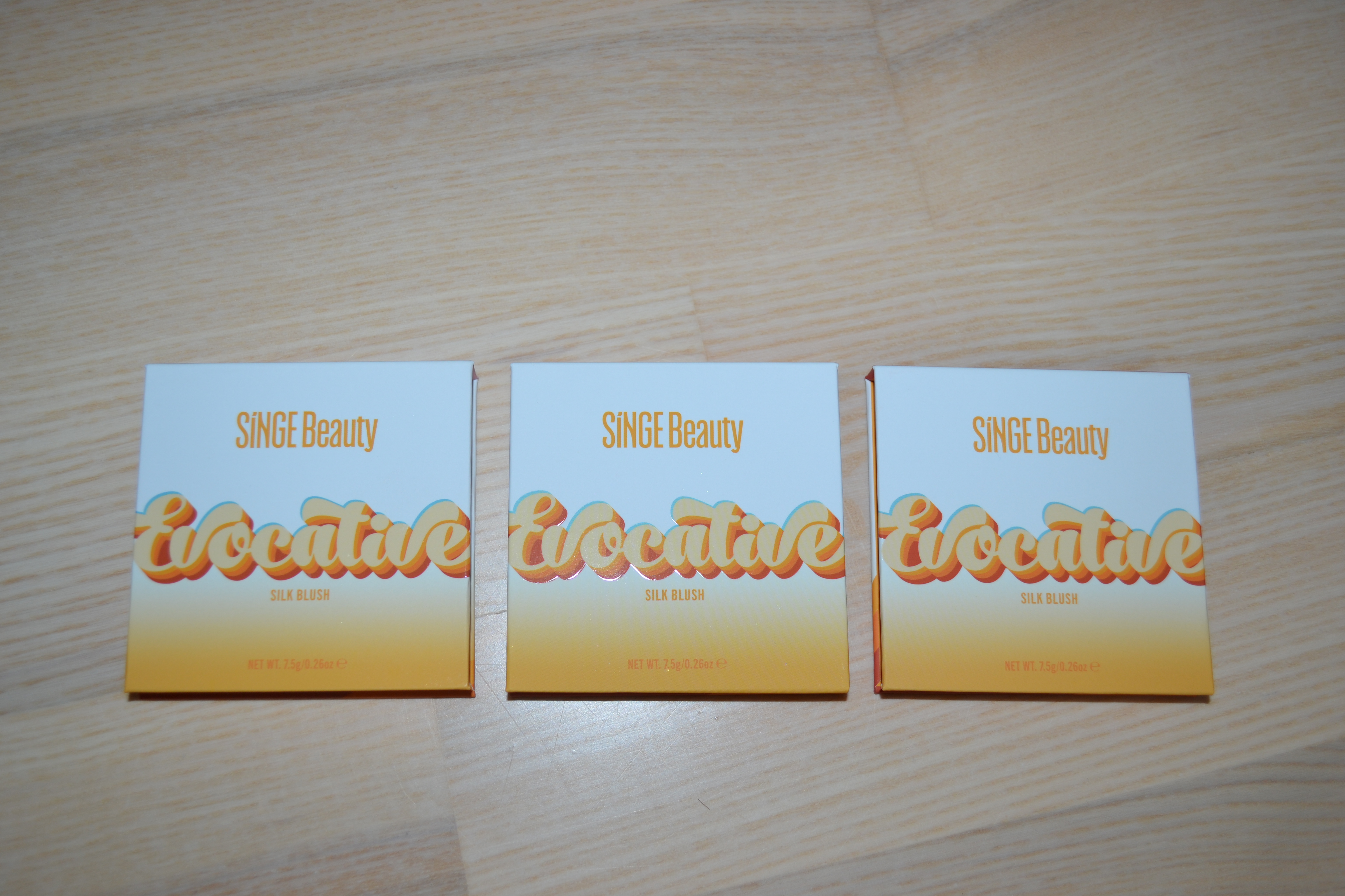 I was so excited to see Singe Beauty releasing colour cosmetics. These are the Evocative Silk Blushes and I picked up three of the four shades. They’re called (from left ot right) Riveting Rhubarb, Persistent Persimmon, and Timid Tomato. It’s a very lovely glowy, but not glittery formula, and the shades are so nice as well.