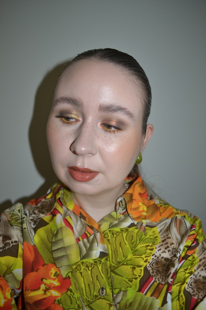 (Base: primer – Iconic London Underglow blurring primer, foundation – Danessa Myricks Beauty Yummy Skin serum skin tint (shade: 2), concealers – Rare Beauty Positive Light under eye brightener (shade: Light) + Huda Beauty #FAUXFILTER Luminous Matte liquid concealer (shade: 1.3G Marshmellow), powders – Essence Brighten Up! Banana powder in 10 Bababanana + Bobbi Brown Sheer Finish pressed powder in Soft Porcelain, freckles – KimChi Chic Candy Girl Fake Freckles in Afternoon in The Flower Field. Face make-up: bronzer – Huda Beauty Glowish Soft Radiance bronzing powder in 1 Light, blush – Singe Beauty Evocative Silk Blush in Persistent Persimmon, highlighter – Revlon SkinLights Prismatic highlighter in 201 Daybreak Glimmer. Eye make-up: base – MAC Pro Longwear Paint Pot in Painterly, eyeshadows – Cosmic Brushes Nudetrals palette (shades: Chic + Gentle + Delicate + Icon + Desire + Luxe + Glitz + Radiant), mascara – Rimmel Kind & Free mascara (shade: 02 Brown Black), eyeliner – Natasha Denona Macro Tech eye crayon in Fushi. Eyebrows: Anastasia Beverly Hills Brow Freeze + Maybelline Brow Ultra Slim pencil in Medium Brown. Lips: Juvia’s Place Luxe liner in So Rare + NYX Fat Oil Lip Drip in 07 Scrollin’)