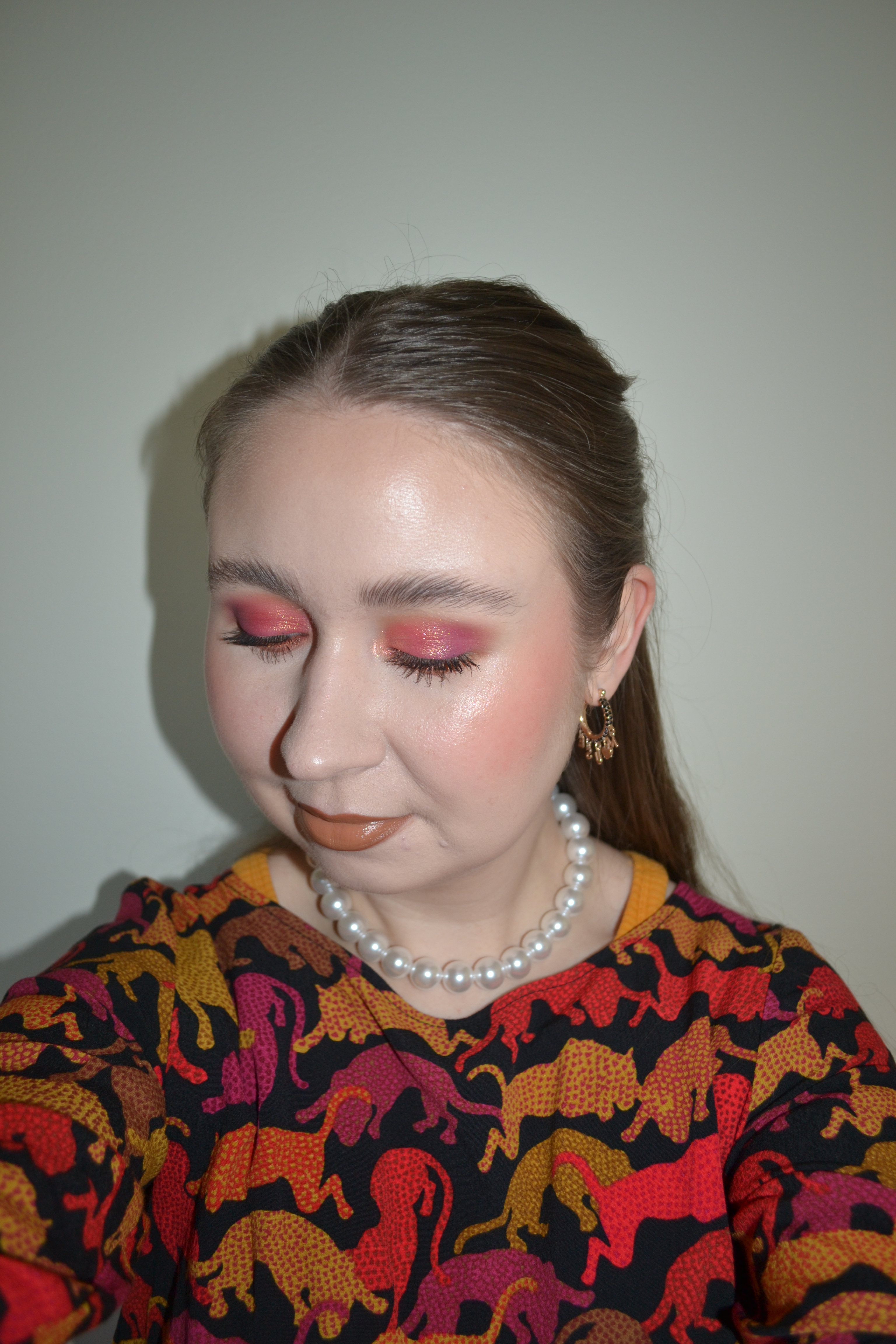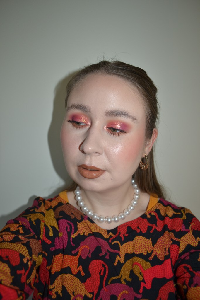 (Base: primer – e.l.f Cosmetics Power Grip primer + 4% Niacinamide, foundation – Danessa Myricks Beauty Yummy Skin serum skin tint (shade: 2), concealers – Rare Beauty Positive Light under eye brightener (shade: Light) + Huda Beauty #FAUXFILTER Luminous Matte liquid concealer (shade: 1.3G Marshmellow), powders – Essence Brighten Up! Banana powder in 10 Bababanana + Dior Backstage Face & Body Powder-No-Powder in 0 Neutral. Face make-up: bronzer – NARS Laguna bronzing powder in Laguna 02, blush – NYX Buttermelt blush in 05 Had Butta, highlighter – Oden’s Eye Solmåne Moonlight Feel highlighter in H109 Light Glory. Eye make-up: base – MAC Pro Longwear Paint Pot in Painterly, eyeshadows – Essence eyeshadow in 20 Cream + Glamlite x Garfield palette (shades: Donut, Please + Mondays + Abu Dhabi + Teddy Bear + Heart of Gold) + Oden’s Eye Solmåne Moonlight Feel highlighter in H109 Light Glory (inner corners), mascaras – MAC Extended Play Gigablack Lash mascara + L’Oréal Lash Paradise mascara in Intense Black, eyeliner – Essence Longlasting eye pencil in 39 Shimmer Sunsation. Eyebrows: MAC Shape + Shade brow tint in Taupe + Anastasia Beverly Hills Brow Freeze. Lips: Juvia’s Place Luxe liner in So Rare + MAC Macximal sleek satin lipstick in Call It Cozy)