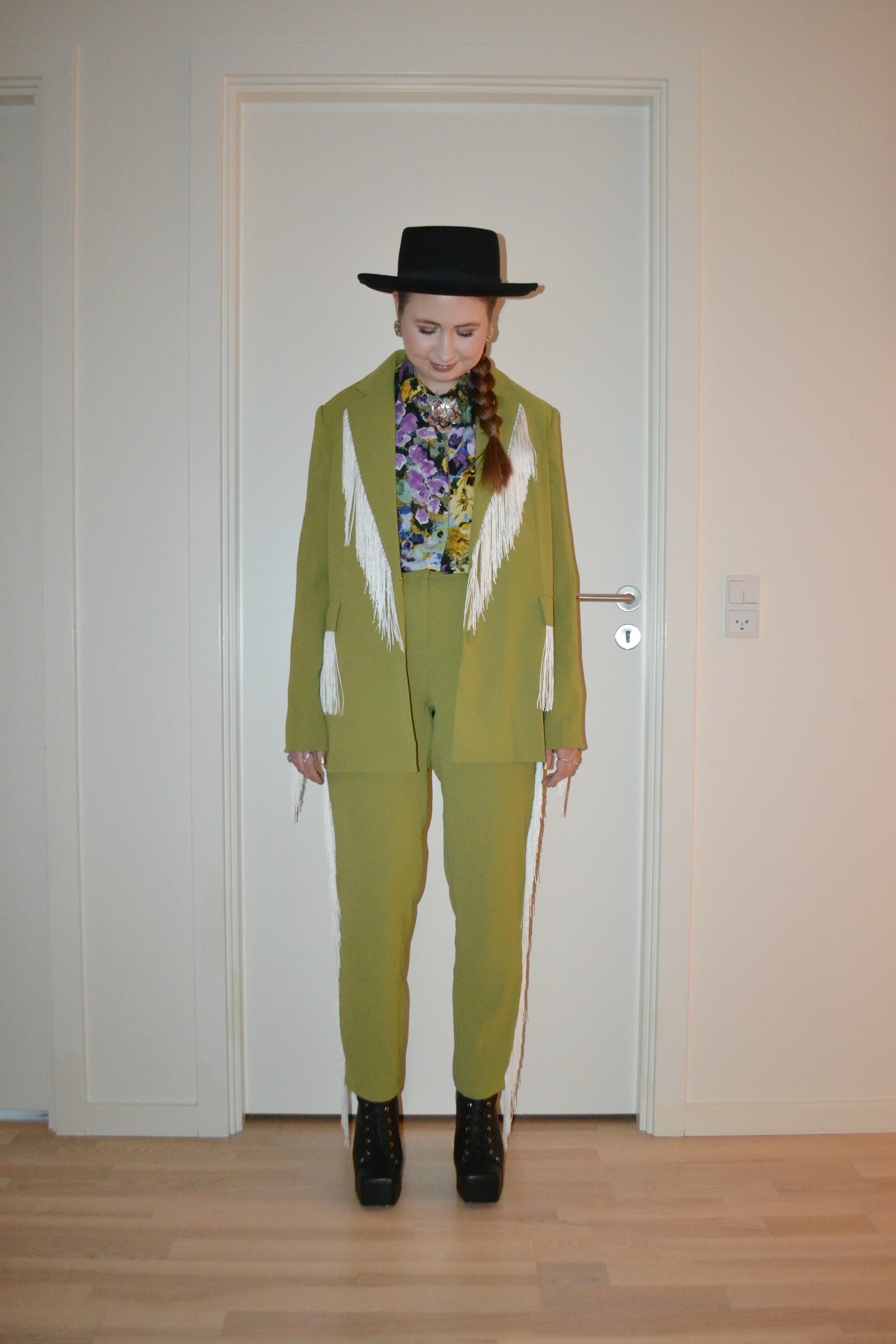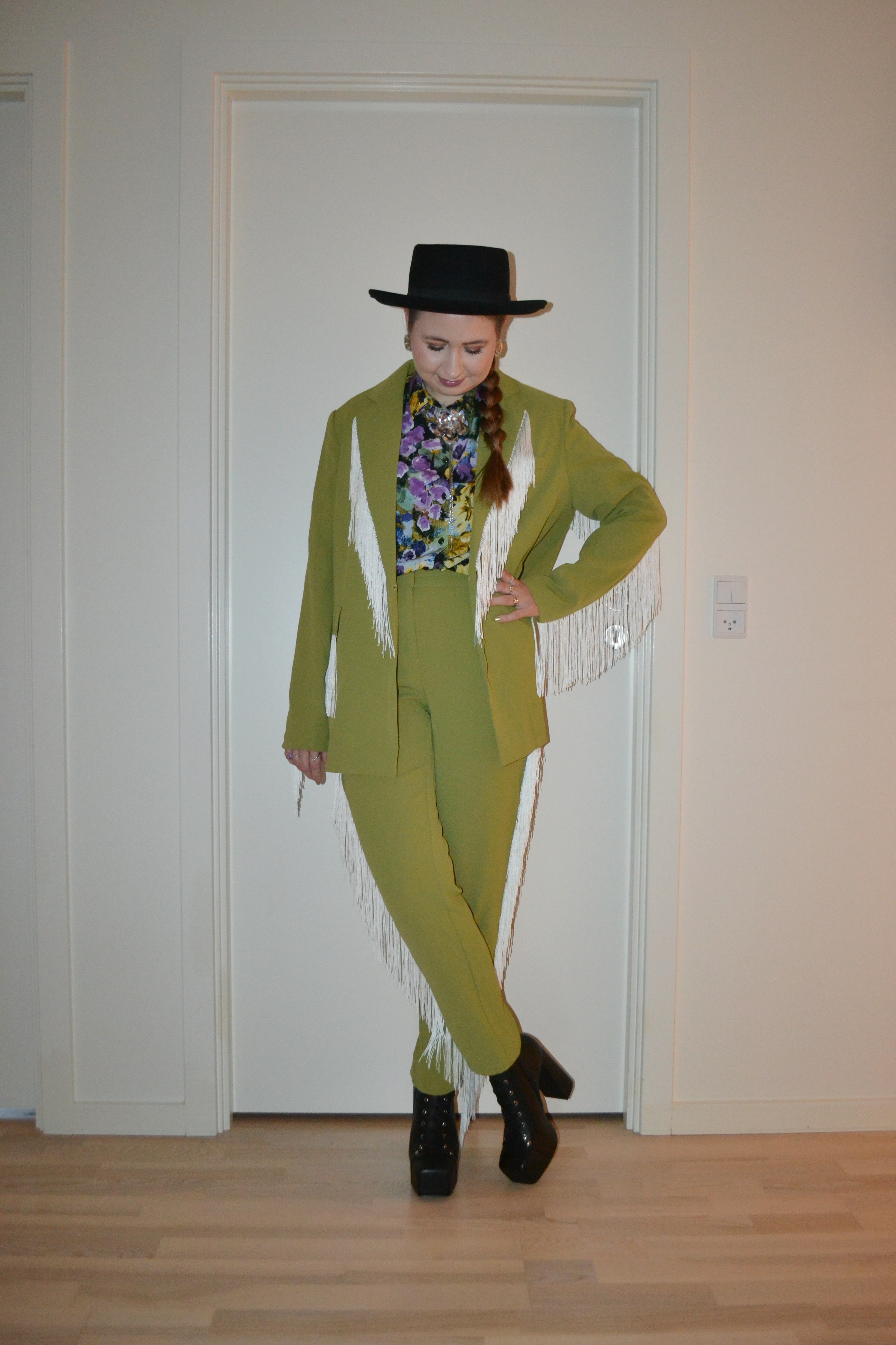 Fashion over practicality Posted on March 14, 2025 by Mucha-Lucha Here’s what I wore Friday October 25. The fringes might be a bit impractical, but it’s such a fun suit, so I don’t care. It’s fashion over practicality for me. (Hat – H&M, blazer + trousers – Extro & Vert, shirt – Monki, boots – Jeffrey Campbell) Share this: Click to share on X (Opens in new window) X Click to share on Facebook (Opens in new window) Facebook Like Loading... Related