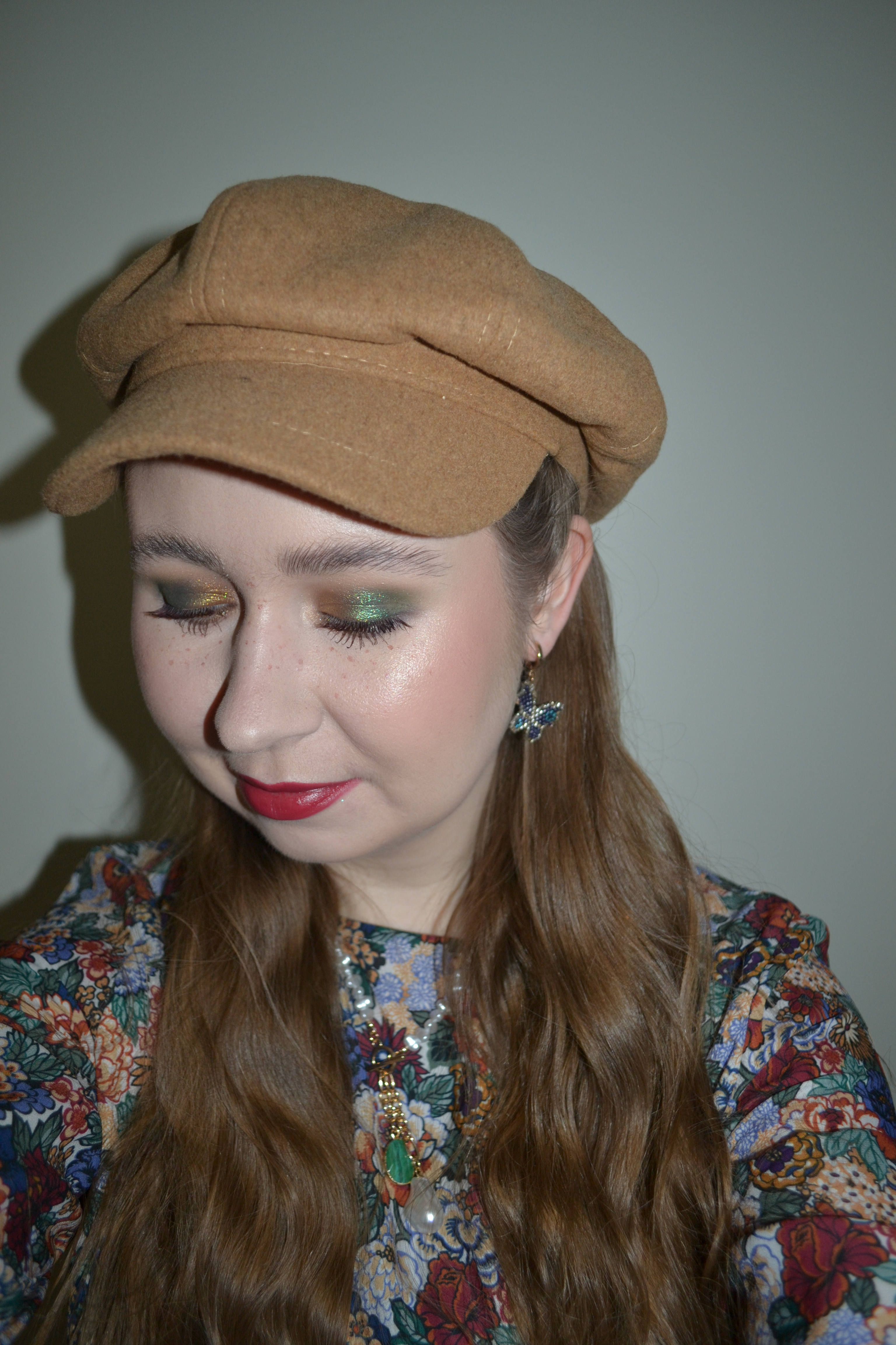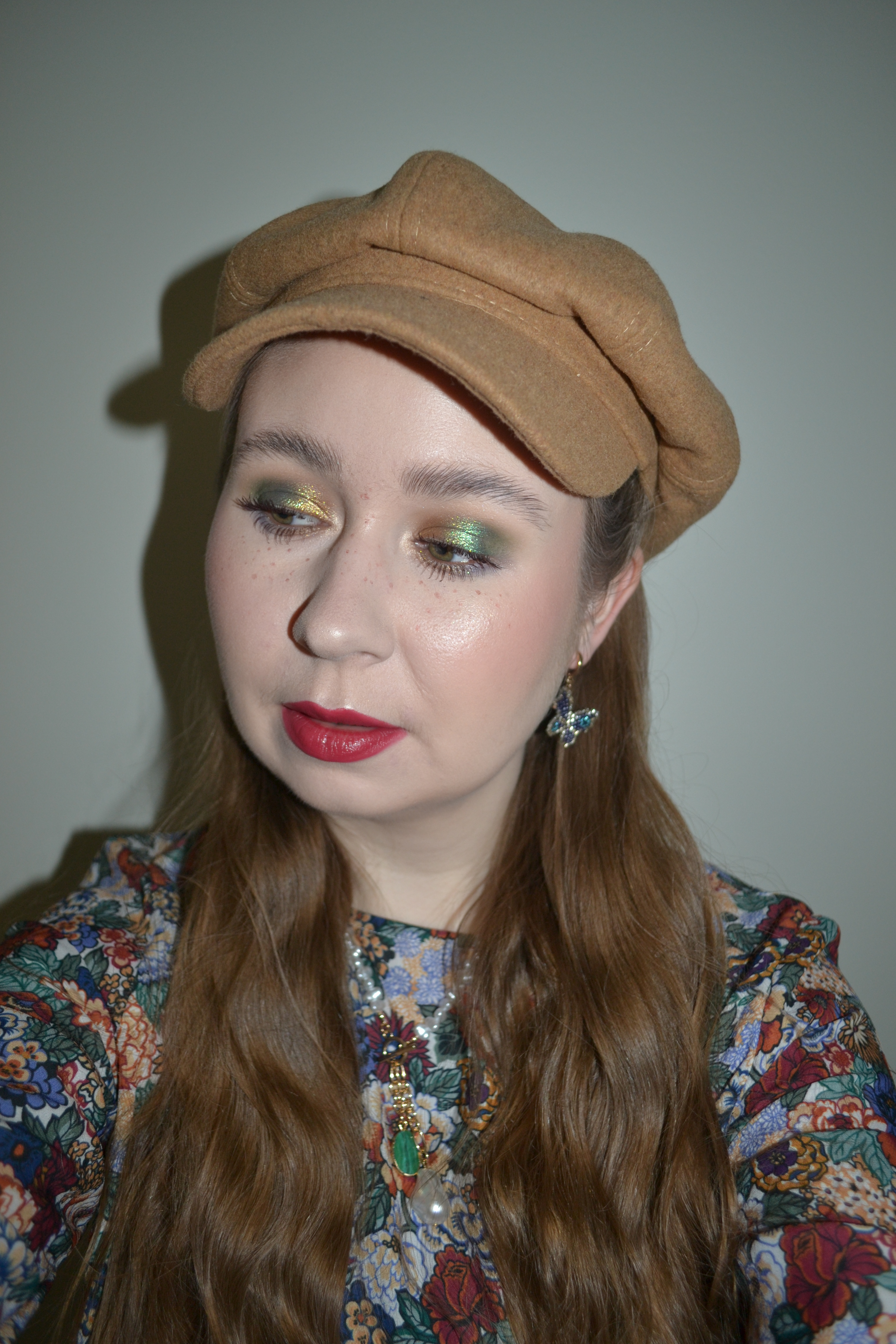 Here’s the make-up I wore with this outfit. I really like this look. I think the green/gold eyes paired with the berry lips and cheeks is such a pretty combo.