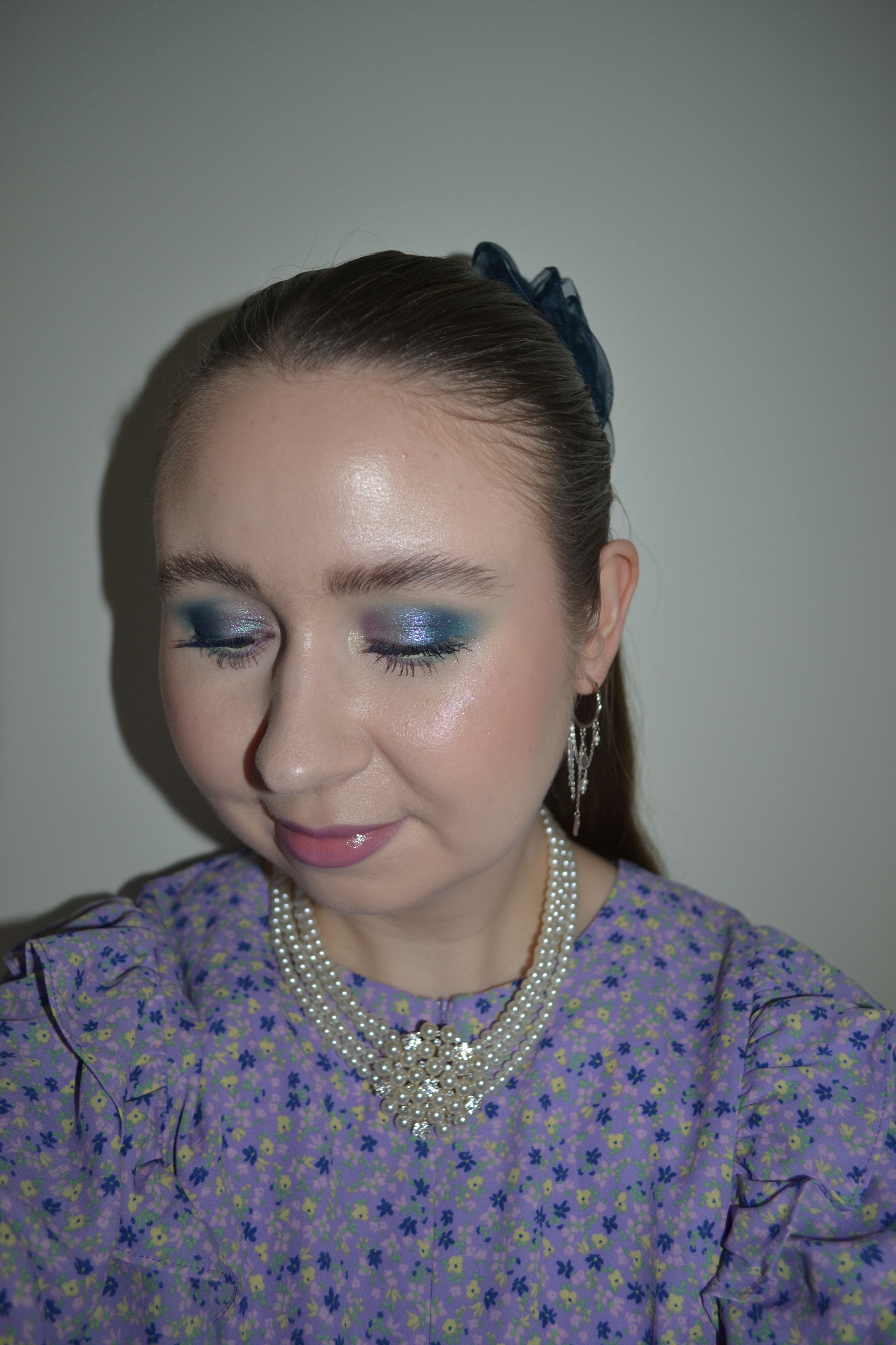 (Base: primer – e.l.f Cosmetics Power Grip primer + 4% Niacinamide, foundation – Rare Beauty Positive Light tinted moisturizer (shade: 14W), concealers – Rare Beauty Positive Light under eye brightener (shade: Light) + Huda Beauty #FAUXFILTER Luminous Matte liquid concealer (shade: 1.3G Marshmellow), powders – Essence Flawless Skin Trio loose setting powder in 10 + e.l.f. Cosmetics Halo Glow setting powder in Light. Face make-up: bronzer – RMS Beauty ReDimension Hydra bronzer in Beachwalk Betty, blush – Adept Cosmetics Duality blush palette (shades: Honey Never Spoils + Sometimes Violet), highlighter – Oden’s Eye Luminous highlighter in L103 Gentle Firefly. Eye make-up: base – MAC Pro Longwear Paint Pot in Painterly, eyeshadows – Essence eyeshadow in 20 Cream + Unearthly Cosmetics Gargole palette (shades: Grim Morning + Midnight + Darkest Hour + Night Watcher + Forgotten Fortress + Dismal Sky + Mystic Stone + Eerie Echoes), mascara – Kiko Milano Smart Colour mascara in 07 Navy Blue, eyeliner – Essence Wood You Love Me? Duo Eye Pencil in 01 Forever Together (light green shade). Eyebrows: MAC Shape + Shade brow tint in Taupe + Anastasia Beverly Hills Brow Freeze. Lips: MAC Liptensity lip pencil in Galaxy Grey + MAC Glow Play Tendertalk lip balm in Vibe)