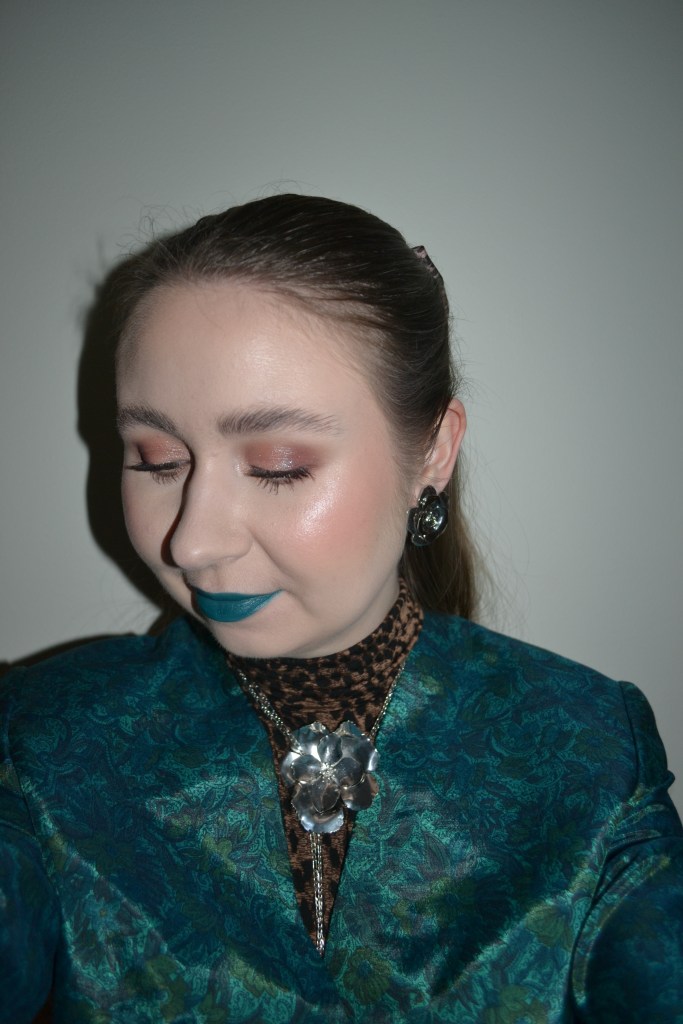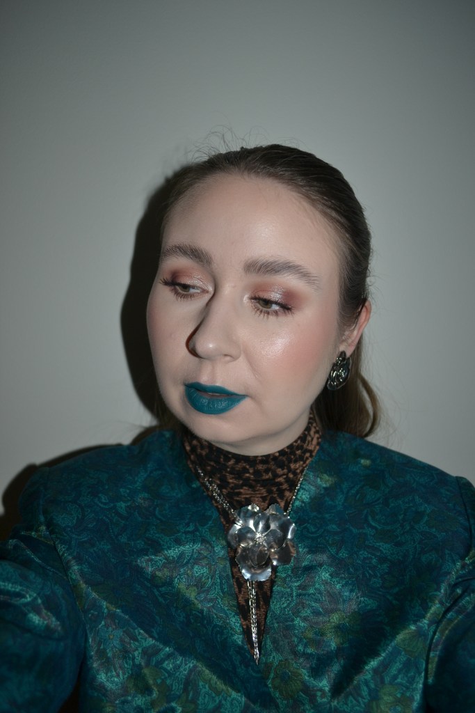 Here’s the make-up I wore with this outfit. I wanted to create a simple and quick-ish make-up look that day, since I was working from home, but I still wanted the look to be fun, so I put on a teal green lipstick to match my blazer.
