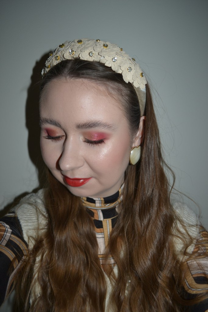 (Base: primers – Huda Beauty Glowish Blur Jam silicone-free smoothing primer + Dior Forever Star Glow Filter (shade: 0N), foundation – Fenty Beauty Eaze Drop blurring skin tint (shade: 2), concealers – Rare Beauty Positive Light under eye brightener (shade: Light) + Fenty Beauty We’re Even hydrating longwear concealer (shade: 120N), powders – Essence Brighten Up! Banana powder in 10 Bababanana + Kiko Milano Radiant Fusion baked powder in 01. Face make-up: bronzer – Glam Shop Z Fioletem bronzer in Chocolate, blush – Danessa Myricks Beauty Yummy Skin Blurring Balm Powder Flushed in Spiced Latte, highlighter – Glam Shop Z Fioletem highlighter in Mist. Eye make-up: base – Sigma Beauty Eyeshadow Base Primer in Ignite, eyeshadows – Glam Shop Zlota Era palette (shades: Hel + Cygaretka + Burleska + Boa + V.I.P. + Era + Glam Shop Z Fioletem highlighter in Mist (inner corners), mascara – Rimmel Kind & Free Lash Loader mascara (shade: 002 Brown Black), eyeliner – Nyx Slim eye pencil in Light Brown. Eyebrows: MAC Shape + Shade brow tint in Taupe + Anastasia Beverly Hills Brow Freeze. Lips: MAC Chili Rimmed lip pencil + MAC Lustreglass sheer-shine lipstick in Chili Popper)