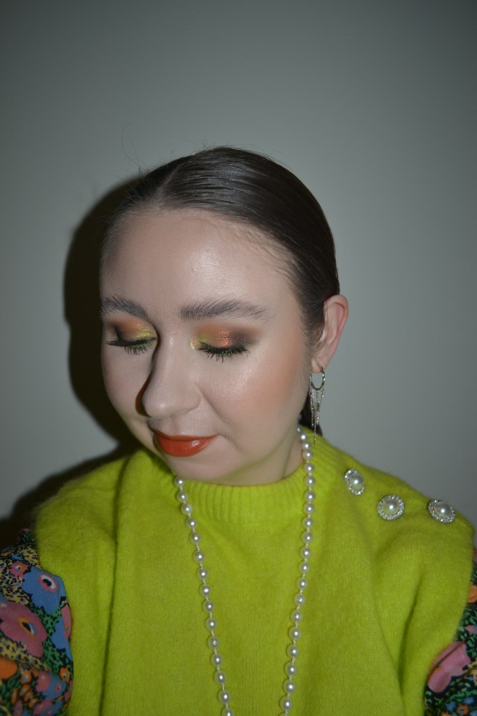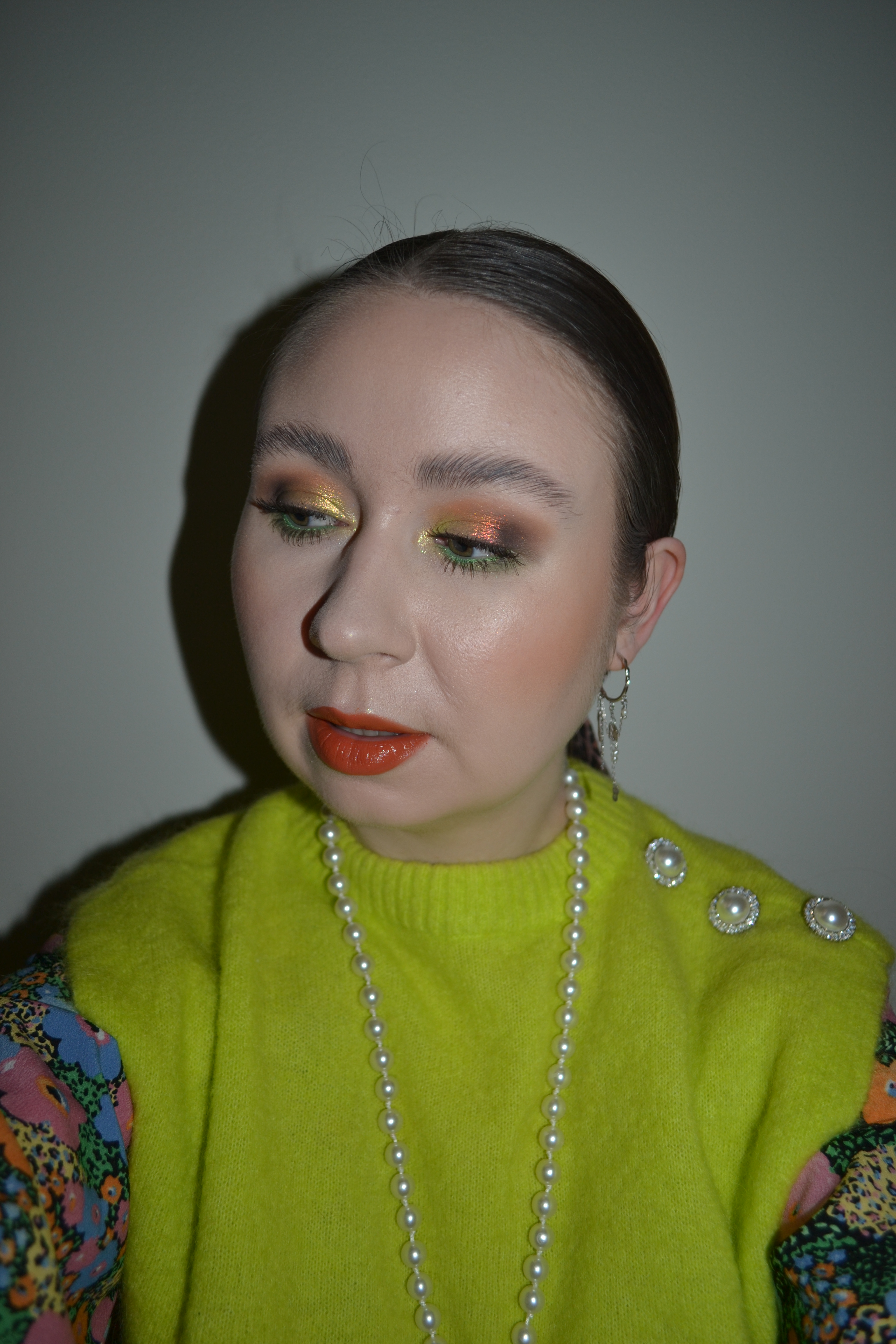 Here’s the make-up I wore with this outfit. This is another very yummy make-up look if you ask me. The warm oranges with the pops of green just look so pretty together.