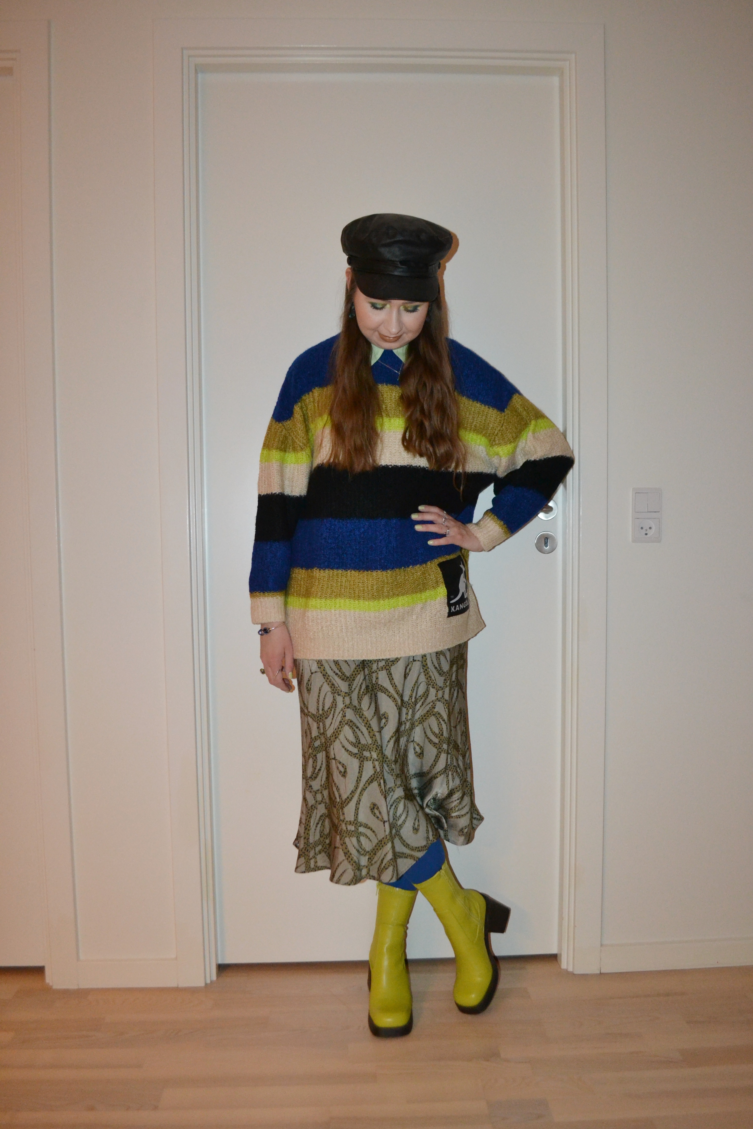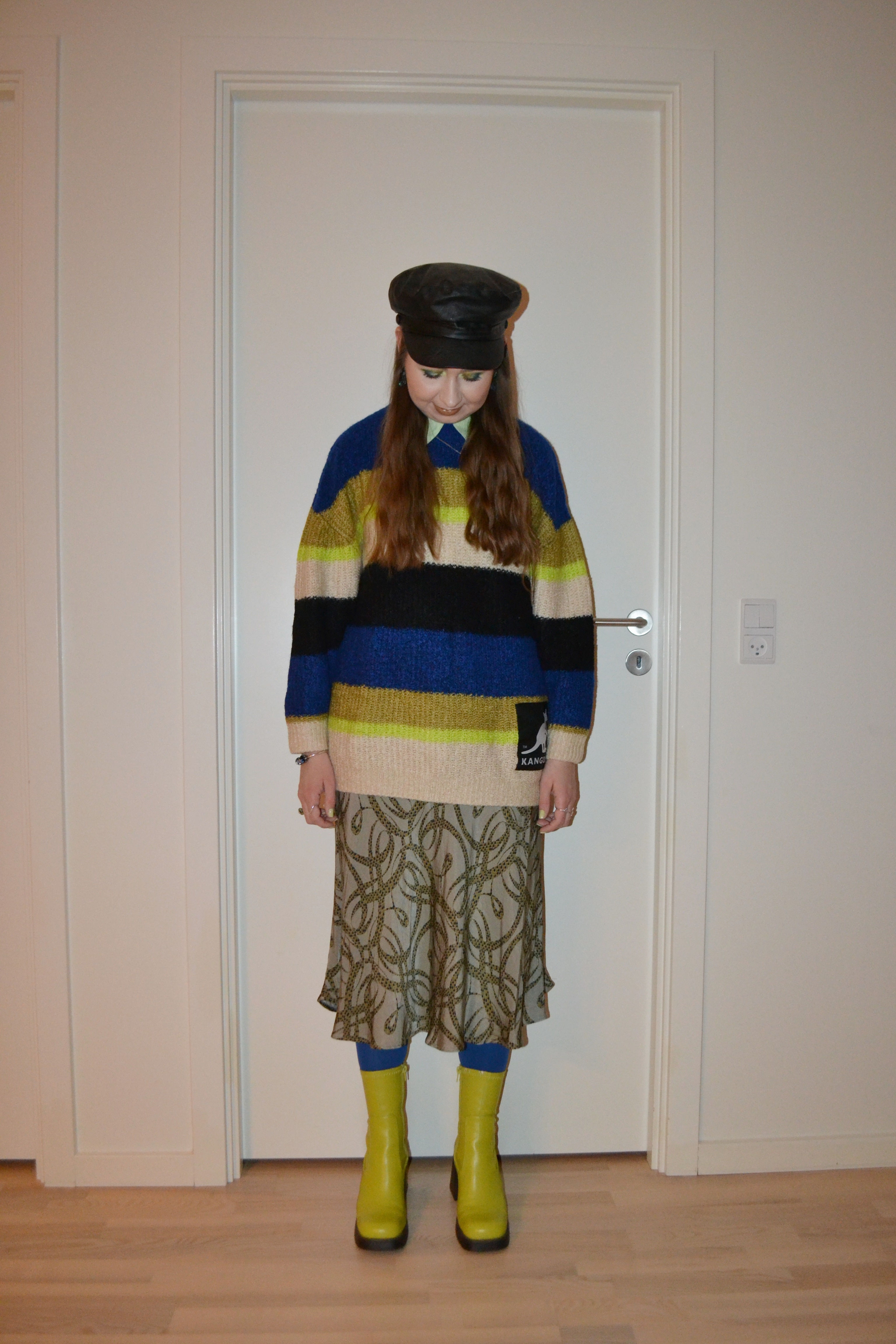 (Hat – Topshop, shirt – Monki, jumper + skirt – H&M, tights – Sneaky Fox, boots – Asos Design)