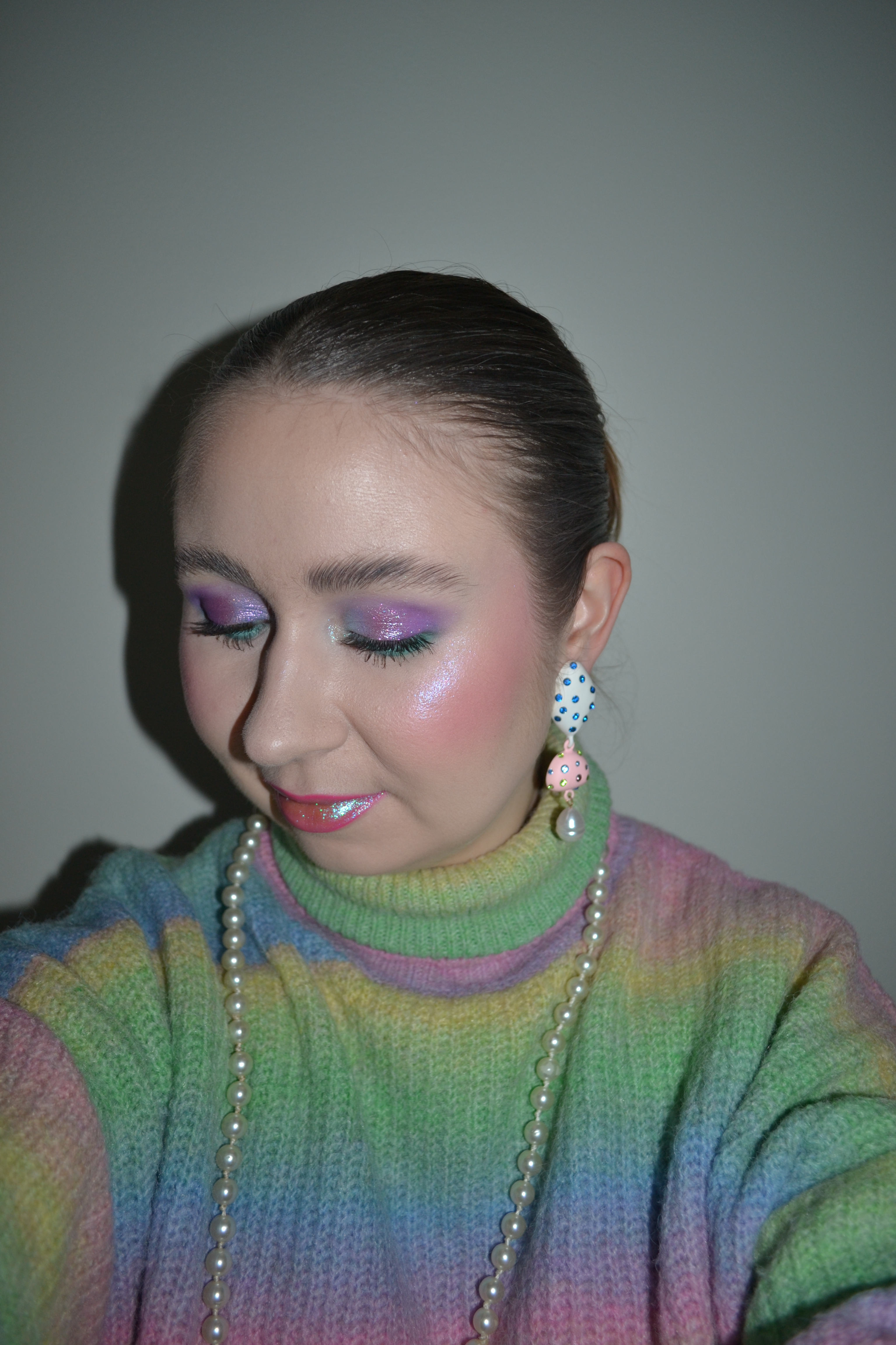 Here’s the make-up I wore with this outfit. I love this eye look, but I do have a soft spot for purples and greens and any pastel shade.