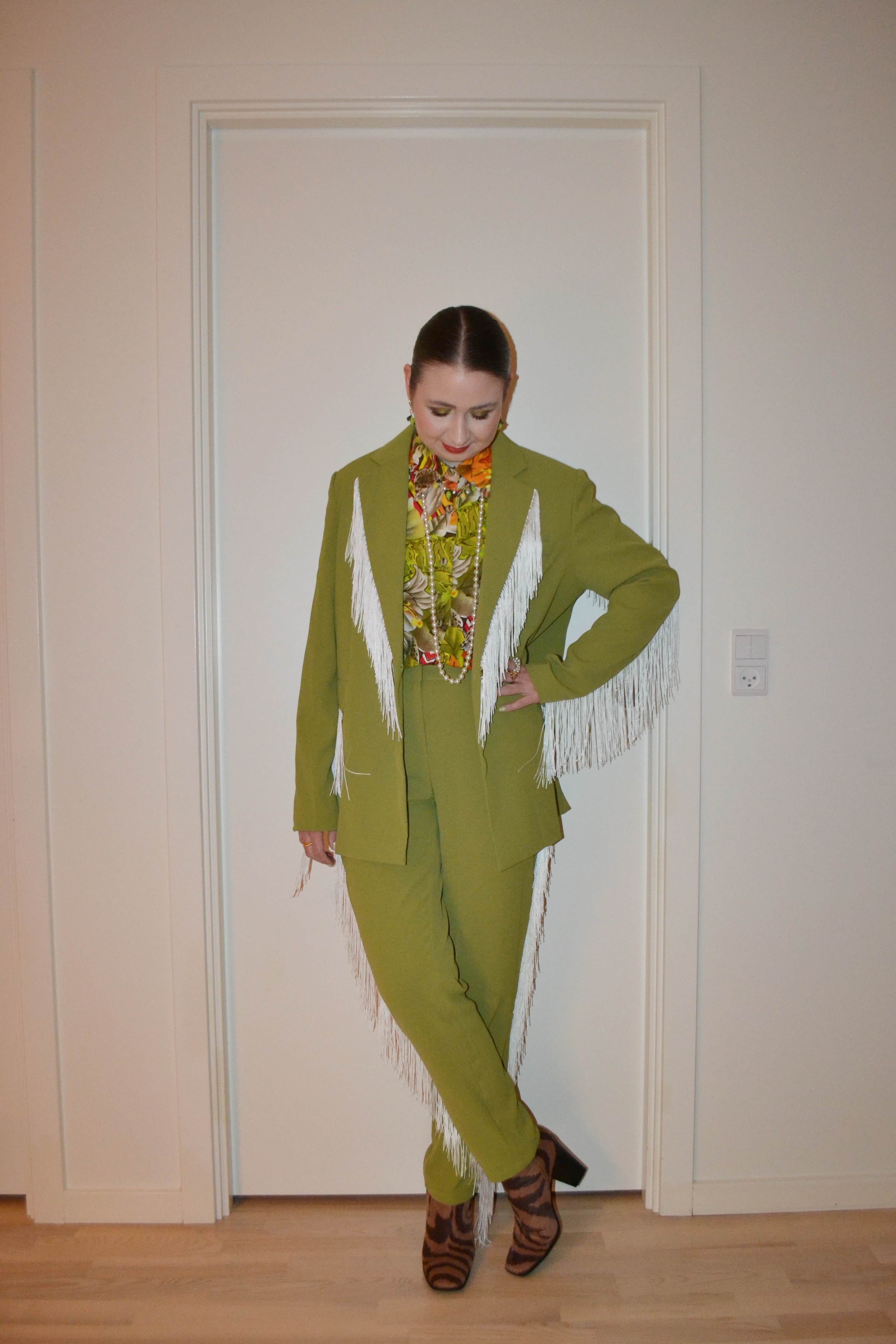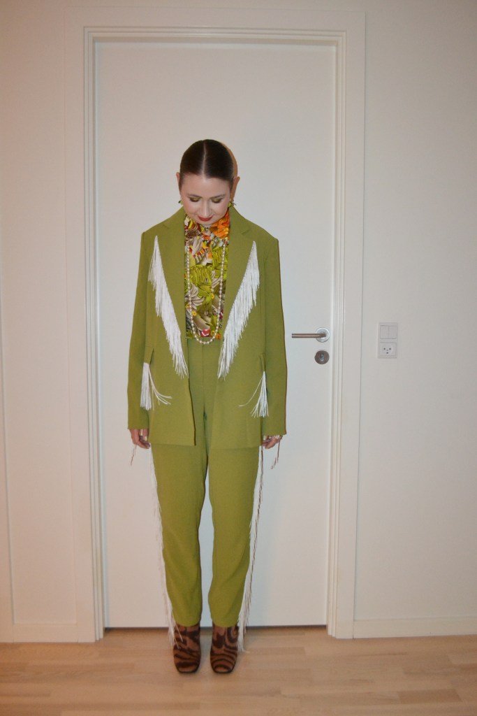 Warm and earthy colour scheme Posted on April 29, 2025 by Mucha-Lucha Here’s what I wore Friday January 24. I really wanted to style up this fringe suit again, and I really like the warm, earthy colour scheme of the look. (Blazer + trousers – Extro & Vert, shirt – second hand, boots – Monki) Share this: Click to share on X (Opens in new window) X Click to share on Facebook (Opens in new window) Facebook Like Loading... Related