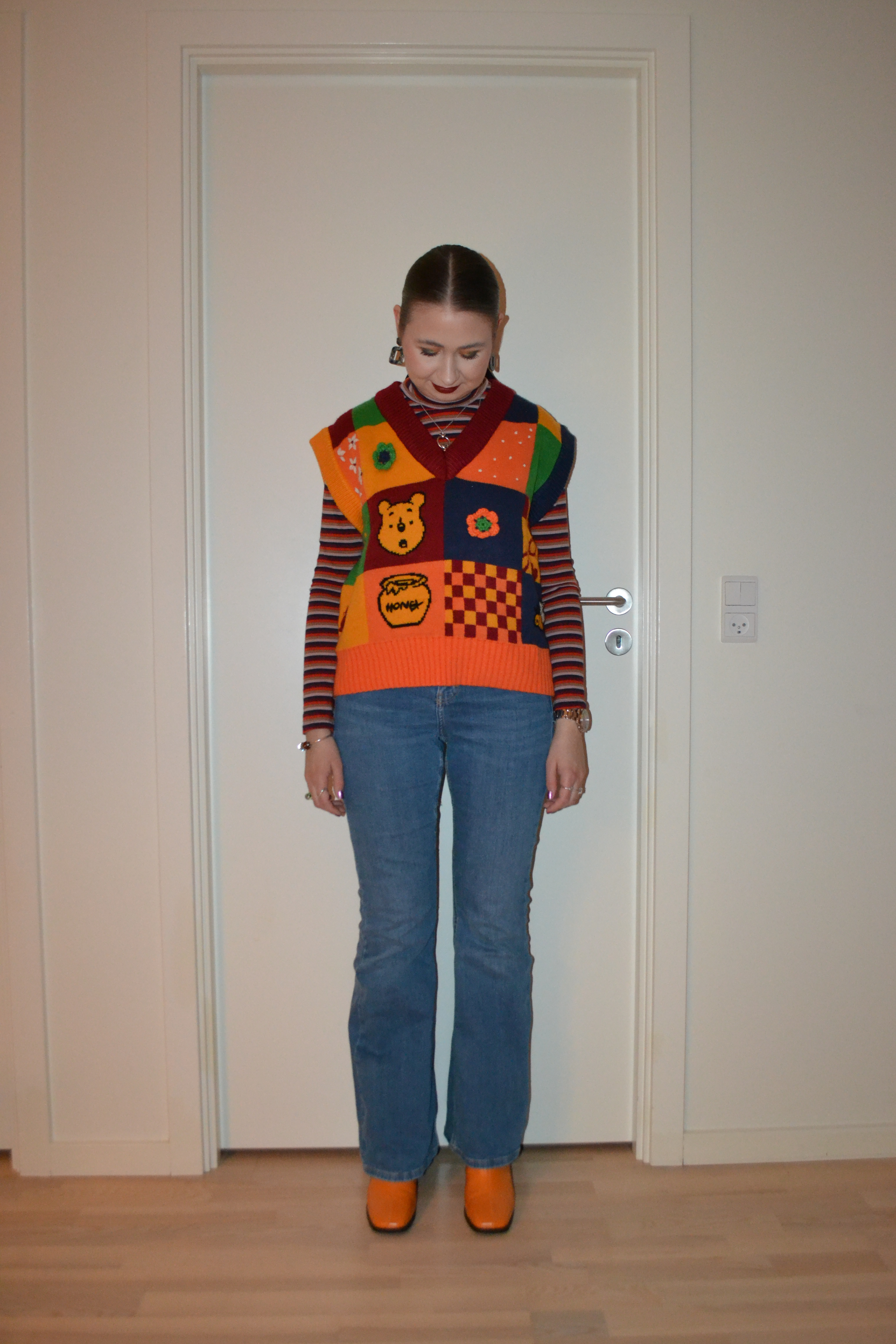 Here’s what I wore Friday February 28. I hadn’t worn my Winnie the Pooh sweater vest in quite a while, so I decided to just wear it over a roll neck top with jeans and boots. The autumnal colours of the sweater vest are so yummy that it works with a simple outfit.