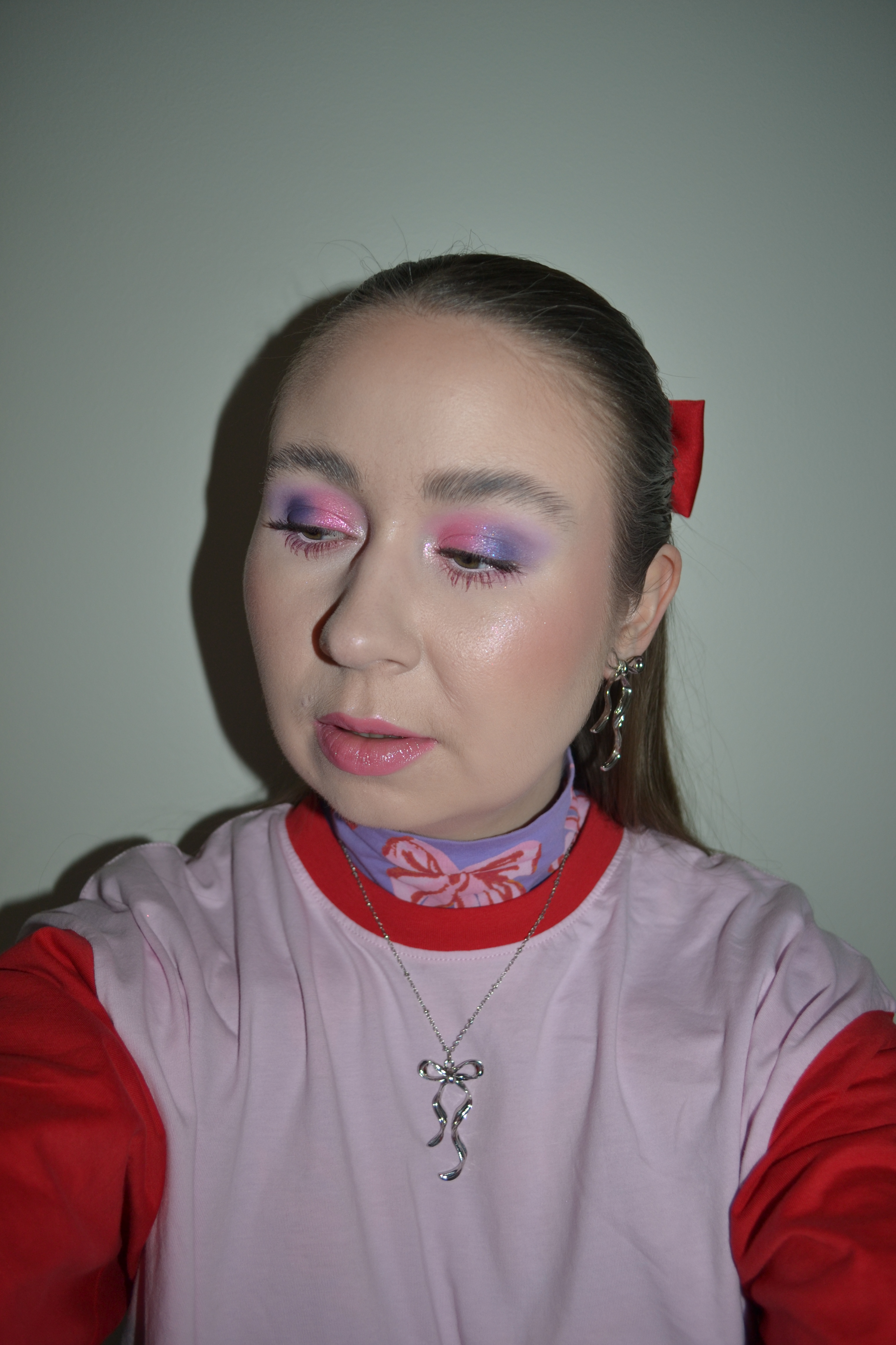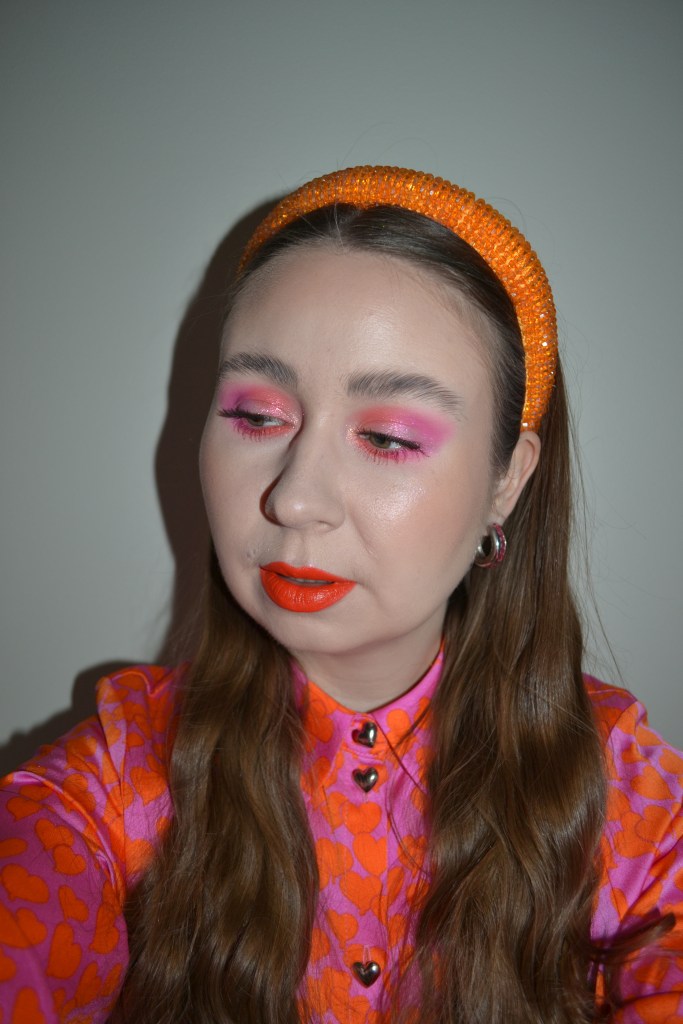 (Base: primer – e.l.f. Cosmetics Liquid Poreless Putty primer, foundation – Rare Beauty Positive Light tinted moisturizer (shade: 14W), concealers – Rare Beauty Positive Light under eye brightener (shade: Light) + Huda Beauty #FAUXFILTER Luminous Matte liquid concealer (shade: 1.3G Marshmellow), powder – Rare Beauty Always An Optimist Soft Radiance setting powder in Light. Face make-up: bronzer – e.l.f. Cosmetics Halo Glow Beauty Wand contour in Fair/Light, blush – Huda Beauty Liquid Blush Filter in Ube Cream, highlighter – Made By Mitchell Blursh Glaze in Sprinkles. Eye make-up: eyeshadows – Colourpop Super Shock shadow in Bae + KVD Beauty Dazzle Stick long-wear eyeshadow in Dusk Rush + Colourpop Frosty the Snowman Jelly Much eyeshadow in Made Of Snow, mascara – Catrice Pure Volume Magic Brown mascara (shade: 010 Burgundy Brown), eyeliner – Lethal Cosmetics Aura multichrome liner in Hypnotic. Eyebrows: MAC Shape + Shade brow tint in Taupe + e.l.f. Cosmetics Brow Lift. Lips: Rare Beauty Kind Words matte lip liner in Devoted + Colourpop Blotted Lip in Purr)