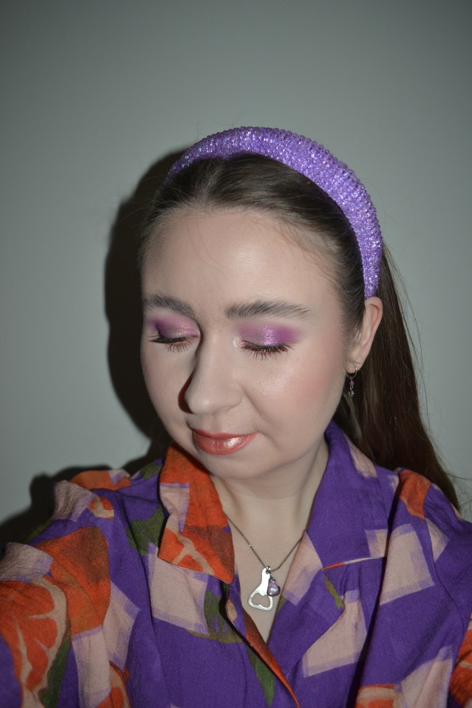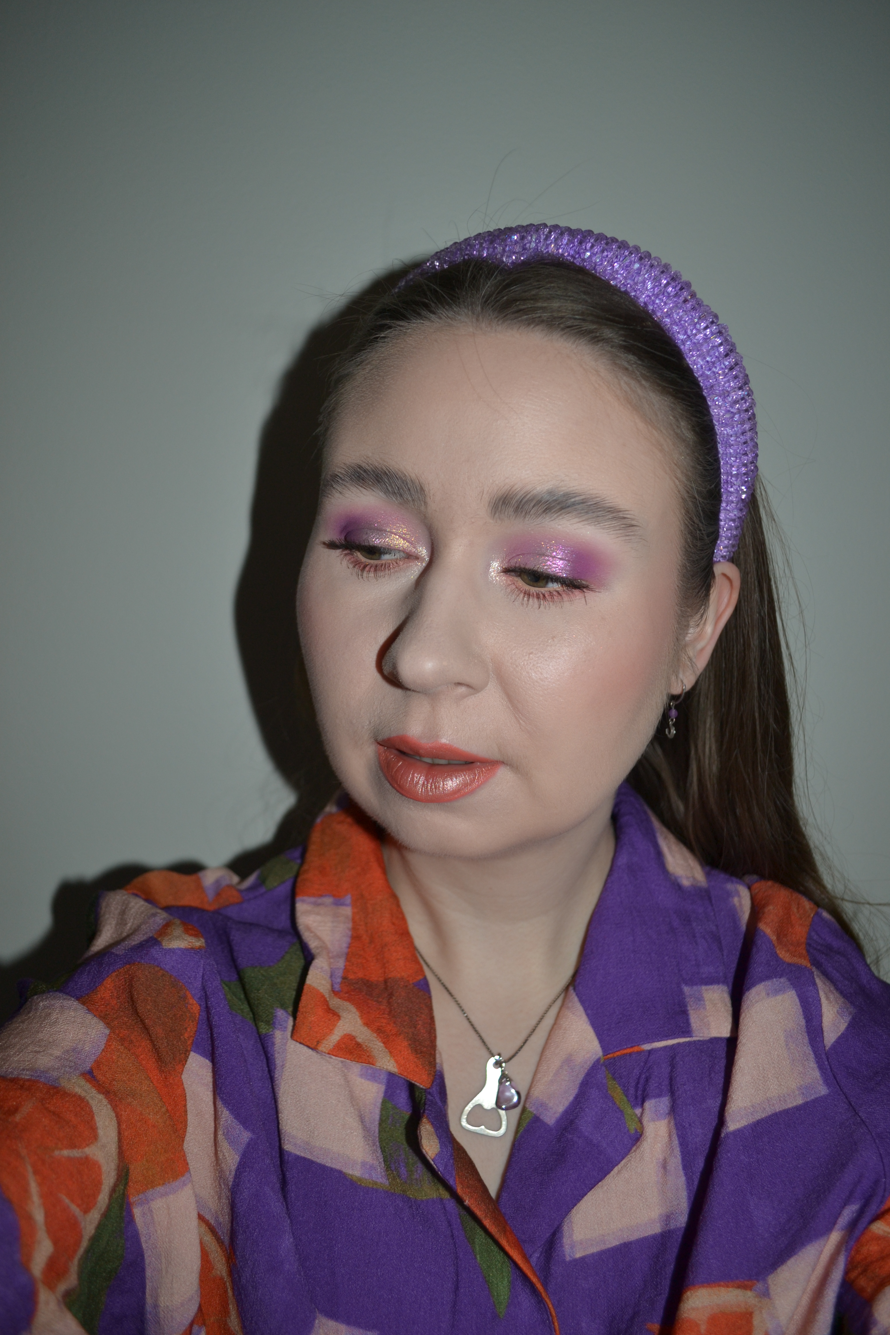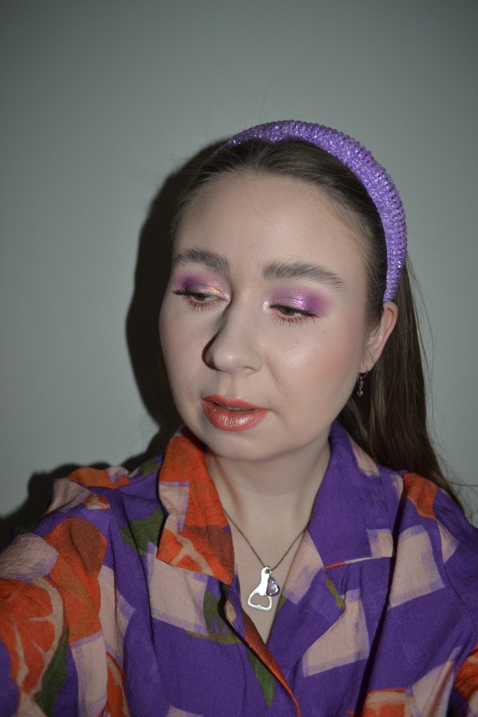 (Base: primers – KVD Beauty Lock It pore-refining primer + Dior Forever Star Glow Filter (shade: 0N), foundation – Maybelline Superstay Lumi Matte foundation (shade: 96), concealers – e.l.f. Cosmetics Putty Color-Correcting Eye Brightener (shade: Fair) + Huda Beauty #FAUXFILTER Luminous Matte liquid concealer (shade: 1.3G Marshmellow), powders – Laura Mercier Translucent Loose Setting Powder Tone Up in Rose + e.l.f. Cosmetics Halo Glow setting powder in Light. Face make-up: bronzer – e.l.f. Cosmetics Camo liquid bronzer & contour in Fair/Light, blush – Huda Beauty Liquid Blush Filter in Sunset Lychee, highlighter – Maybelline Sunkisser highlighter in 22 Star Studded. Eye make-up: base – MAC Pro Longwear Paint Pot in Painterly, eyeshadows – Glaminatrix Cosmetics Rich Romantic palette (shades: Intoxicating + Cherish + Intimate + Devotion + Magnetic + Rich + Romantic + Captivating), mascara – Rimmel Kind & Free Lash Loader mascara (shade: 002 Brown Black), eyeliner – Revolution x Bratz Sasha eye pencil. Eyebrows: MAC Shape + Shade brow tint in Taupe + e.l.f. Cosmetics Brow Lift. Lips: MAC Fruit Cocktail lip pencil + Make Up Store metallic liquid lipstick in Queen)