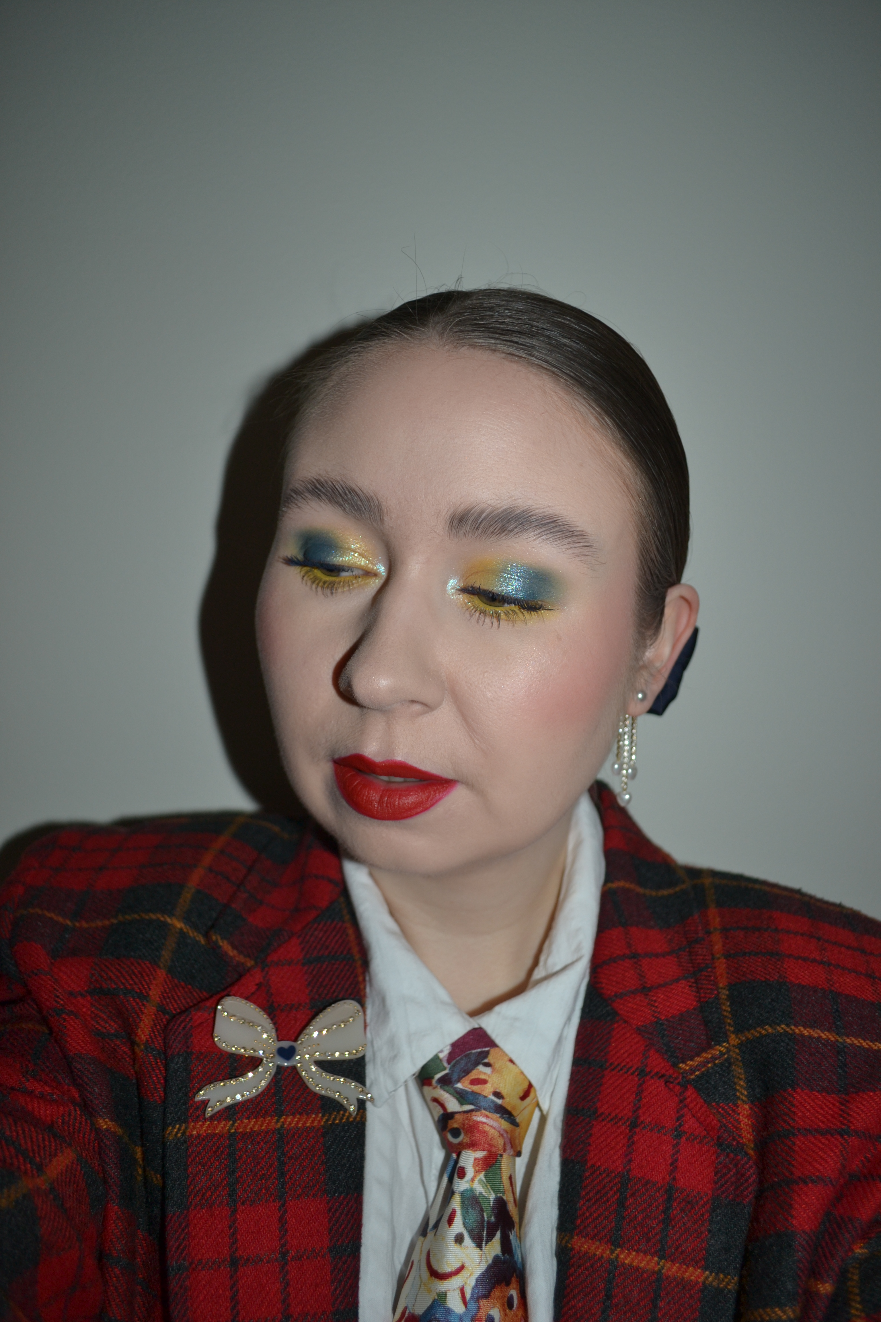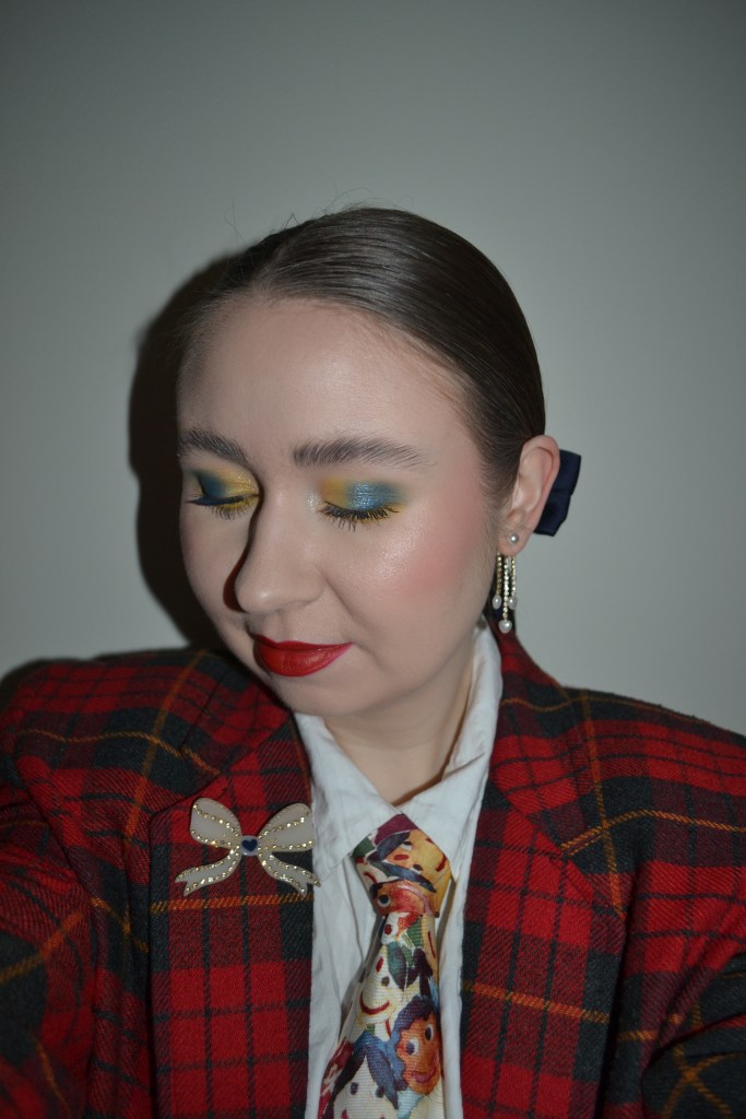 (Base: primer – Colourpop Pretty Fresh Set It Up primer, foundation – L’Oréal Paris True Match Nude plumping tinted serum (shade: 0,5-2 Very Light), concealers – Rare Beauty Positive Light under eye brightener (shade: Light) + Catrice Instant Bright serum concealer in (shade: 002N), powders – Essence Brighten Up! Banana powder in 10 Bababanana + Bobbi Brown Sheer Finish pressed powder in Soft Porcelain. Face make-up: bronzer – Essence Baby Got Bronze shimmering bronzer in 10 Golden Hour, blush – Huda Beauty Cheeky Tint blush stick in Rebel Red, highlighter – L’Oréal Lumi Le Glow highlighter stick in 630 Glowy Créme Chic. Eye make-up: base – Sigma Beauty Eyeshadow Base Primer in Ignite, eyeshadows – Essence eyeshadow in 20 Cream + Nomad Cosmetics Fuji Five Lakes intense color palette (shades: Yellow Poplar + Mount Hóei + Kóyó + Yamanakako + Golden Ginkgo + Diamond Fuji), mascara – Kiko Milano Smart Colour mascara in 07 Navy Blue, eyeliner – Oden’s Eye Solmåne gel liner in 003 Lemon. Eyebrows: MAC Shape + Shade brow tint in Taupe + e.l.f. Cosmetics Brow Lift. Lips: Natasha Denona I Need A Rouge lip crayon in Emilia + Cosmic Brushes Velvet matte lipstick in Santa Baby)