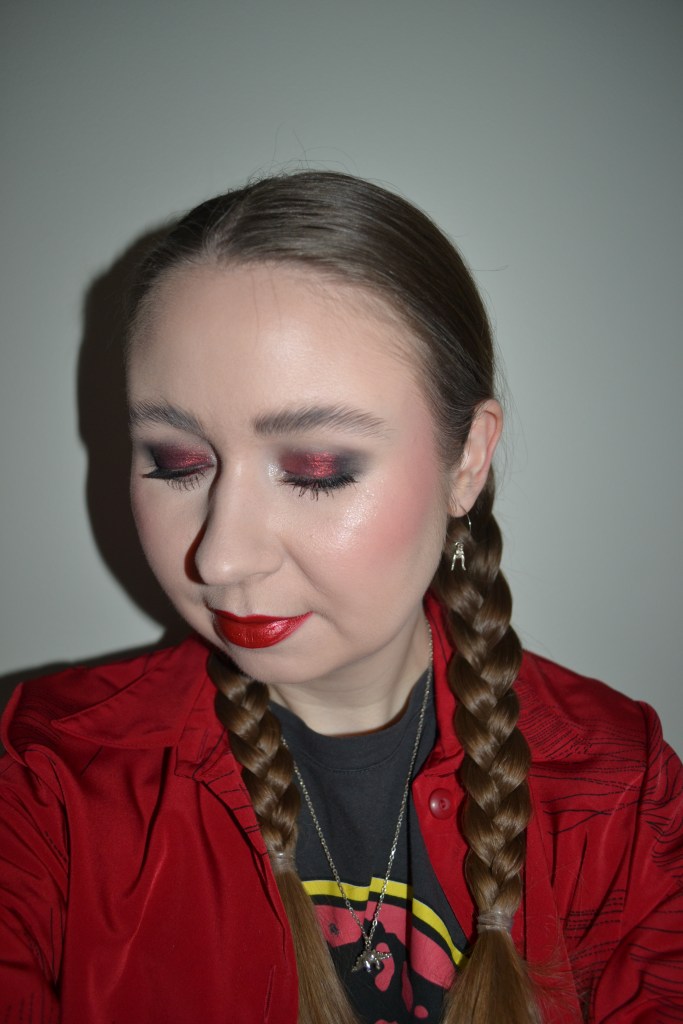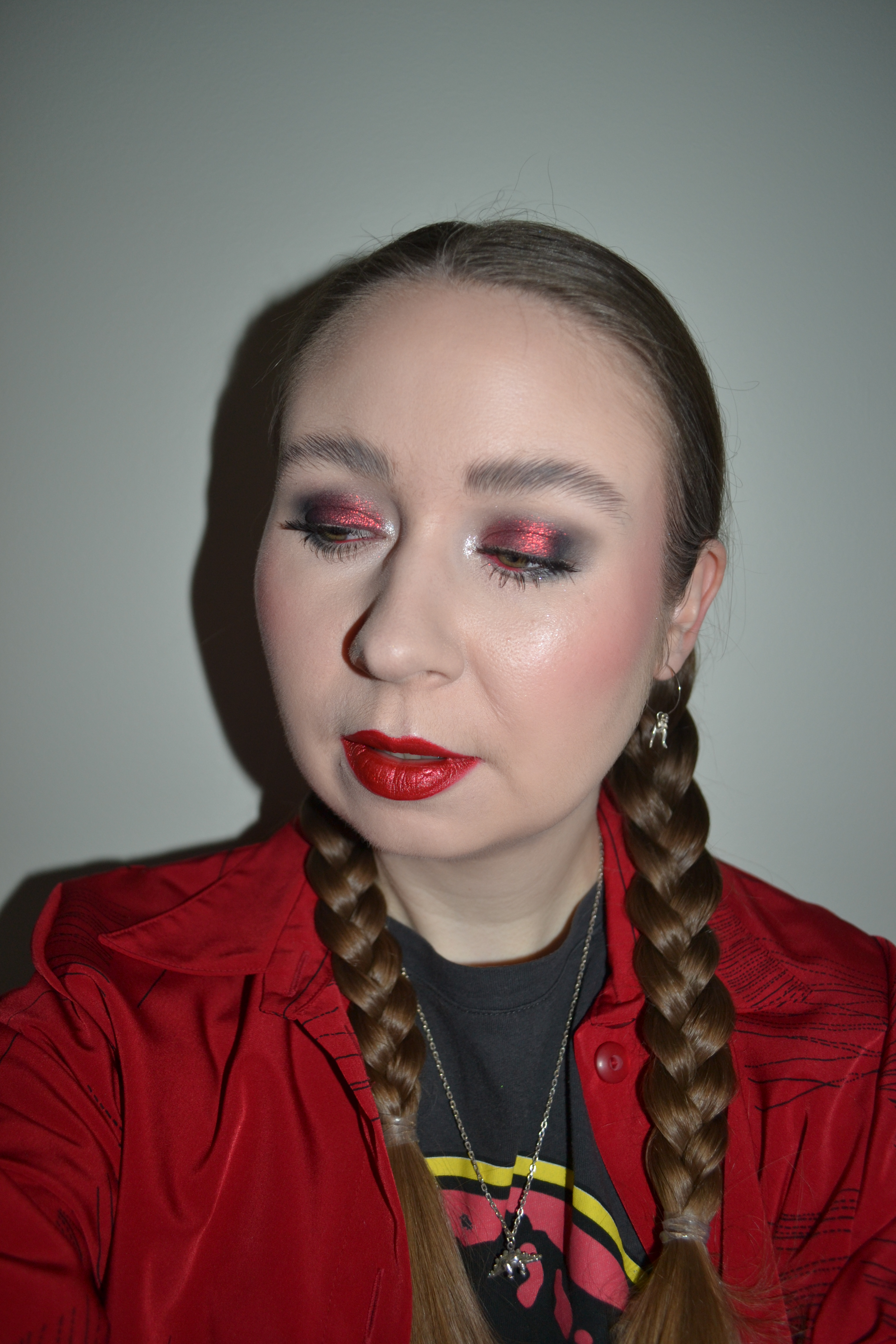 (Base: primers – KVD Beauty Lock It pore-refining primer + Rare Beauty Always An Optimist illuminating primer, foundation – Maybelline Superstay Lumi Matte foundation (shade: 96), concealers – Smashbox x Becca Under Eye Brightening Corrector in Fair/Light + Huda Beauty #FAUXFILTER Luminous Matte liquid concealer (shade: 1.3G Marshmellow), powders – Charlotte Tilbury Airbrush Brightening Flawless Finish powder (shade: Fair/Medium) + Charlotte Tilbury Airbrush Flawless Finish powder (shade: 1 Fair). Face make-up: bronzer – Charlotte Tilbury Hollywood Contour Wand in Fair-Medium, blush – Huda Beauty Liquid Blush Filters in Watermelon Pop + Strawberry Cream, highlighter – Jeffree Star Cosmetics Liquid Frost highlighter in Frostitute. Eye make-up: bases – MAC Pro Longwear Paint Pot in Painterly + NYX Glitter primer, eyeshadows – Essence eyeshadow in 20 Cream + Blend Bunny Cosmetics Longing palette (shades: Stolen Glance + Heartbreak + All That’s Left) + Oden’s Eye multichrome eyeshadow in M012 Leon, mascaras – MAC Extended Play Gigablack Lash mascara + Blend Bunny Cosmetics Omni Lash lash perfecting mascara, eyeliner – Oden’s Eye Solmåne gel liner in 014 Colourful Black + Colourpop High School Musical Crème gel liner in Spring Musical. Eyebrows: MAC Shape + Shade brow tint in Taupe + e.l.f. Cosmetics Brow Lift. Lips: Rare Beauty Kind Words matte lip liner in Devoted + Unearthly Cosmetics Menacing Metals lipstick in Bloodstone)