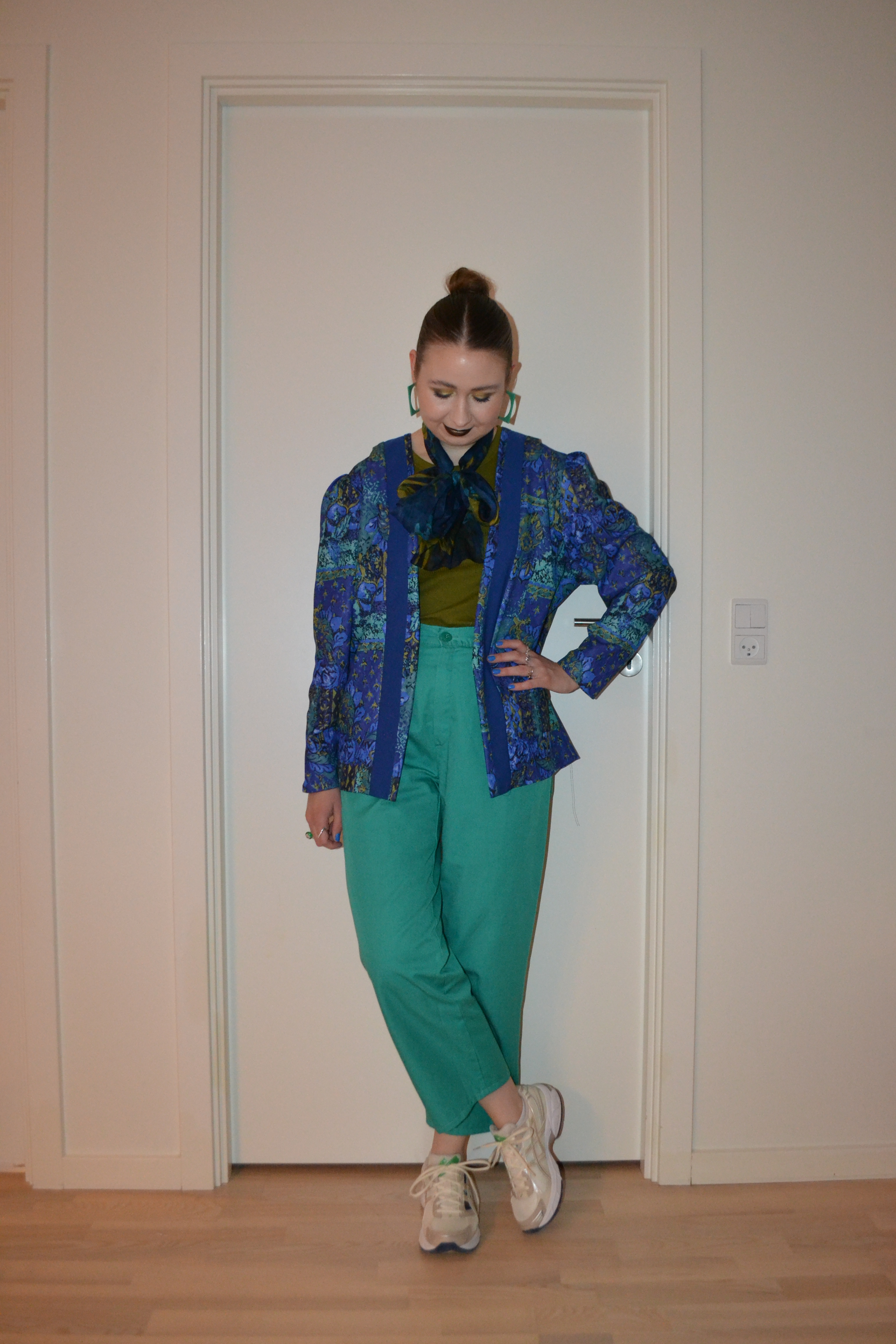 (Blazer/jacket + scarf + trousers – second hand, top – H&M, sneakers – Asics)