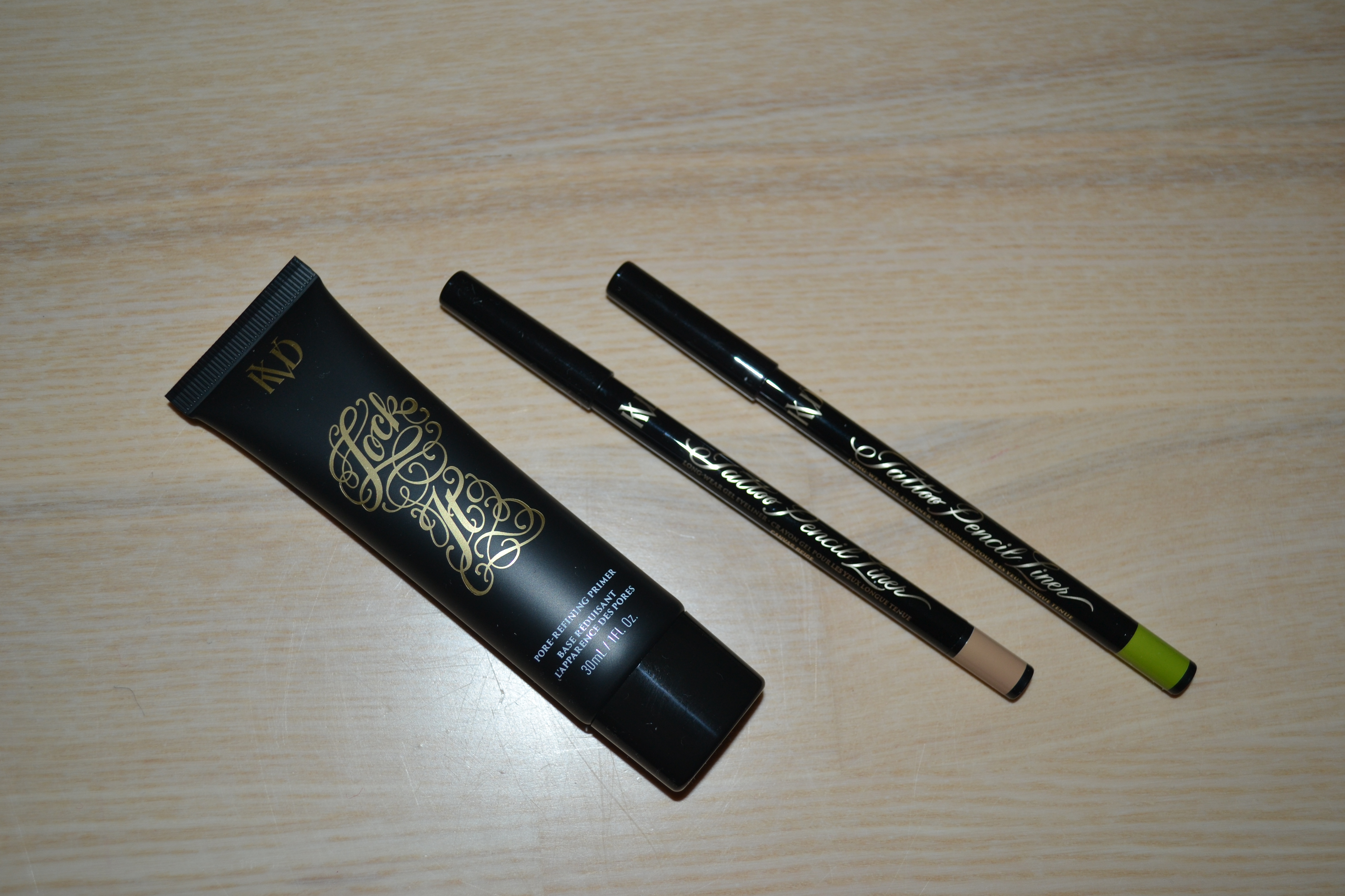 I also picked up the KVD Beauty Lock It pore-refining primer and two of the KVD Beauty Tattoo pencil liners in the shades Canvas Beige and Radium Green. The primer is nice, but the liners are horrible! I especially wanted the green shade to work so bad, but these liners are so stiff and they won’t show up in the waterline.