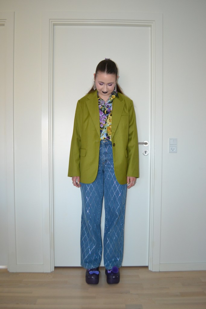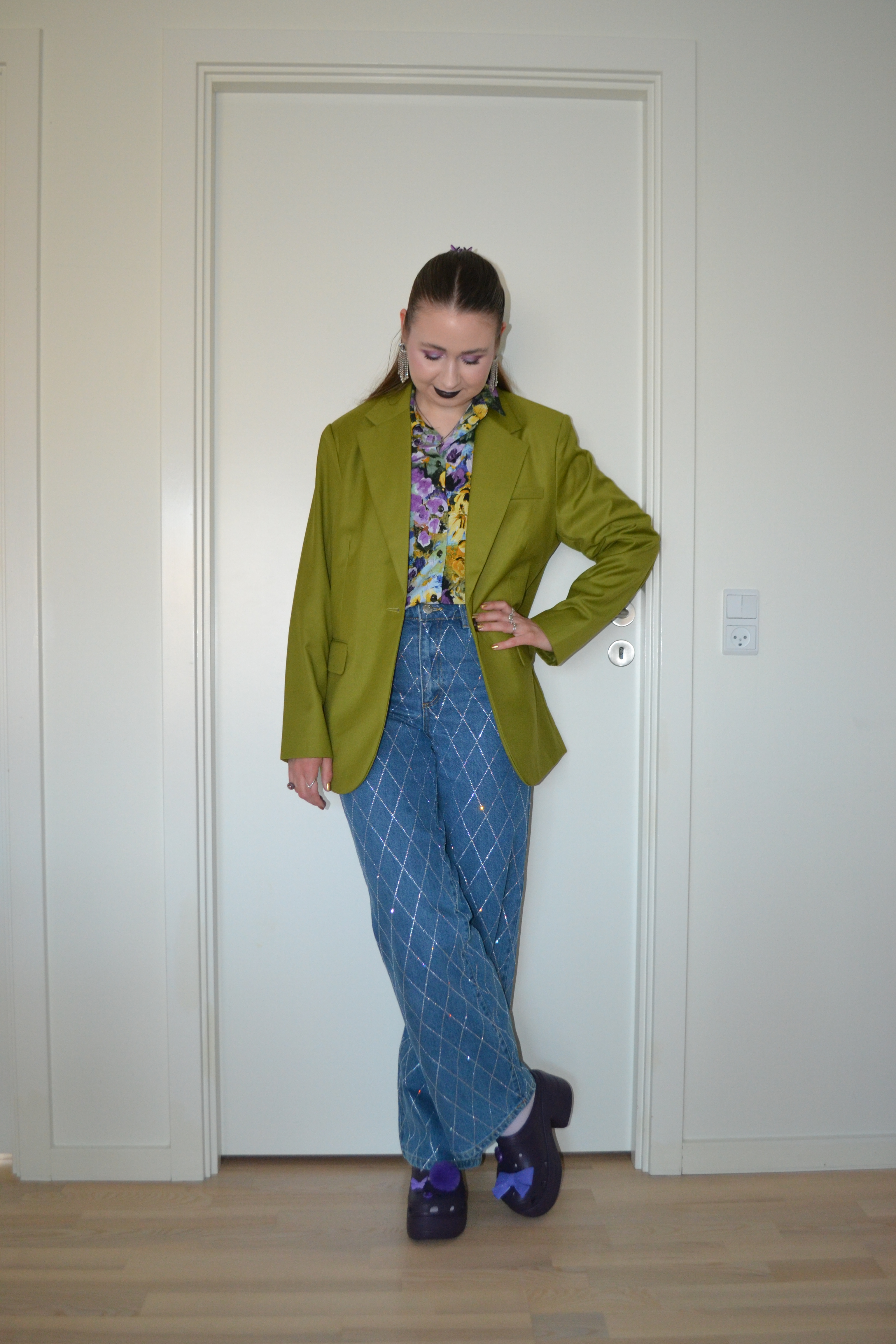 Rhinestones at work Posted on July 12, 2025 by Mucha-Lucha Here’s what I wore Monday May 5. I’d worn these rhinestone jeans for a dinner and drinks situation and on a lunch date, but this is how I’ve styled them for work. (Blazer – H&M, shirt – Monki, jeans – YAS, shoes – Crocs) Share this: Click to share on X (Opens in new window) X Click to share on Facebook (Opens in new window) Facebook Like Loading... Related
