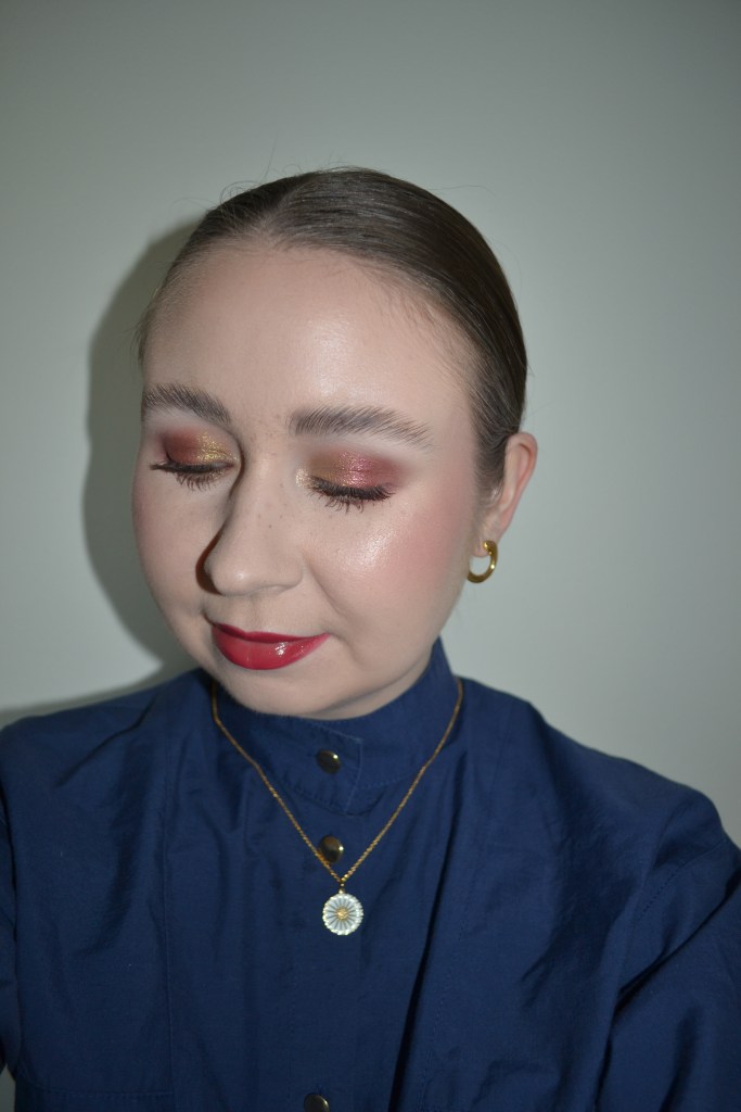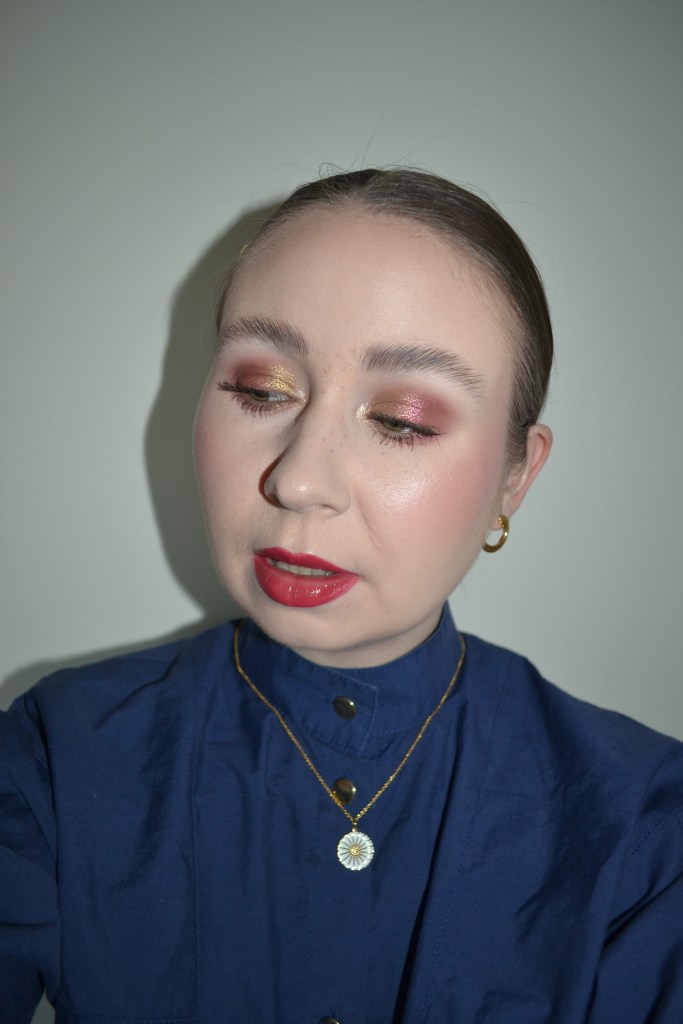 Here’s the make-up I wore with this outfit. This is not a kind of make-up look I wear very often. I think it gives off Christmas vibes, but I am wearing a Christmas themed eyeshadow palette, so it makes sense.