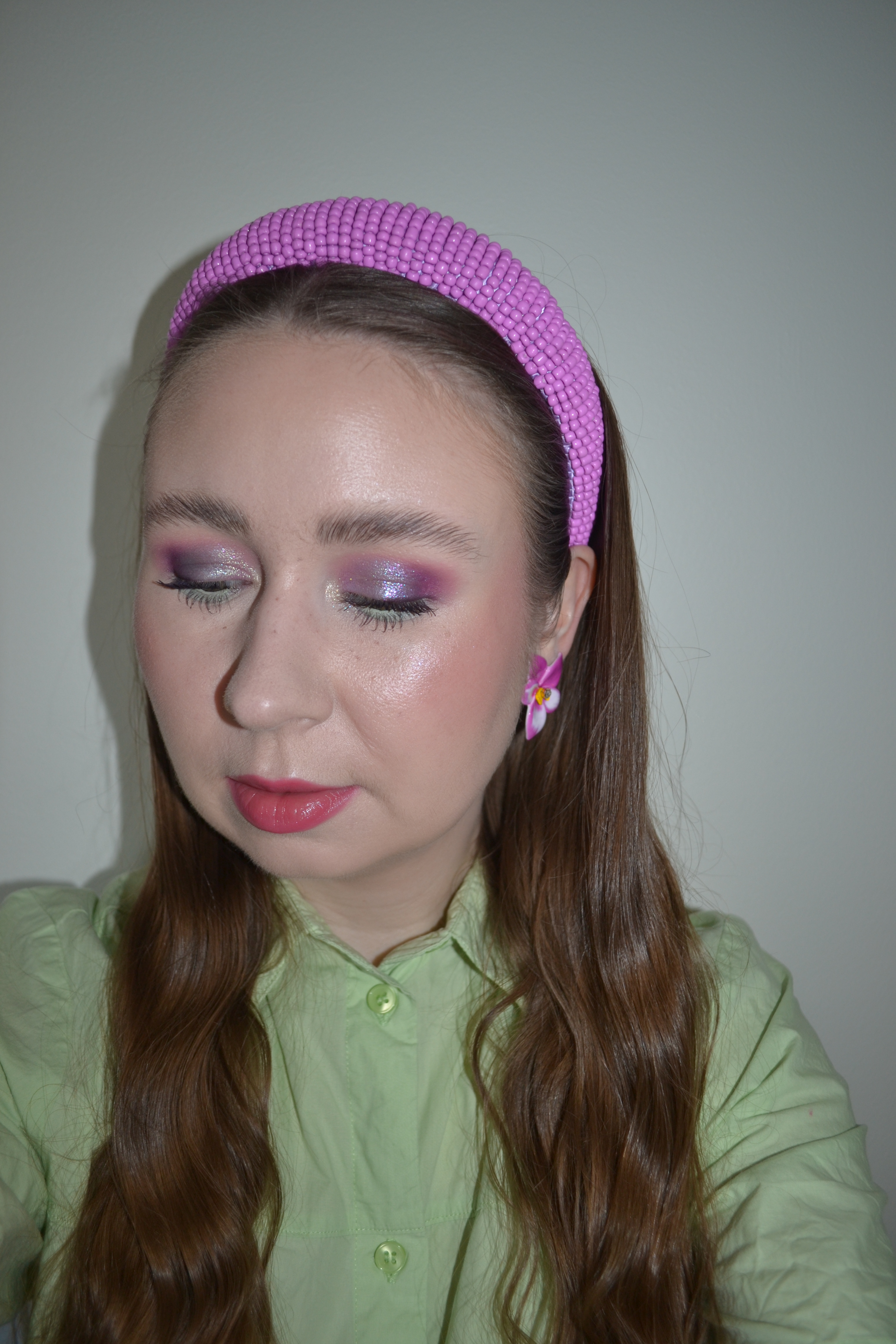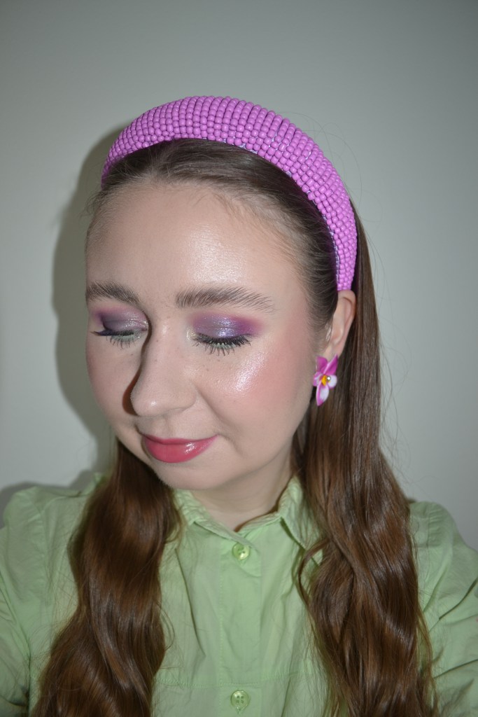 (Base: primer – e.l.f. Cosmetics Liquid Poreless Putty primer, foundation – Milk Makeup Hydro Grip gel tint (shade: 2), concealers – Rare Beauty Positive Light under eye brightener (shade: Light) + Huda Beauty #FAUXFILTER Luminous Matte liquid concealer (shade: 1.3G Marshmellow), powders – Laura Mercier Translucent Loose Setting Powder Tone Up in Rose + e.l.f. Cosmetics Halo Glow setting powder in Light, freckles – KimChi Chic Candy Girl Fake Freckles in Afternoon in The Flower Field. Face make-up: bronzer – e.l.f. Cosmetics Camo liquid bronzer & contour in Fair/Light, blush – MAC Strobe Beam liquid blush in Nitelite, highlighter – Made By Mitchell Blursh Lights liquid highlighter in Clear As Day. Eye make-up: base – MAC Pro Longwear Paint Pot in Painterly, eyeshadows – Arttitude Cosmetics Ink & Roses palette (shades: Sepia + Love + Roses + Thorn + Bloom + Ink + Whisper + Eternal), mascara – Maybelline Lash Sensational Sky High mascara (shade: Plum Twilight), eyeliner – Essence Wood You Love Me? Duo Eye Pencil in 01 Forever Together (light green shade). Eyebrows: MAC Shape + Shade brow tint in Taupe + Anastasia Beverly Hills Brow Freeze. Lips: Essence In The Bloom’light matte lip liner in 01 Live In Full Bloom + Catrice Pixar Finding Dory balmy lipstick in 010 Turtle Tales)