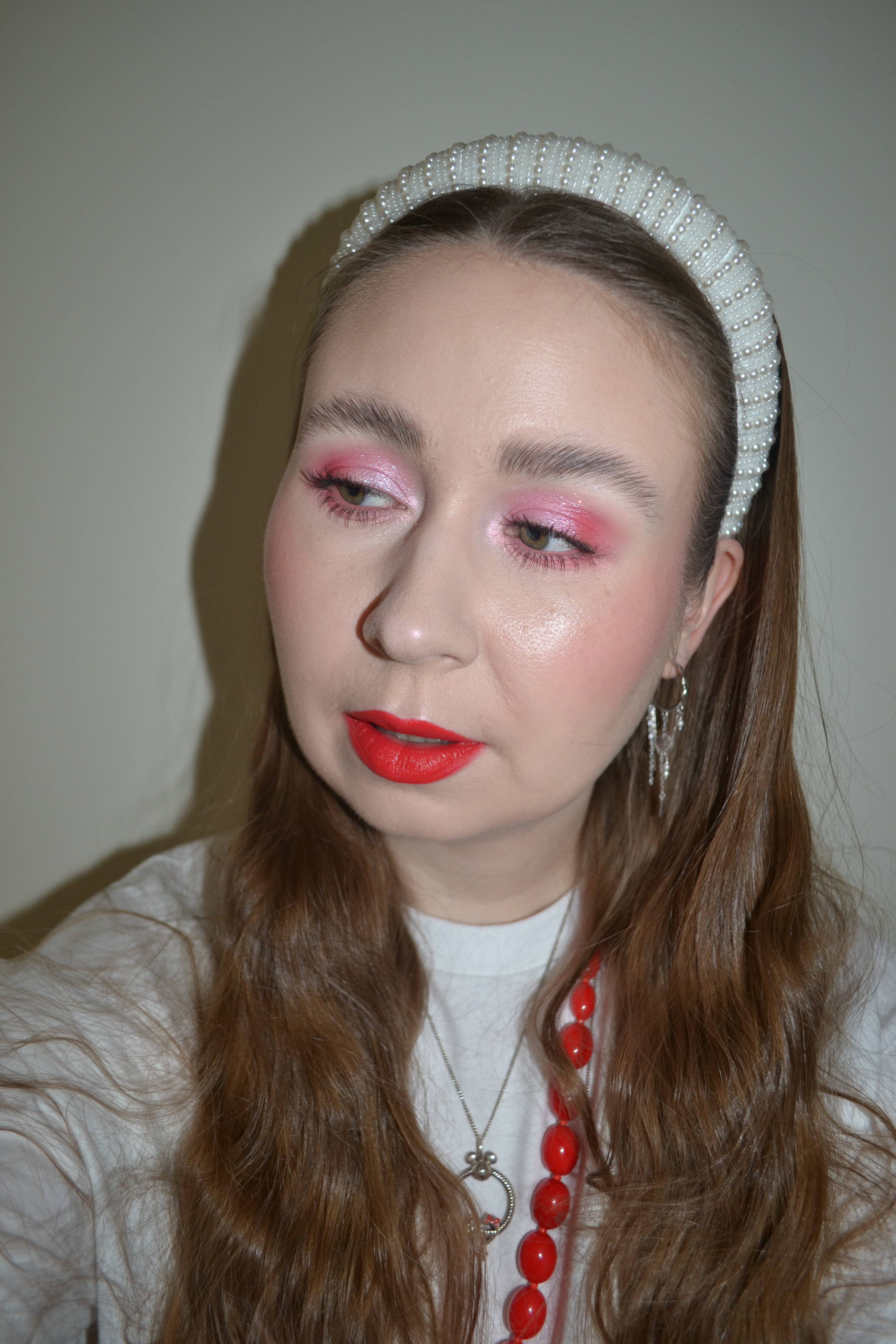 Here’s the make-up I wore with this outfit. I used one of my go-to pink and red eyeshadow palettes, the Colourpop Flirty Talk palette, to create this soft pink and red eye look.