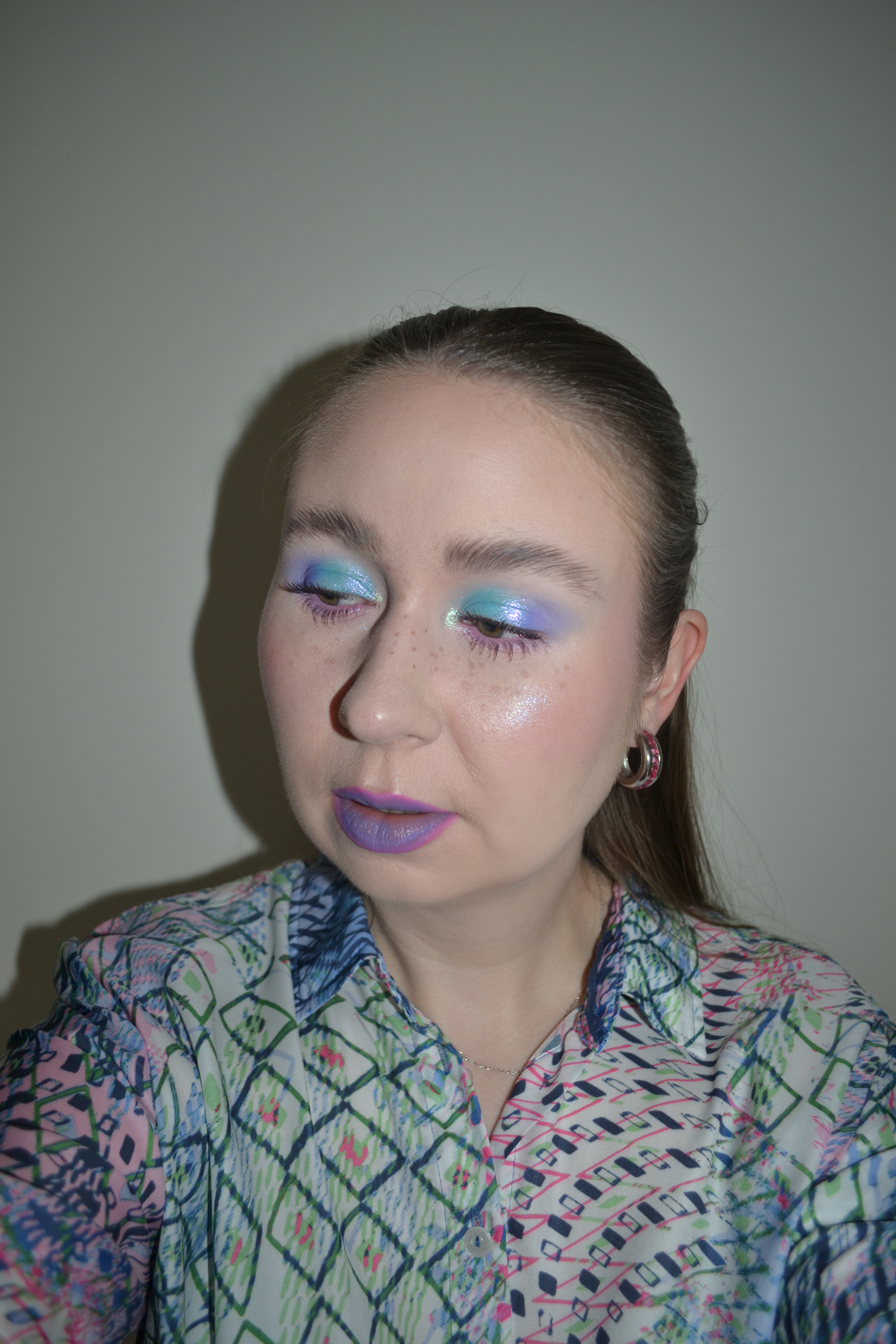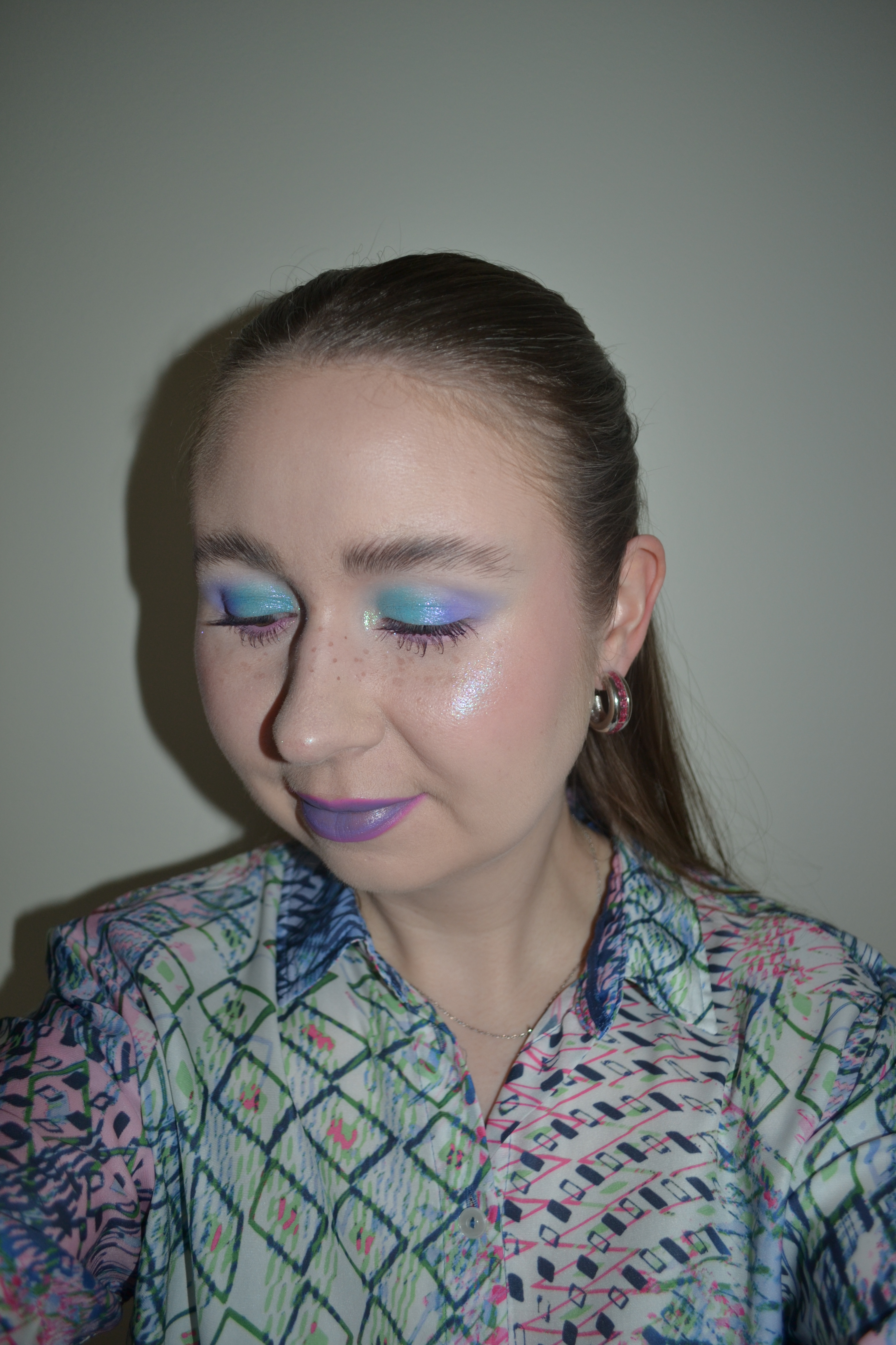 (Base: primer – Colourpop Pretty Fresh Set It Up primer, foundation – e.l.f. Cosmetics Soft Glam satin foundation (shade: 13 Fair Neutral), concealers – e.l.f. Cosmetics Putty Color-Correcting Eye Brightener (shade: Fair) + Huda Beauty #FAUXFILTER Luminous Matte liquid concealer (shade: 1.3G Marshmellow), powders – Essence Flawless Skin Trio loose setting powder in 10 + Glamlite Translucent Bake and Set powder, freckles – Nabla Freckle Maker. Face make-up: bronzer – Glam Shop Z Fioletem bronzer in Chocolate, blush – Lethal Cosmetics x Adventure Time Princess Bubblegum blush, highlighter – Lethal Cosmetics x Adventure Time Lady Rainicorn highlighter. Eye make-up: base – GlossGods Cosmetics That Base! Crease killer eyeshadow base, eyeshadows – Lethal Cosmetics x Adventure Time Candy Kingdom palette (shades: Marshmallow Kids + Pup Gang + Gumball Guardian + Cotton Candy Forest + Gumdrop + Candy Elemental + Candy Cane Guy), mascara – Maybelline Lash Sensational Sky High mascara (shade: Plum Twilight), eyeliner – Colourpop BFF Crème gel liner in Amethyst Hour. Eyebrows: MAC Shape + Shade brow tint in Taupe + Anastasia Beverly Hills Brow Freeze. Lips: Morphe x Nyane Color pencil in Pitaya Pink + MAC Macximal Sleek satin lipstick in Tilted Denim)