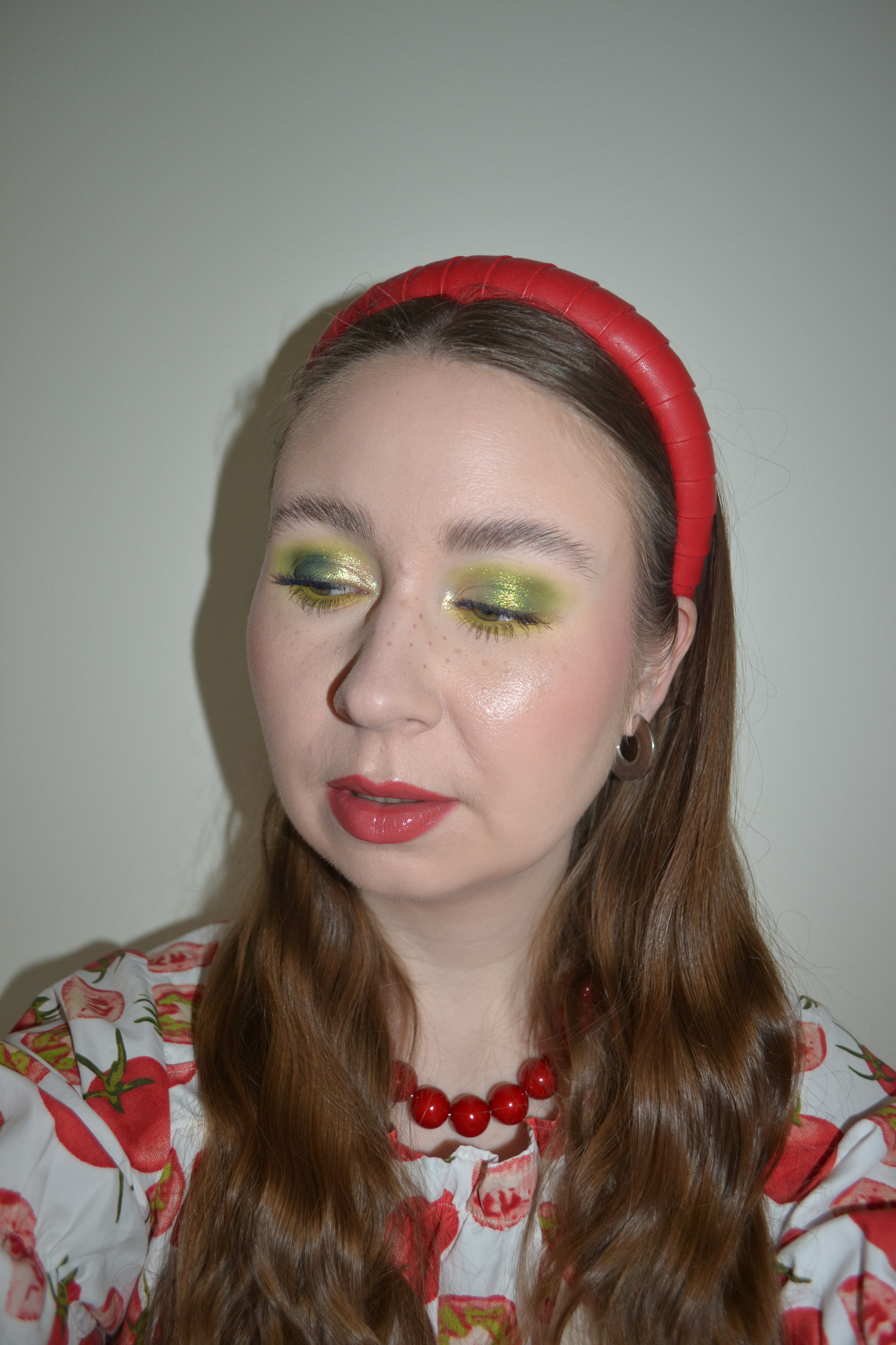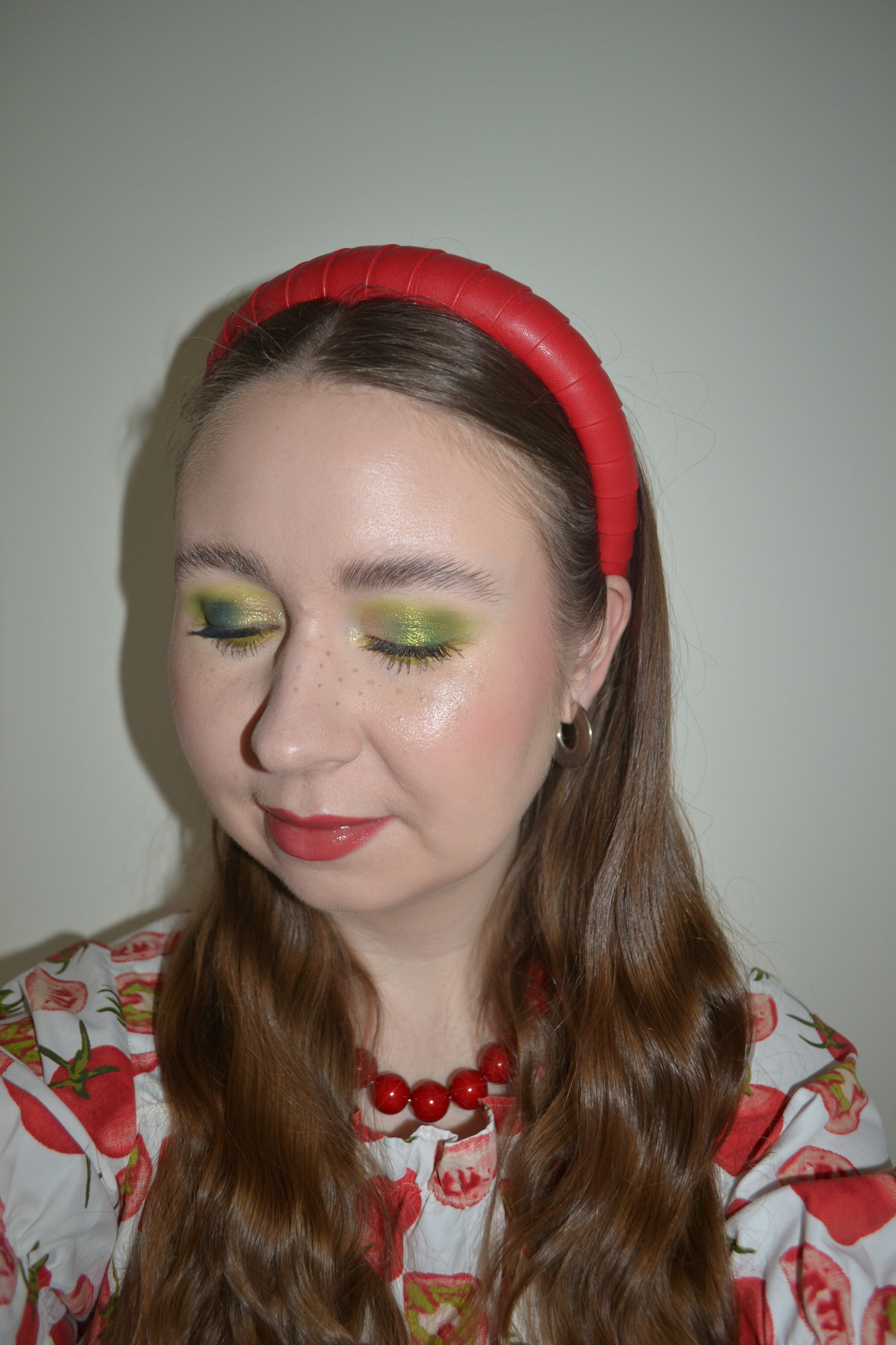 Here’s the make-up I wore with this outfit. I love a lime green eye look; it always makes me so happy.