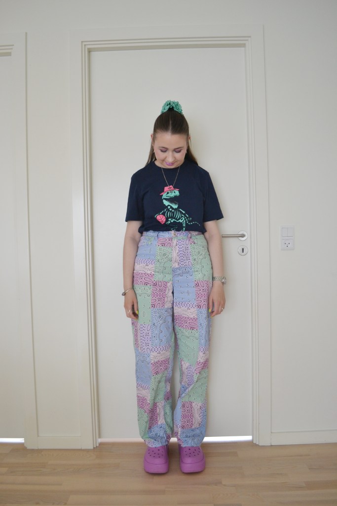 T. rex and trousers Posted on August 22, 2025 by Mucha-Lucha Here’s what I wore Tuesday June 24. I don’t remember ever wearing this T. rex T-shirt with these trousers before, but I think they look really good together. (T-shirt – Adidas Originals, trousers – H&M, shoes – Crocs) Share this: Click to share on X (Opens in new window) X Click to share on Facebook (Opens in new window) Facebook Like Loading... Related