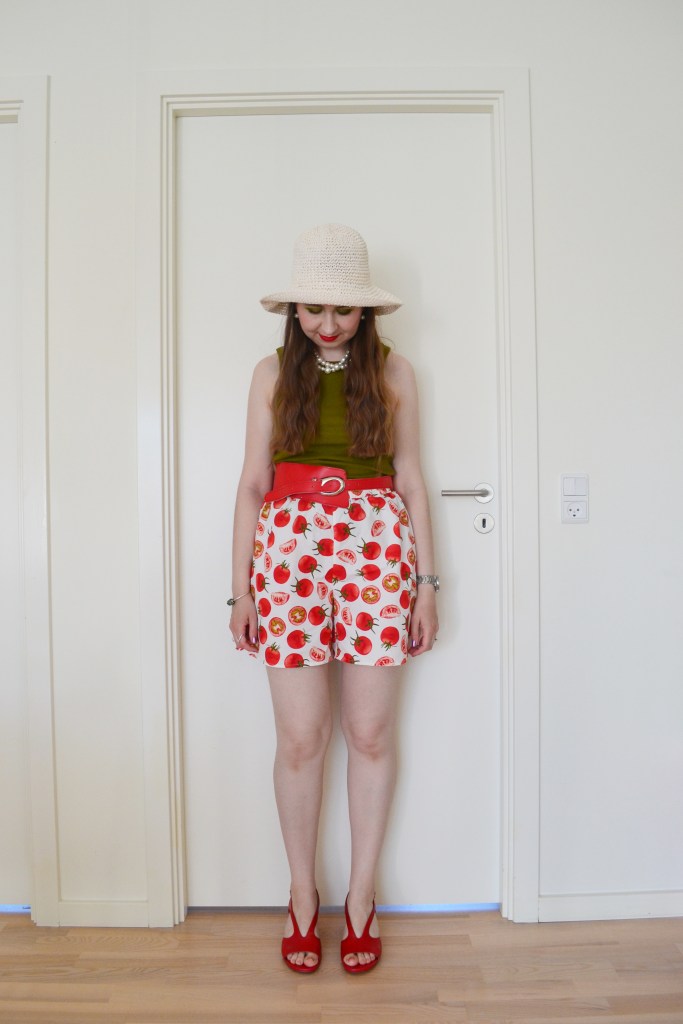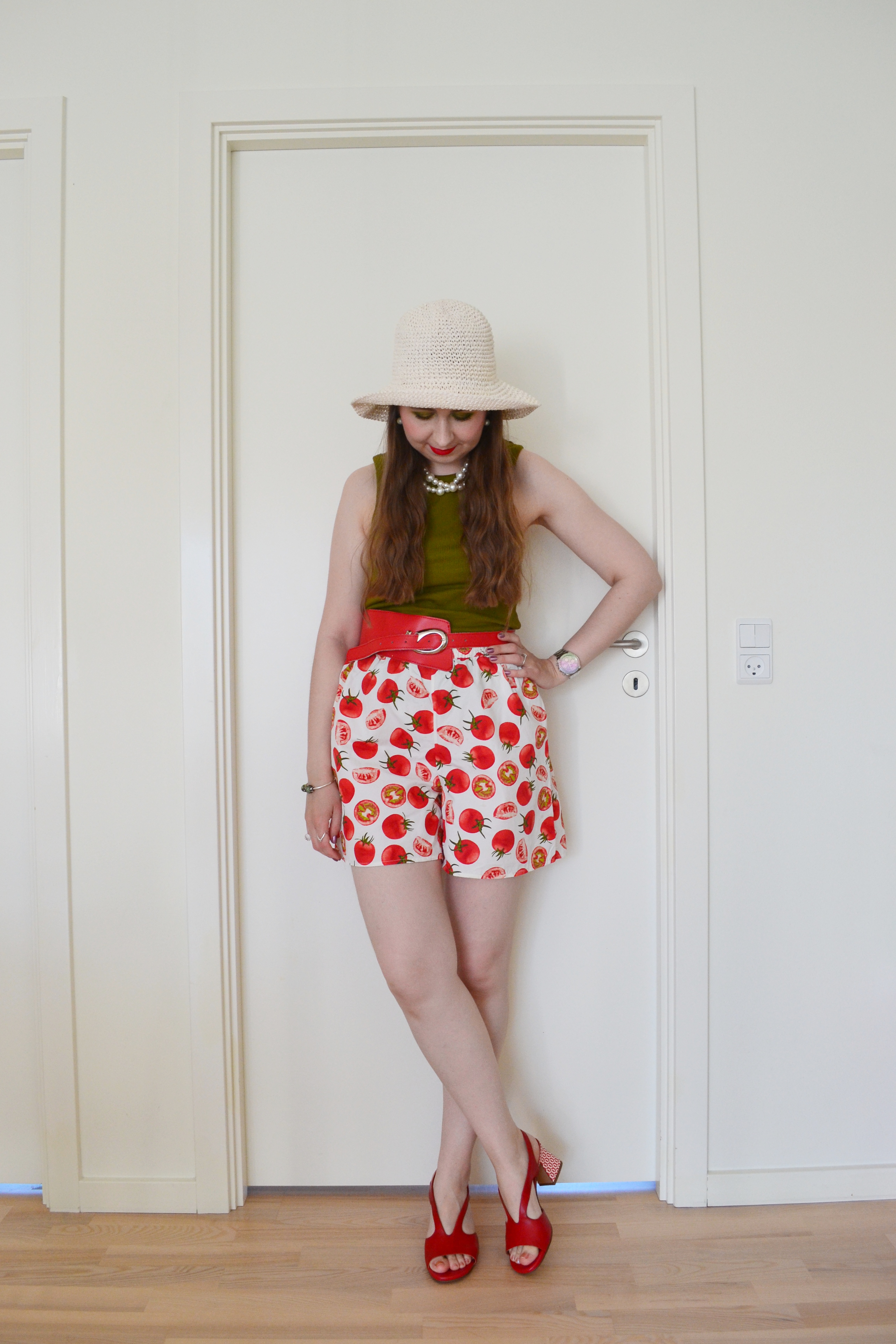 (Hat + top – H&M, belt – second hand, shorts – Pieces, heels – Tamaris)