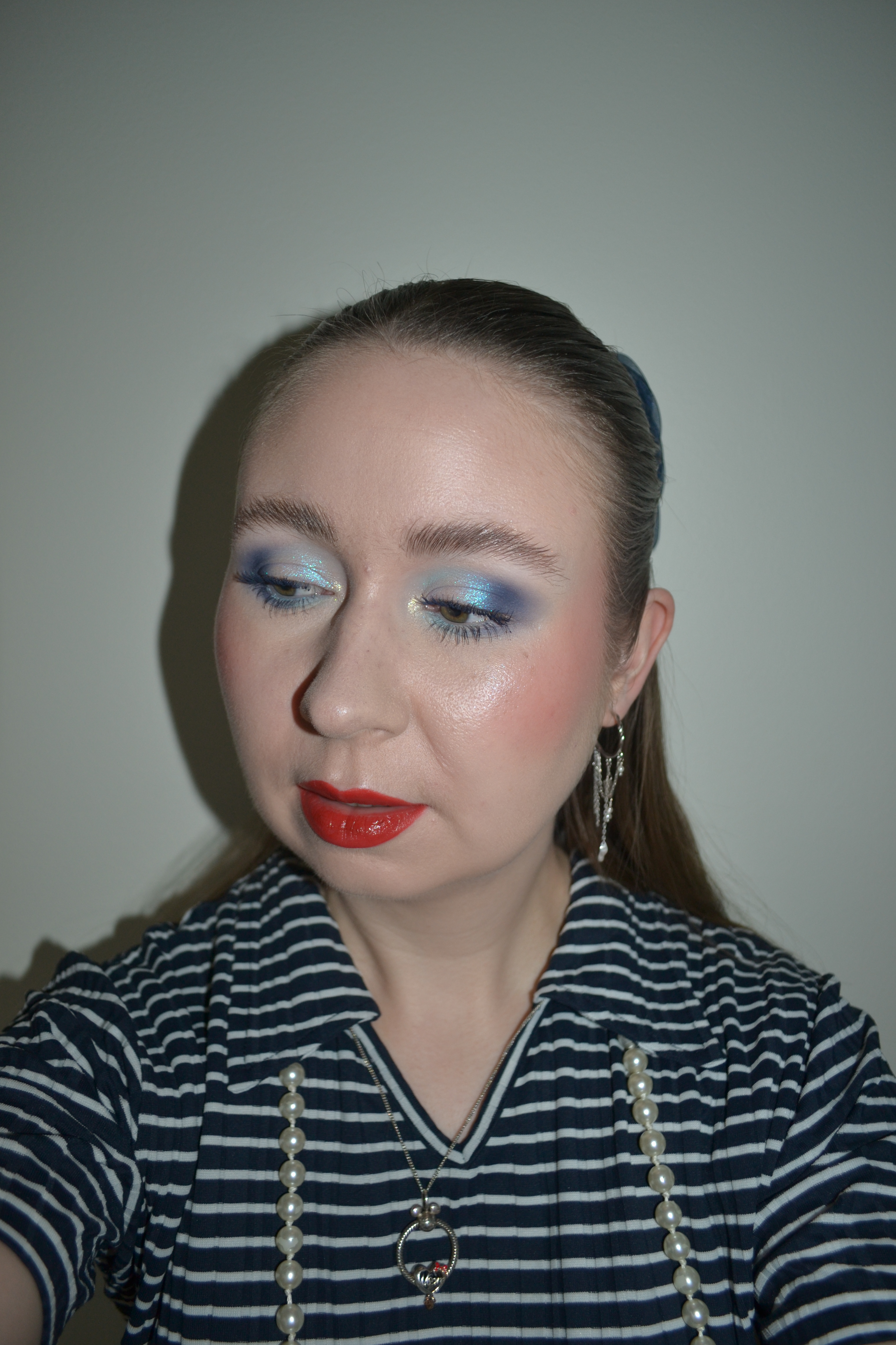 (Base: primers – Colourpop Pretty Fresh Set It Up primer + Rare Beauty Always An Optimist illuminating primer, foundation – Colourpop Pretty Fresh tinted foundation balm (shades: Fair 1 + Fair 3), concealer – L’Oréal Infaillible More Than Concealer (shade: 322 Ivory), powders – Charlotte Tilbury Airbrush Brightening Flawless Finish powder (shade: Fair/Medium) + e.l.f. Cosmetics Halo Glow Powder Filter pressed powder (shade: Fair Neutral Cool), freckles – Essence Got A Crush On Apricots freckles pen (shade: 01 Après Apricots). Face make-up: bronzer – Too Faced Chocolate Soleil Melting Bronzing & Contour Stick in Chocolate Mousse, blush – Huda Beauty Liquid Blush Filter in Watermelon Pop, highlighter – Colourpop Super Shock highlighter in Honeymoon. Eye make-up: base – MAC Pro Longwear Paint Pot in Painterly, eyeshadows – Blend Bunny Cosmetics Machina palette (shades: Precision + AI + Circuit + Motherboard + Cyborg + Switch), mascara – Kiko Milano Smart Colour mascara in 07 Navy Blue, eyeliner – Oden’s Eye Solmåne gel liner in 010 Galaxy. Eyebrows: MAC Shape + Shade brow tint in Taupe + Anastasia Beverly Hills Brow Freeze. Lips: MAC Chili Rimmed lip pencil + MAC Lustreglass sheer-shine lipstick in Chili Popper)