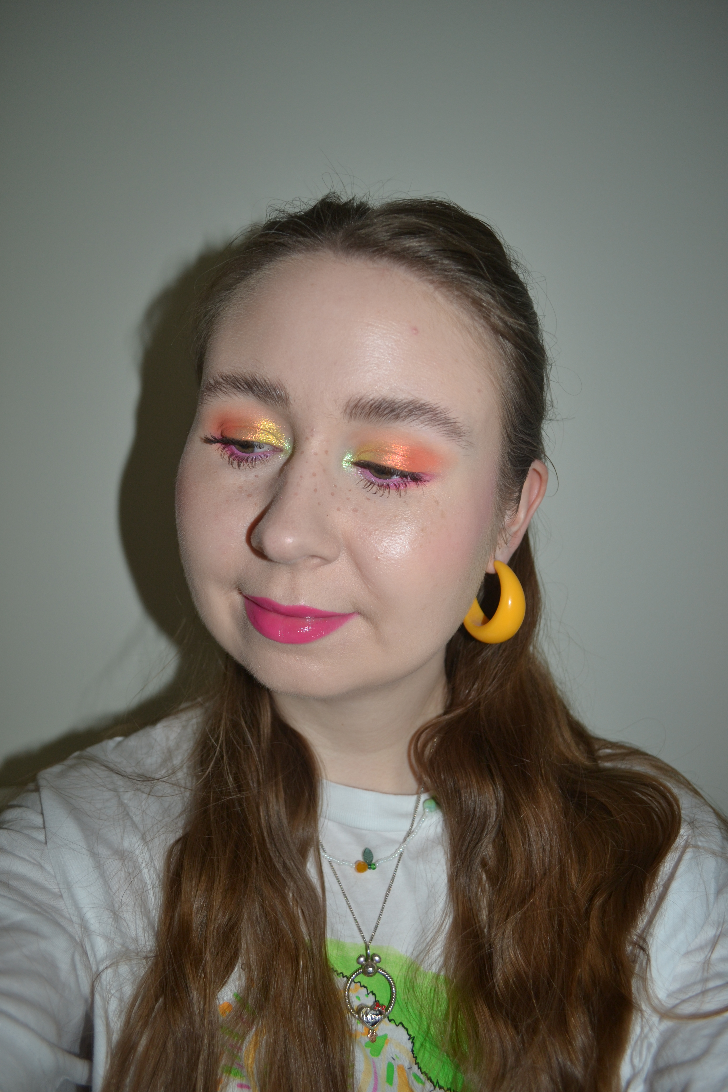 (Base: primer – e.l.f Cosmetics Power Grip primer, foundation – Rare Beauty Positive Light tinted moisturizer (shade: 14W), concealers – Rare Beauty Positive Light under eye brightener (shade: Light) + Danessa Myricks Beauty Yummy Skin Lift & Flex concealer (shade 2), powders – Essence Harley Quinn Pink loose setting powder in 01 Harley Vibes + Glamlite Translucent Bake and Set powder + Morphe Cloudlight Soft Glow Veil in Dawn, freckles – Nabla Freckle Maker. Face make-up: bronzer – KVD Beauty Good Apple bronze + sculpt balm duo in Fair 100 (shades: Sculpt + Bronze), blush – Essence Juicy Melon tinted lip & cheek balm, highlighter – GlossGods Cosmetics Multi-use Jelly Drip Stick in Drip Tease. Eye make-up: base – Wet n Wild Megalast eyeshadow primer, eyeshadows – Essence eyeshadow in 20 Cream + GlossGods Cosmetics Drippin’ palette (shades: Groovy Nectar + Amped AF + Tantrum Brby + Tangerave + Liquid Voltage + Chromadose + Electrocutie), mascara – Rimmel Kind & Free mascara (shade: 02 Brown Black), eyeliner – Catrice Who I Am double ended eye pencil in C01 I Am Art. Eyebrows: MAC Shape + Shade brow tint in Taupe + Anastasia Beverly Hills Brow Freeze. Lips: MAC Talking Points lip pencil + about-face Cherry Pick lip color butter in Dragonfruit Fusion)