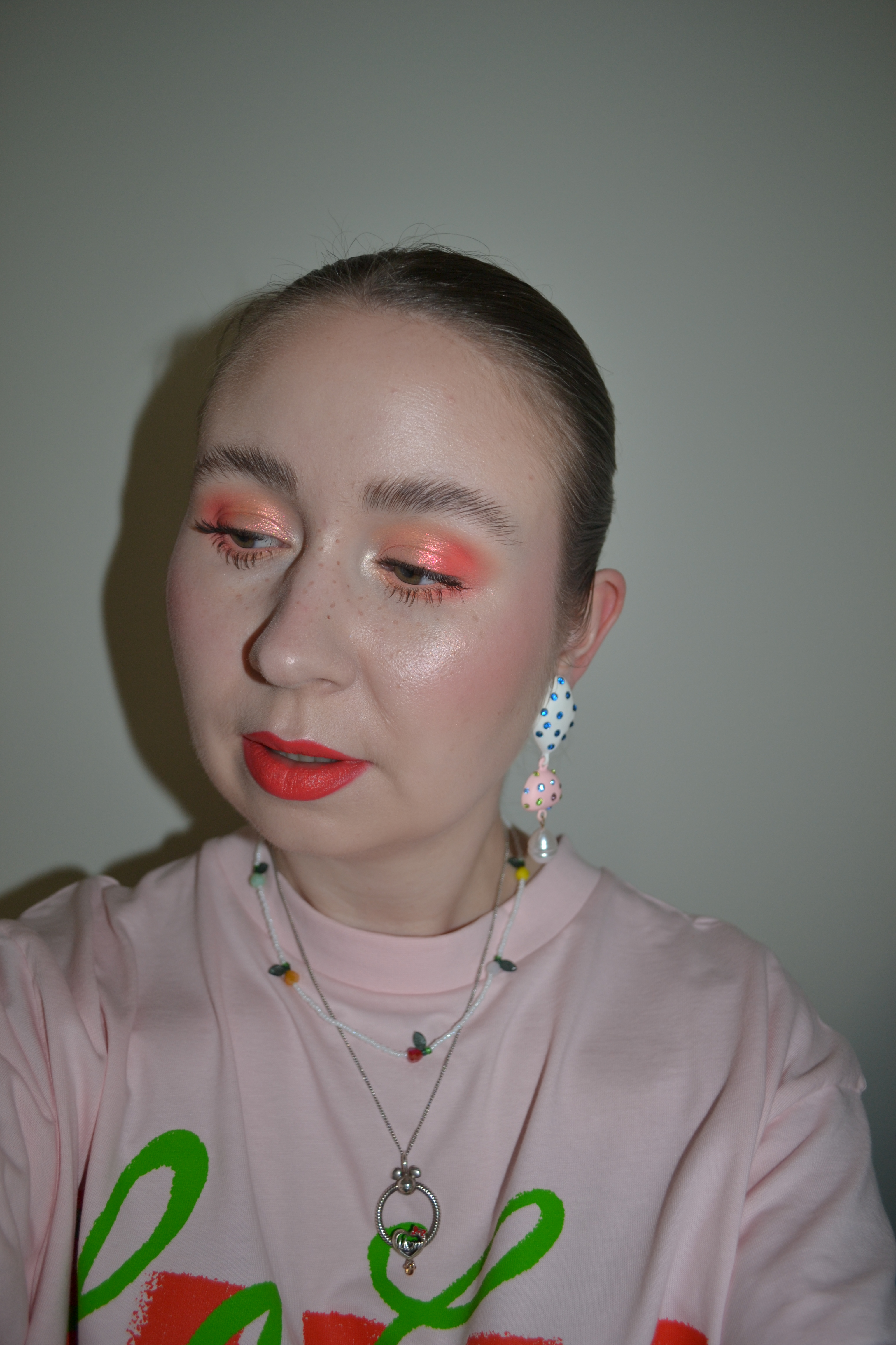 (Base: primer – e.l.f. Cosmetics Liquid Poreless Putty primer, foundation – Milk Makeup Hydro Grip gel tint (shade: 2), concealers – Smashbox x Becca Under Eye Brightening Corrector in Fair/Light + Morphe Wakeup Artist under eye correcting concealer in Ivory 3N, powder – e.l.f. Cosmetics Halo Glow setting powder in Light, freckles – Nabla Freckle Maker. Face make-up: bronzer – Catrice Bronze Away to… baked bronzing & highlighting palette in C01 Costa Rica (bronzer shade), blush – Sephora Collection Colorful Blush Glaze in 02 Morning Blaze, highlighter – Oden’s Eye Solmåne Moonlight Feel highlighter in H103 Warm Sunshine. Eye make-up: base – MAC Pro Longwear Paint Pot in Painterly, eyeshadows – Essence eyeshadow in 20 Cream + GlossGods Cosmetics Sizzlin’ palette (shades: Sunstroke + Sticky Situation + Too Lit to Quit + Thirst Trap) + Oden’s Eye Solmåne Moonlight Feel highlighter in H103 Warm Sunshine (inner corners), mascara – Rimmel Kind & Free mascara (shade: 02 Brown Black), eyeliner – Colourpop BFF Crème gel liner in Peach Fuzz. Eyebrows: MAC Shape + Shade brow tint in Taupe + Anastasia Beverly Hills Brow Freeze. Lips: MAC Redd lip pencil + MAC Powder Kiss Velvet Blur Slim Stick in Hot Paprika)