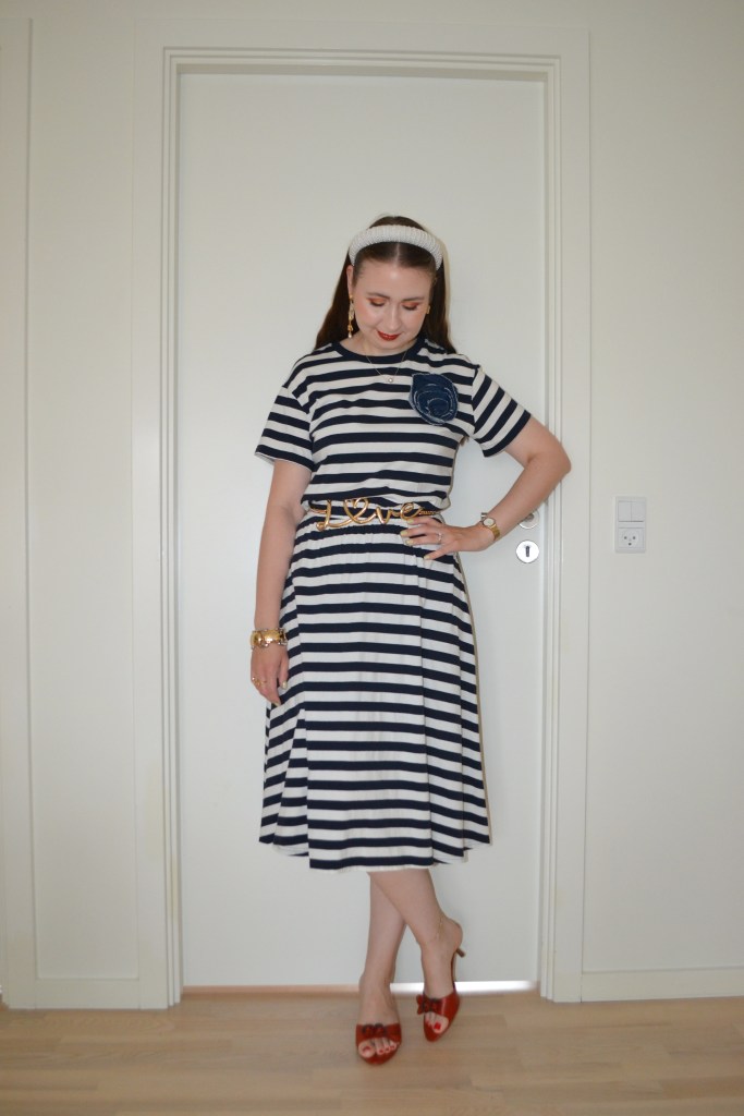 Here’s what I wore Monday August 4. I never know how to style this striped dress, so I end up not wearing it. Maybe it’s because it’s so simple. However, this time I was determined to wear it, and I really like how the look turned out.